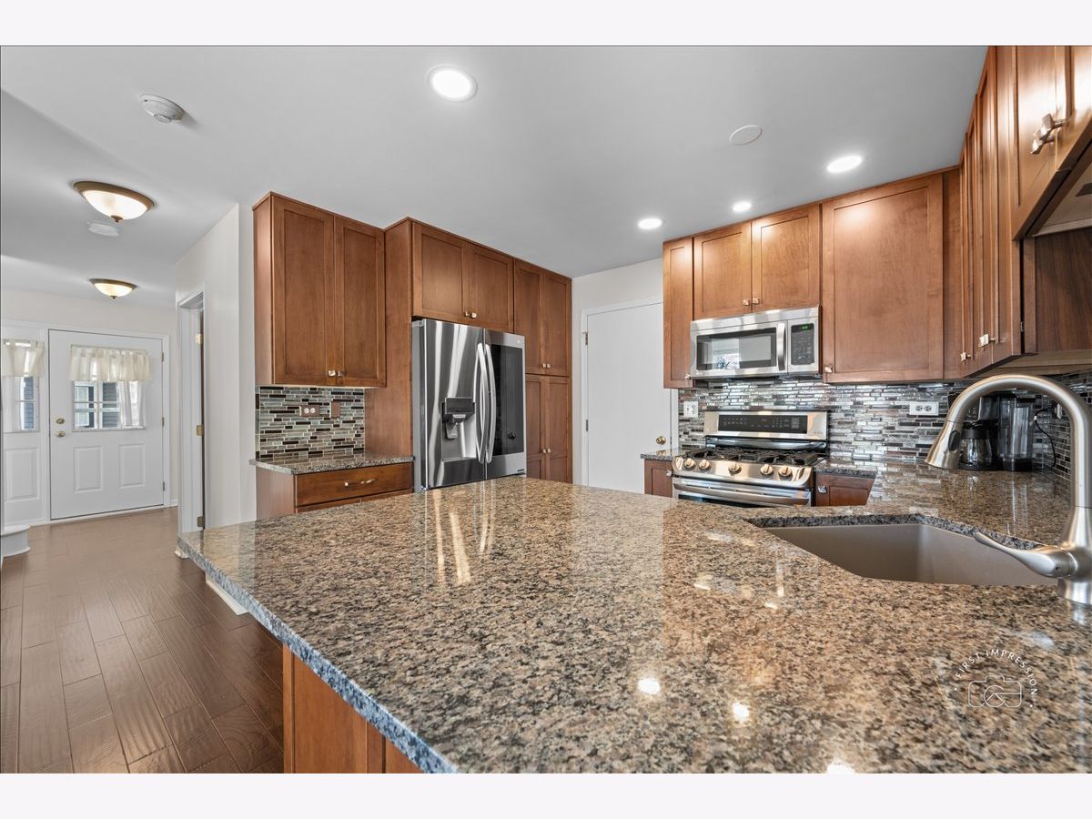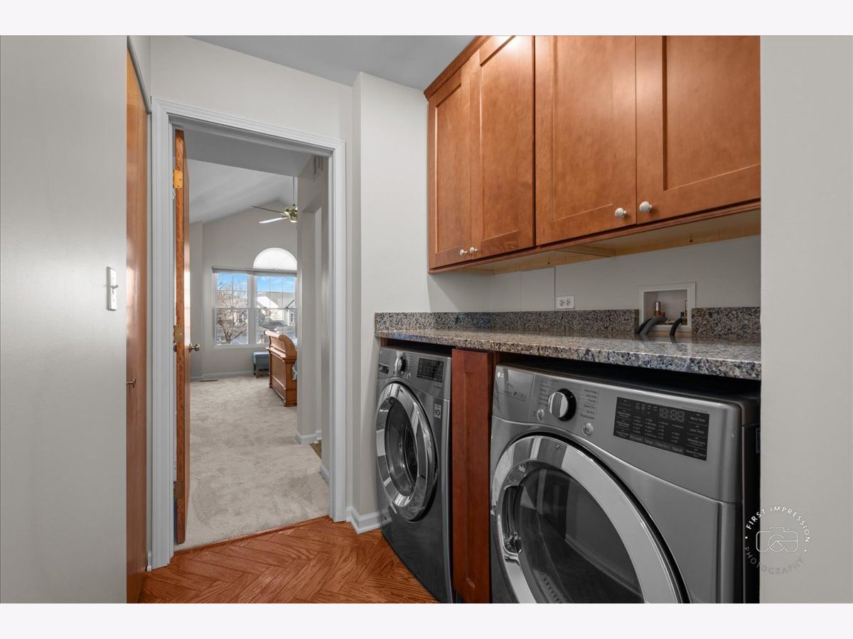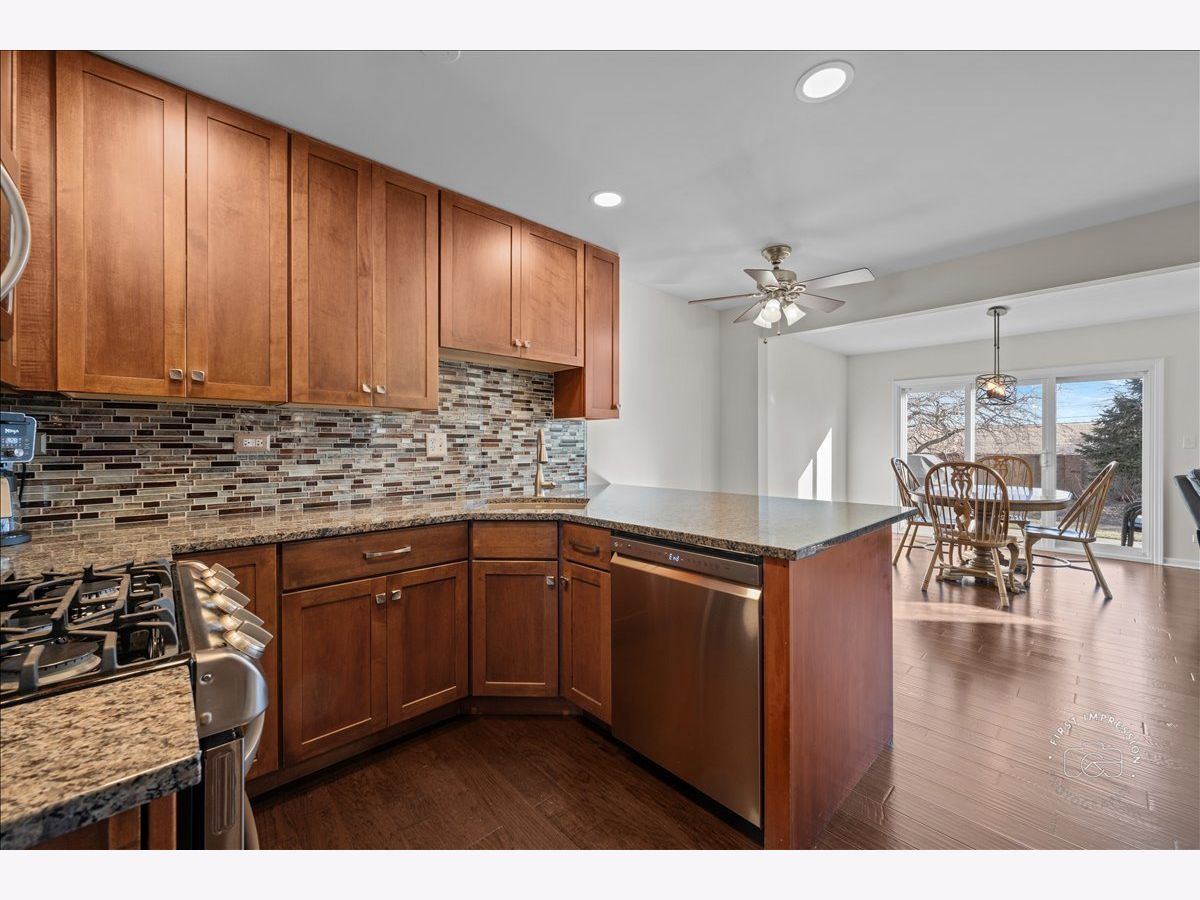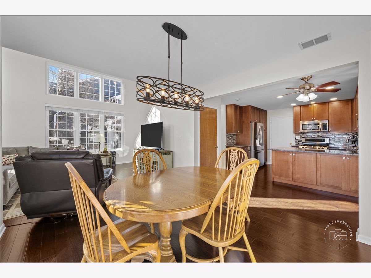 Beautiful distressed hardwood floors welcome you into this light and bright end unit home. The 2 story great room is highlighted with numerous windows and hardwood floors. The kitchen has been updated with new 42 inch soft close cabinets with many pull out shelves. stainless steel appliances, tile back splash, granite counters, breakfast bar and a walk in pantry. The dining area opens out to your private patio, A laundry station is conveniently located on the second floor has custom cabinets and a folding counter. A vaulted ceiling accents the primary bedroom suite. Plenty of storage in the primary bath with dual sink vanity, shower and linen closet. You will love the custom shelving in the walk in closet. The additional two bedrooms utilize the hall bath. This entire home has been freshly painted and new carpet in two bedrooms and the stairs in 2/2026. Other updates are new roof & siding in 2020, new hot water heater in 2020, all new windows in 2015, HVAC in 2009. Plenty of storage in the 2 car garage.