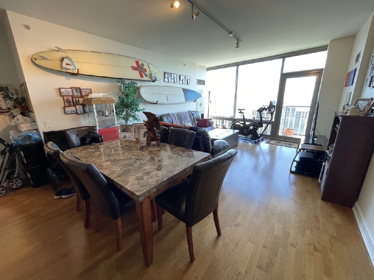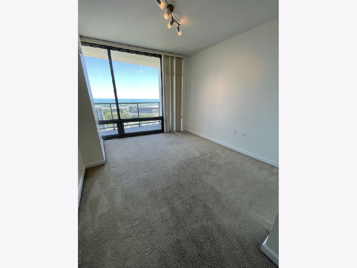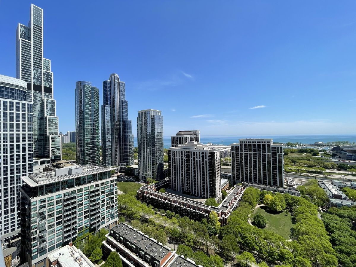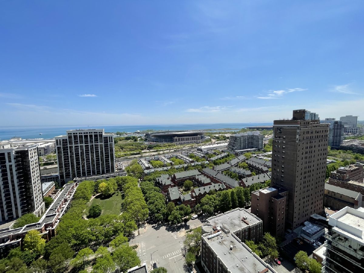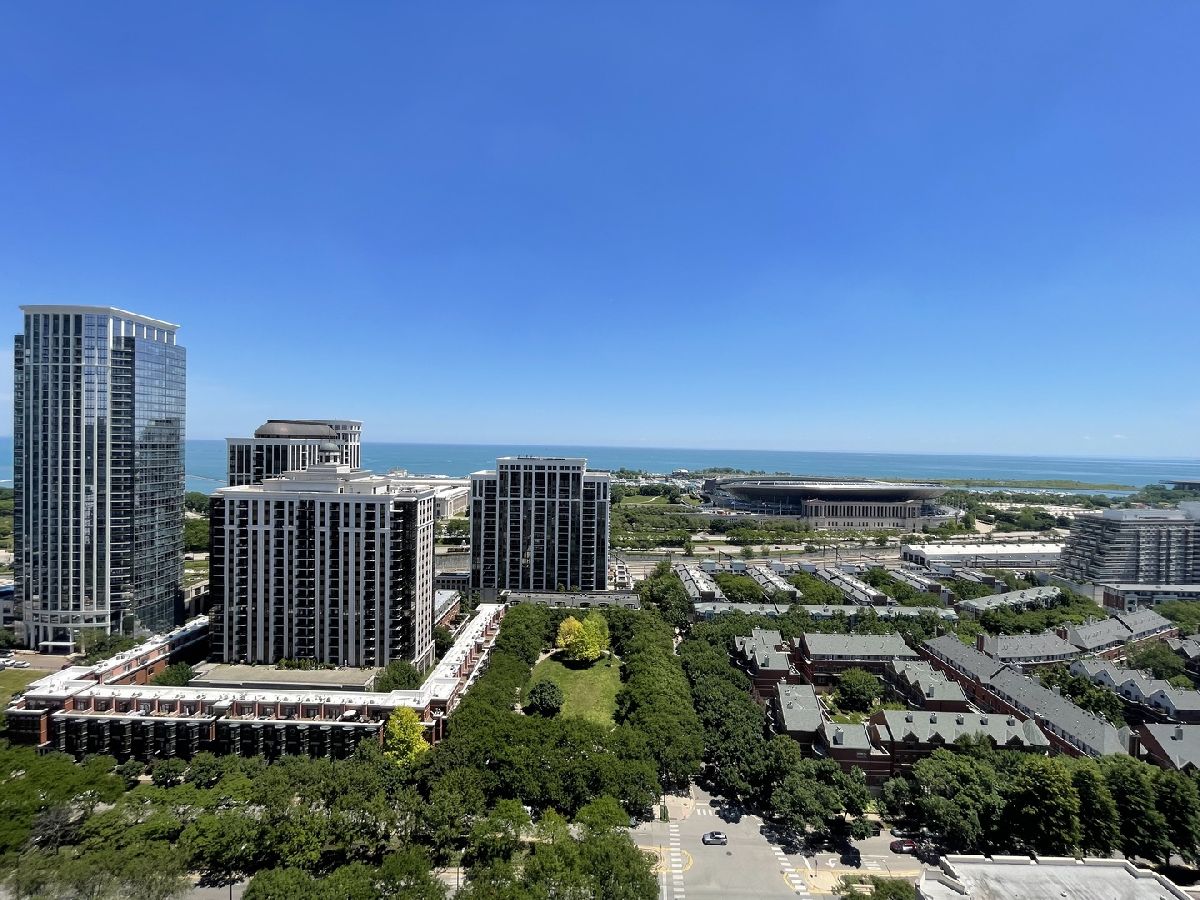 Stunning 25th floor East Facing Lake Views in a 2 bed 2 bath South Loop Condo. Hardwood Floors throughout the large open concept Living/Dining space. Inviting and wide entry way features the In Unit Washer/Dryer as well as a large front closet. The updated open kitchen is equipped with stainless steel appliances, including Dishwasher, Fridge, Double sided sink, Microwave and Oven Range. Ample Granite countertops offer plenty of space for food prep and room for table top appliances, as well as plenty of cabinet storage both above and below. Kitchen also features a long breakfast bar. Bright and Spacious Living/Dining room provides abundant space for a multitude of comfortable arrangements. The floor to ceiling windows look out onto a gorgeous view of the lake and Soldier Field, with a large balcony perfect for a grill and outdoor furniture to enjoy the gorgeous Chicago Summer. The first queen sized bedroom features floor to ceiling windows, overhead lighting and a large closet. Directly across from this bedroom is the first Full Bath, featuring a large vanity sink with counter space and undersink storage as well as tile flooring and tile surround shower/tub combo. Primary bedroom can fit a complete king sized bedroom set and is equipped with a massive walk in closet. The ensuite bathroom features a large dual vanity with a huge mirror and a spacious glass walk in shower. Additional den space provides the perfect spot for a work from home set up. Garage parking spot available for $200/month. Building features, Indoor Pool, Gym, Party Room and, 24 hour door staff. Don't miss out, come see this home today!