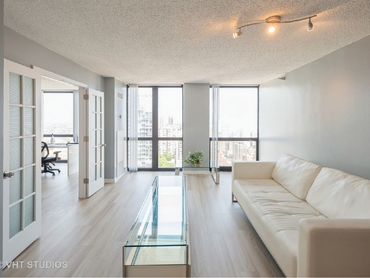 Furnished Rental Only. Prime Gold Coast/Old Town location. FLOOR TO CEILING WINDOWS ABUNDANT NATURAL LIGHT! LAKE VIEWS TOO! New Wood Laminate Floors, New Kitchen Cabinets and hardware, Freshly painted. New bathroom vanity & faucet. High floor unit 3705 with Stunning city and lake views. Lots of Light thru floor to ceiling windows. Large 1 bedroom 1 bath with abundant closets. Full Amenity condo building with 24/7 doorperson, outdoor pool, fitness center, laundry room, bike room, transportation nearby red brown cta trains and bus. Within minutes to the Lake and world class Michigan Avenue shopping & restaurants, Old Town Wells St shopping & restaurants. The red line Clark/Division train station and 22 Clark bus steps away. Monthly rent includes heat, AC, water, TV cable, Internet, outdoor pool sun deck fitness center. Available now. Furnished Rental only with beautiful white leather sofa all matching sleek modern furniture. Minimum 1 year lease.