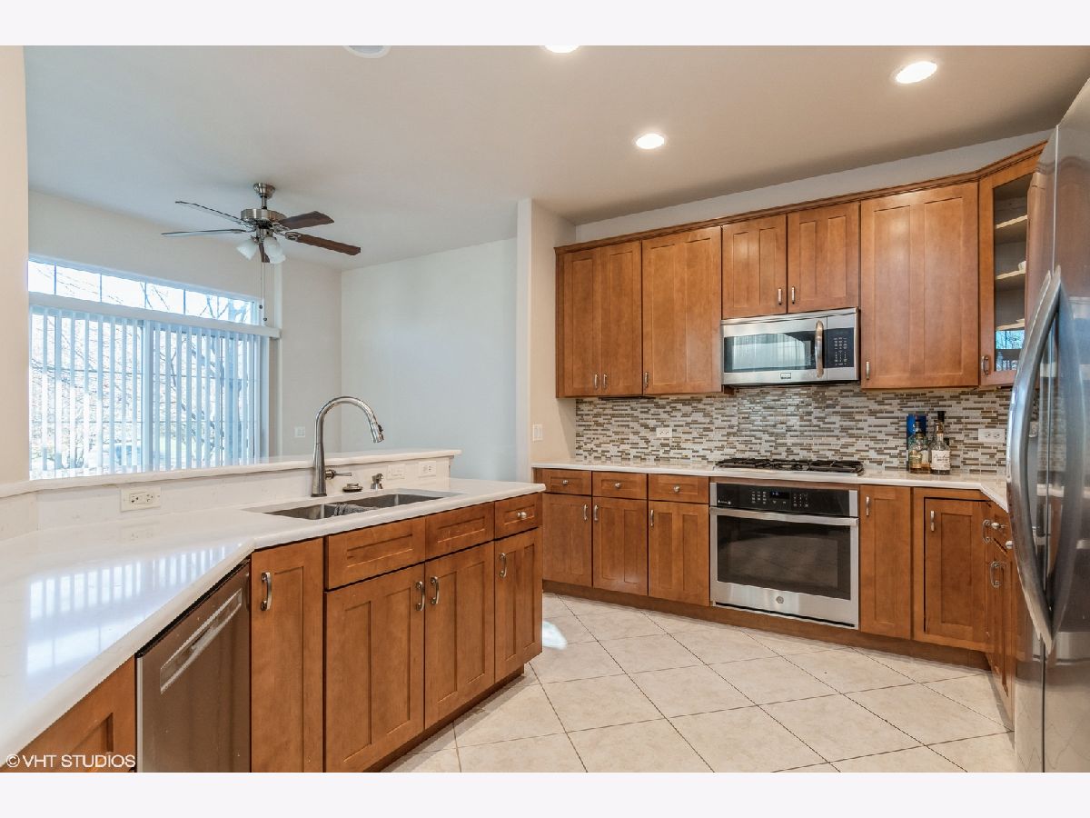 Impressive corner unit! 2 story family room with gas fireplace and view of the pond. Open concept kitchen offers 42" maple cabinets, quartz counters, beautiful backsplash, ceramic tile floor and stainless steel appliances with adjacent breakfast nook with plenty of space for a table. First floor office, ready to work from home. Formal Dining Room great for entertaining. Large primary bedroom features private bath with dual sink, soaking tub and separate shower. Finished basement great for recreation room/play area. Convenient first floor laundry. Enjoy the maintenance free lifestyle!