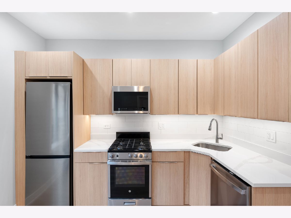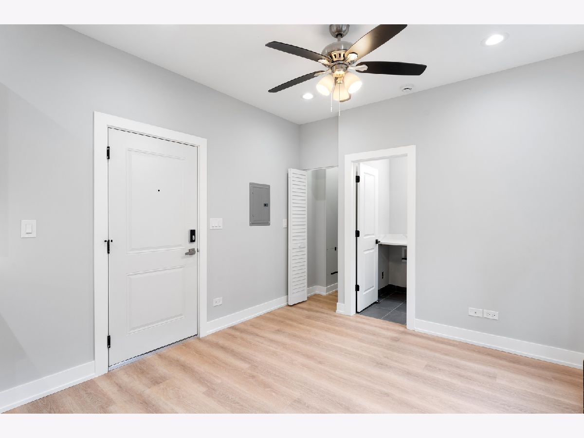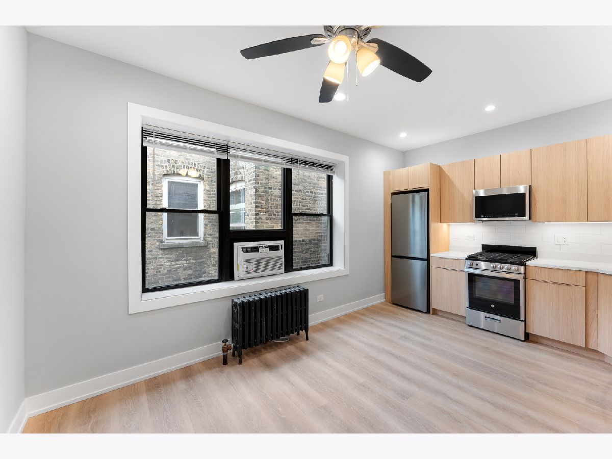 Modern Luxury Studio | Renovated Kitchen & In-Unit Washer/Dryer Stylish studio apartment in Chicago featuring a renovated bathroom with a shower stall and quartz countertops paired with a deep undermount sink. The kitchen showcases stainless steel appliances, designer cabinets, and modern finishes, while inunit laundry and an AC window unit add convenience. Additional touches include ceiling fans, a mirrored sliding closet door, Heat included in the rent, ButterflyMX video intercom system, and Xfinity internet included. Well-maintained and thoughtfully updated, this studio offers practical amenities for comfortable city living.