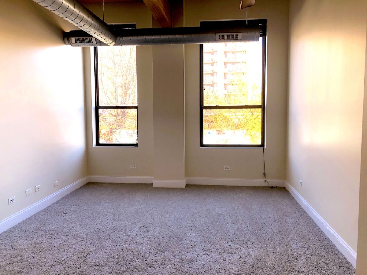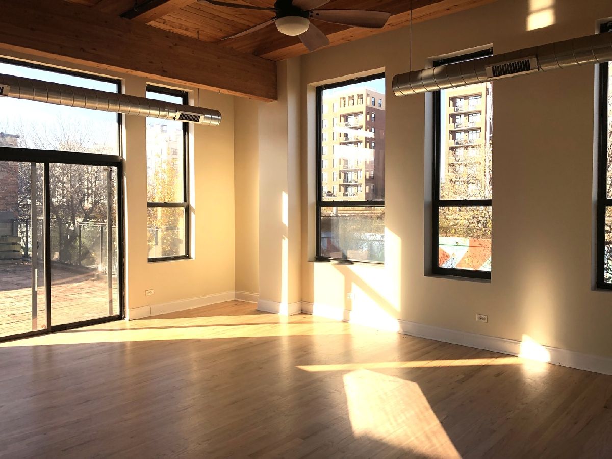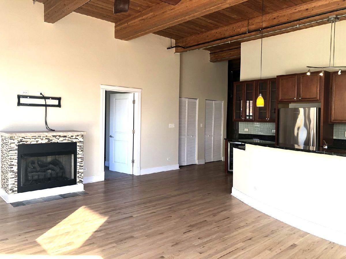 SO MUCH SPACE, both interior and exterior!! SECURE GARAGE PARKING INCLUDED! Great end unit loft in hip Pilsen, where the community & the arts are thriving. This rarely available, large, corner 2 bedroom/2 bath loft has its own massive 1000 sq ft PRIVATE terrace to enjoy.Terrace has sky & loop view and furnished with large growing tubs for your veggies & flowers. Enjoy the elevator in this newer built condo building., The unit really lives like a home. Enjoy the open concept space with fireplace and welcoming kitchen island with granite and beverage cooler - perfect for entertaining. Primary en-suite bedroom has new carpet, double-sinks, a walk-in shower AND tub. Desirable split floor plan has a 2nd bedroom with its own bath at the other end of the loft for privacy. Picture yourself entertaining, gardening, sunning and grilling on your private 1000 sq. ft. terrace with beautiful open air. This exposed timber loft home also boasts 12' ceilings, endless daylight from over-sized windows, fireplace, in-unit washer dryer, newly refinished hardwood floors, new bedroom carpeting, newly painted and SS appliances. All this plus a secured/heated/assigned garage parking space is included in rent! Minimum credit score of 700 required and monthly salary equal to 3 times the monthly rent. This could all be yours, but it won't last...