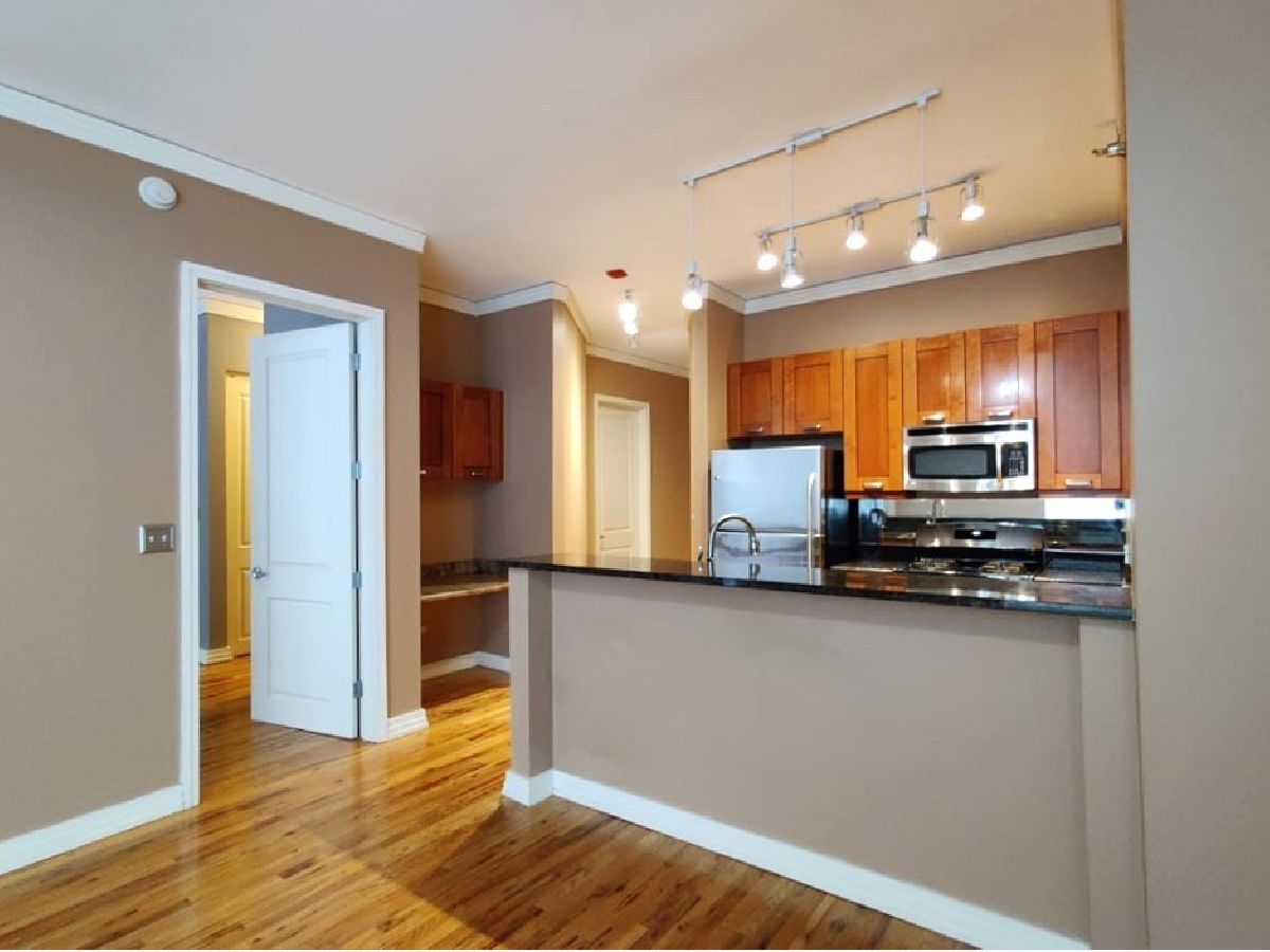 Spacious 1-bedroom corner unit featuring high-end finishes and a well-designed floor plan. Boasting 42" Cherry cabinets, granite countertops in both kitchen and baths, hardwood flooring, stainless steel appliances, and 10' ceilings. Enjoy the large balcony and the convenience of an in-unit washer/dryer, along with custom closet organizers. The bathroom offers a relaxing soaker tub and ceramic flooring. Rent includes heat, gas, A/C, water, internet access, and garbage disposal. Close proximity to CTA's and shopping centers. Please note that the provided pictures were taken before the current tenant's occupancy. Parking space is at an additional $200 alongside the rent.