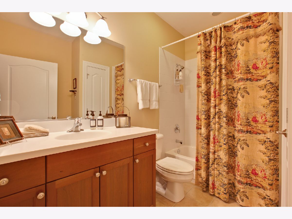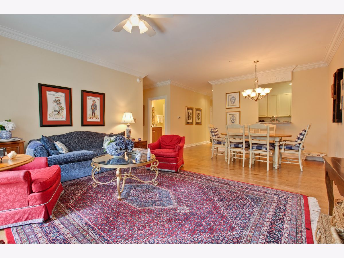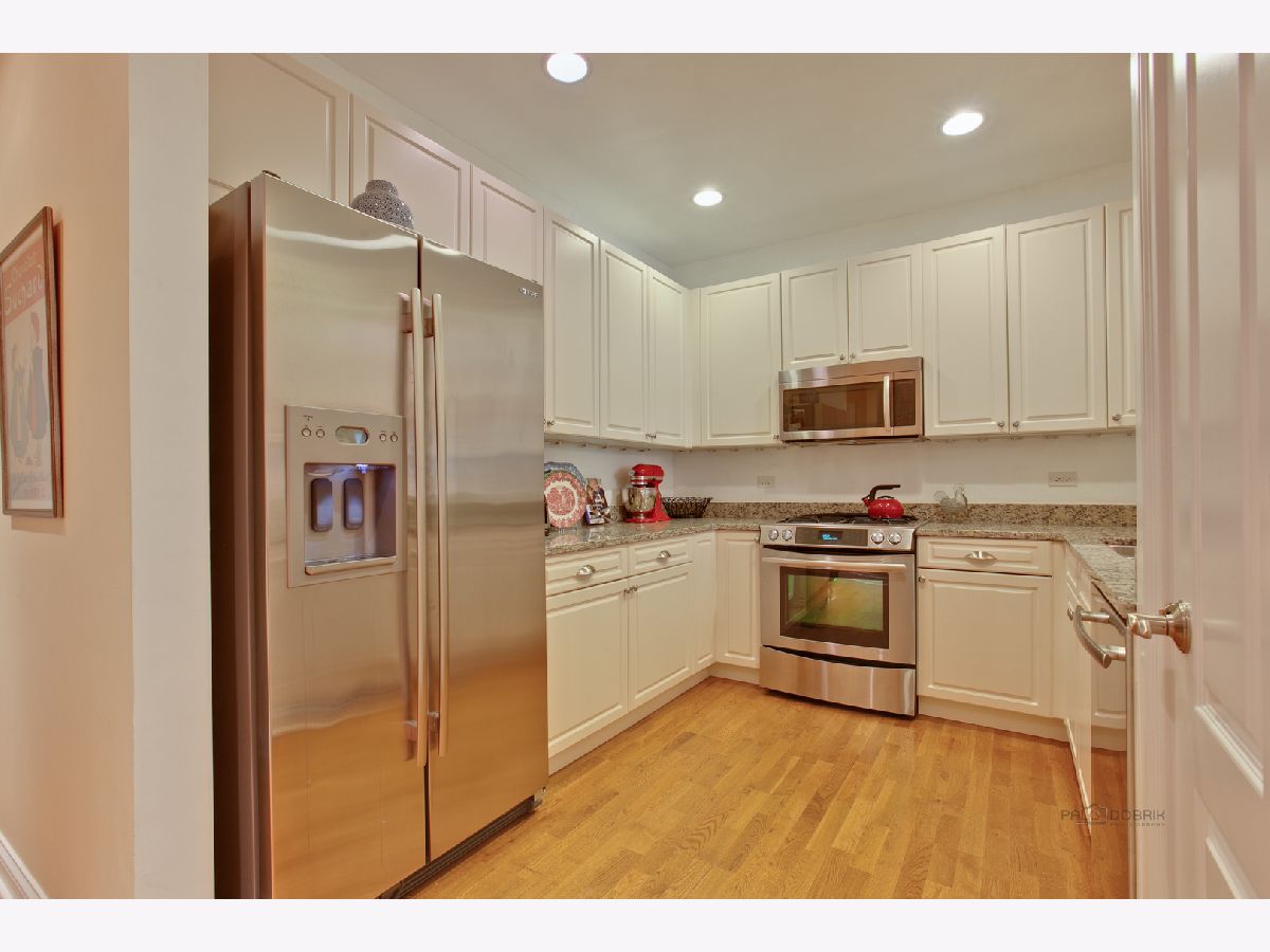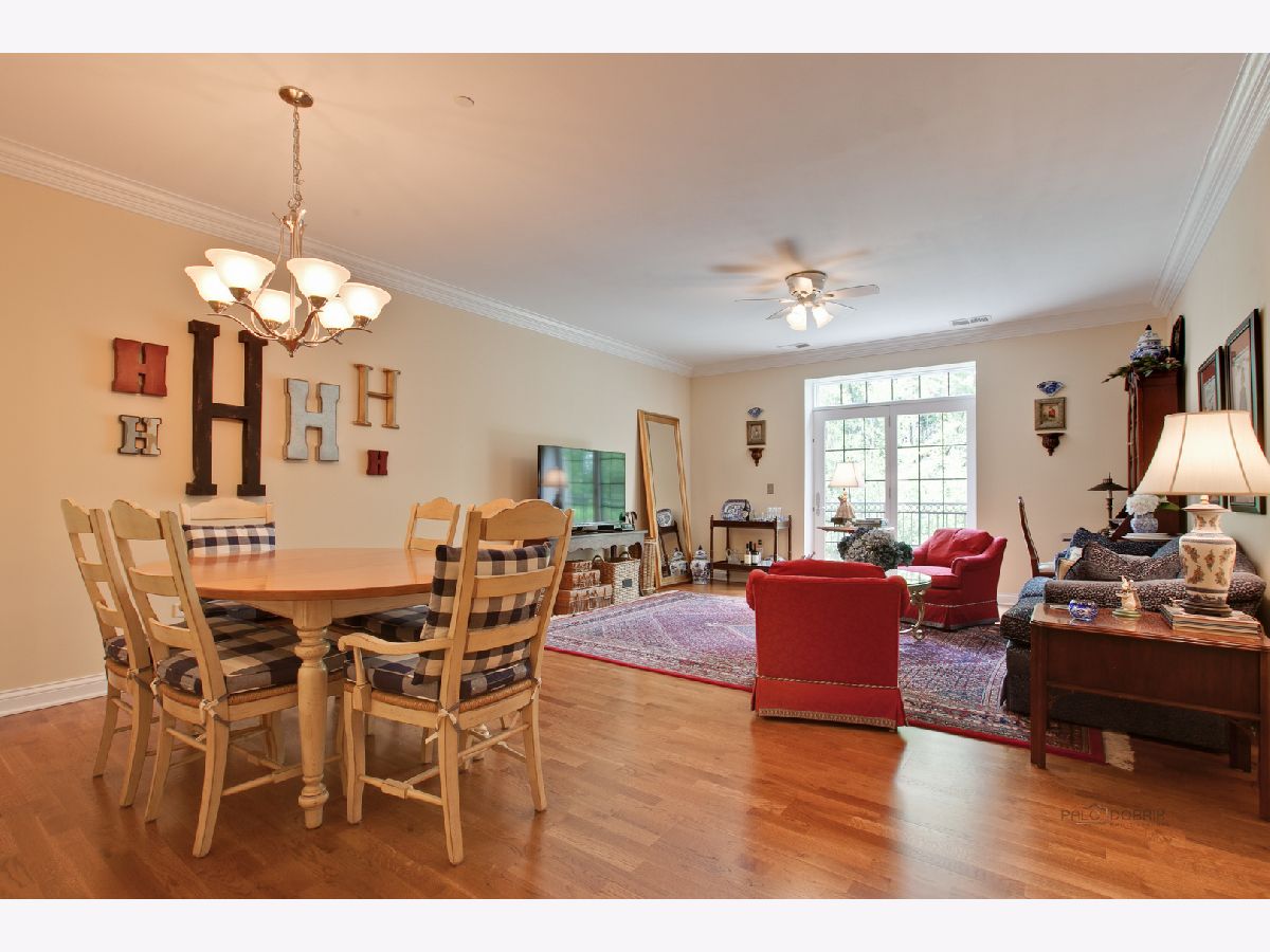 Enjoy luxurious first-floor living in the highly desirable Amberley Woods. Stately English Manor architecture nestled among a serene setting welcome you to this sophisticated and upgraded 2 bedroom, 2 bathroom condo. Stunning white kitchen with granite countertops opens to inviting living room with private patio overlooking trees and pond. Spacious master suite includes a large walk-in closet, master bathroom with separate tub/shower and double vanity. Hardwood floors, 10 foot ceilings, 2 tandem heated garage spaces, and storage. Convenient to commuter train, restaurants, shops, tollway, and O'Hare.
