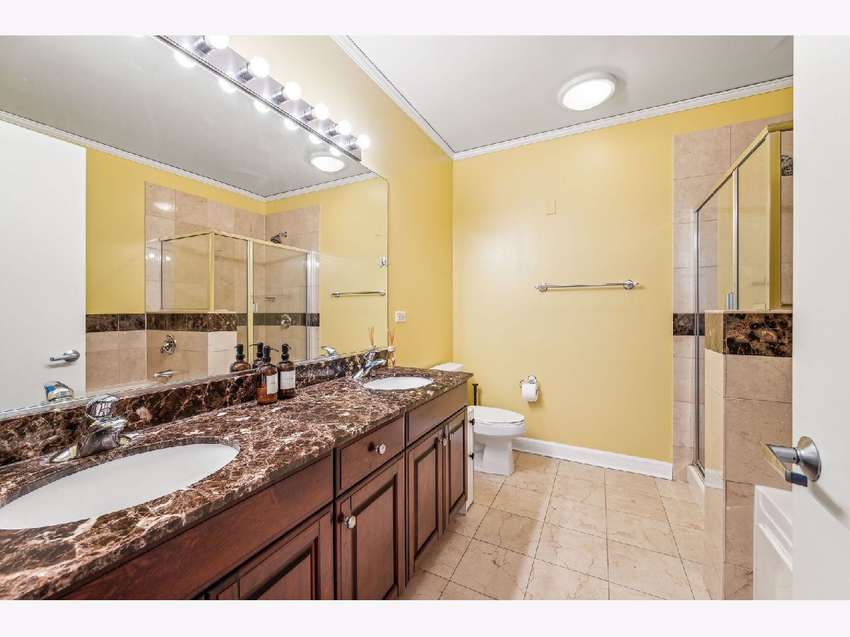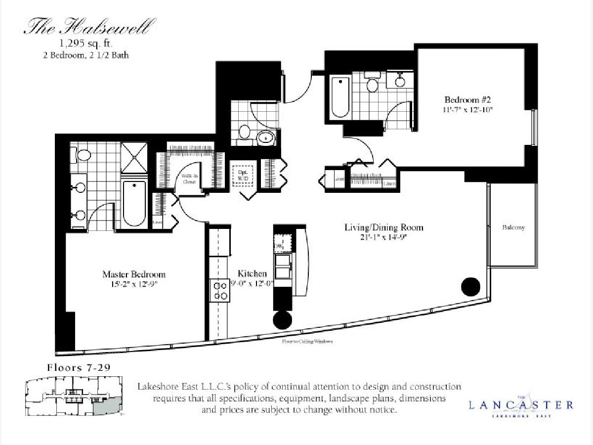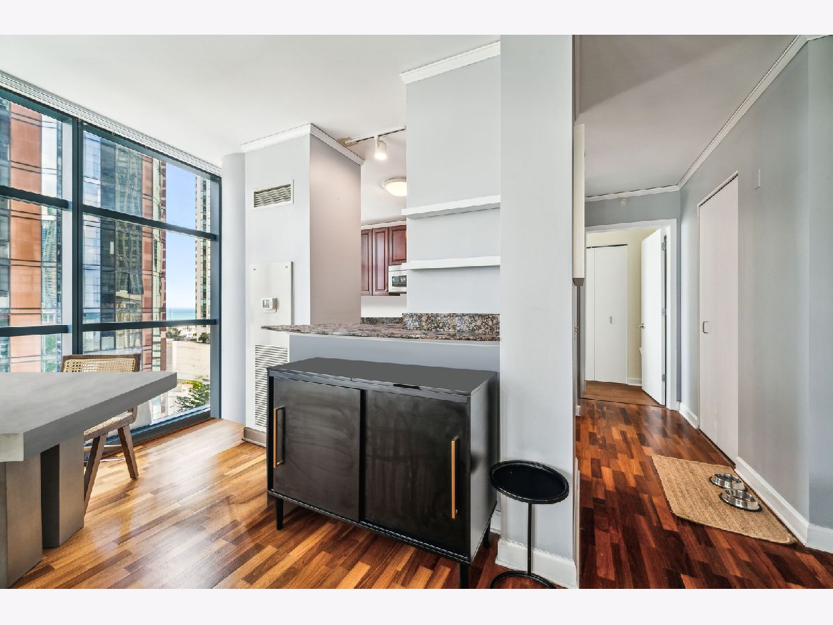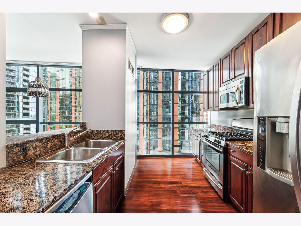 Superb location make this stylish split 2bdr/2.5bth a great deal. Steps from Mill Park, loop, lake & shopping. Fantastic floor plan with windows in kitchen, cherry hrdwd flrs, master bath w/ separate shower, en-suite 2nd bth, organized closets, w/d & balcony. The Lancaster walks out to 6 acre park with grocery and dining options all around. One of the best sundecks in the city with lounge furniture, landscaping, lighting, grills and music. 2500 s.f. fitness center includes boxing bag and two Peloton bikes. 24 hour door staff to help with carts, deliveries and packages. Close to Loop, Lake, Shopping and Parks but lives like a gated community. One parking space included