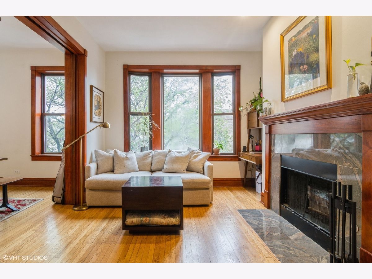 Nestled off Damen Ave, this top floor condo has large windows filling the space with natural light. Lovely vintage detail w/original vintage brass hardware, original trim & details, over 7' wide original pocket doors, All original wood trim restored & refinished, Hardwood flrs refinished thru-out, entire unit painted- including all ceilings, New LED lighting thru-out, West Elm light fixtures, Nest thermostat, new wood blinds, wood-burning fireplace w/gas starter & marble surround, New closet systems w/hanging, shelves & drawers, Professionally designed fully renovated kitchen w/two-tone kitchen cabinetry, Carrara marble countertops, Large single-basin Kohler stainless steel sink, Grohe faucet, Professional-grade stainless steel appliances, convection microwave, 5 burner range w/cast-iron griddle, Fisher Paykel refrigerator, Bosch dishwasher w/custom cabinet panel. Pellet grill for grilling needs. Common roof deck w/skyline views! Parking Included.