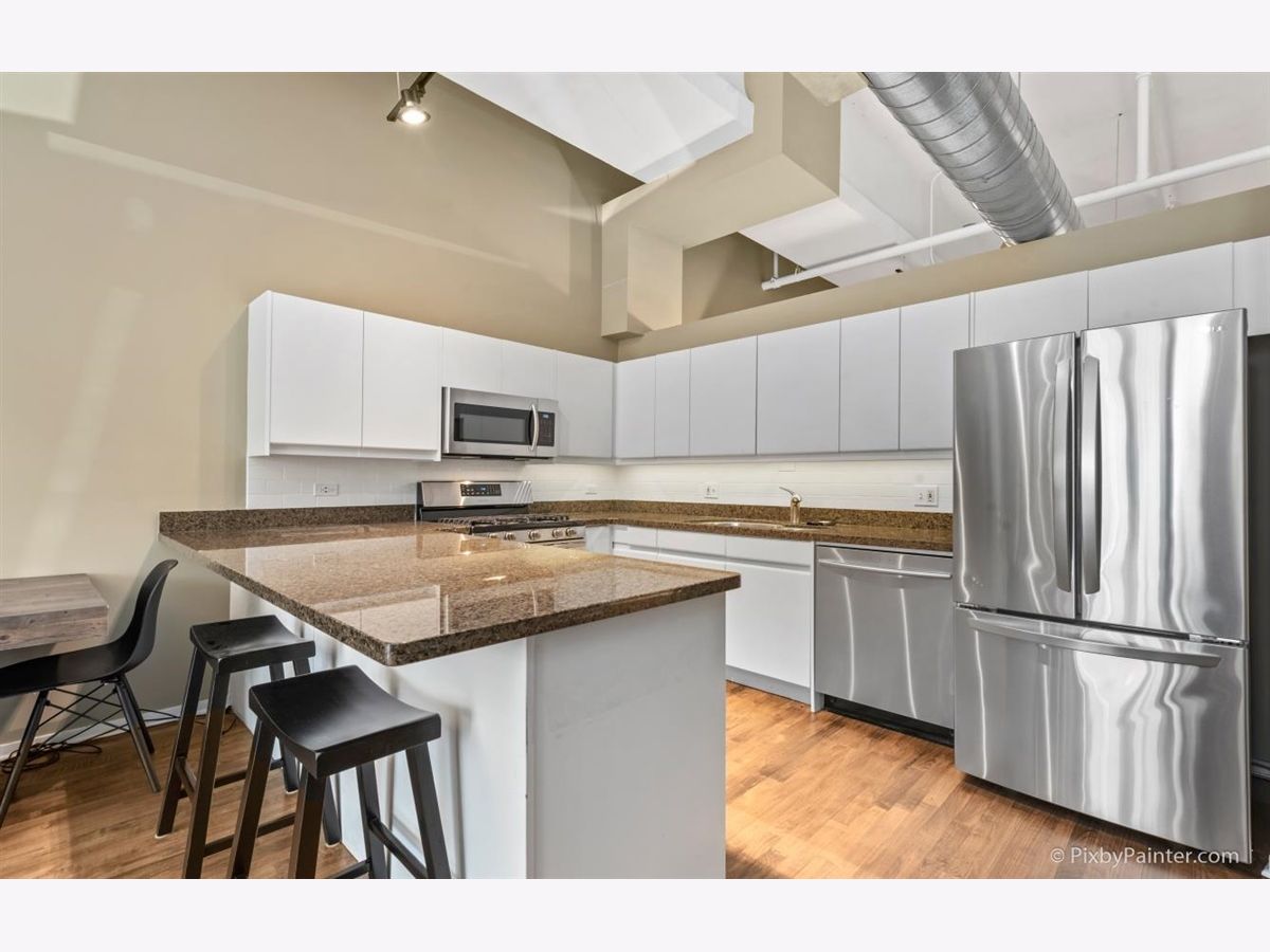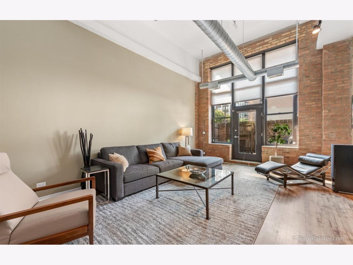 Gorgeous one bedroom loft, with 16 foot ceilings, in a fantastic West Loop location. The nearly 11 foot windows let in plenty of light to fill the spacious unit. A private gated patio opens directly to the unit's parking space, for convenience. This sunny, immaculate unit includes new bathroom upgrades with double vanity sinks, new bedroom carpet, in unit washer/dryer, gas fireplace, granite countertops with subway tile backsplash, stainless steel appliances, and plenty of closet space to go along with an additional storage space just outside the front door of the unit. The building features a gym, gated parking lot and is located across the street from beautiful Mary Bartleme park, plus all of the excellent dining and entertainment options the West Loop has to offer. Convenient location for access to the El, metra, and highways. PARKING SPACE INCLUDED IN PRICE!