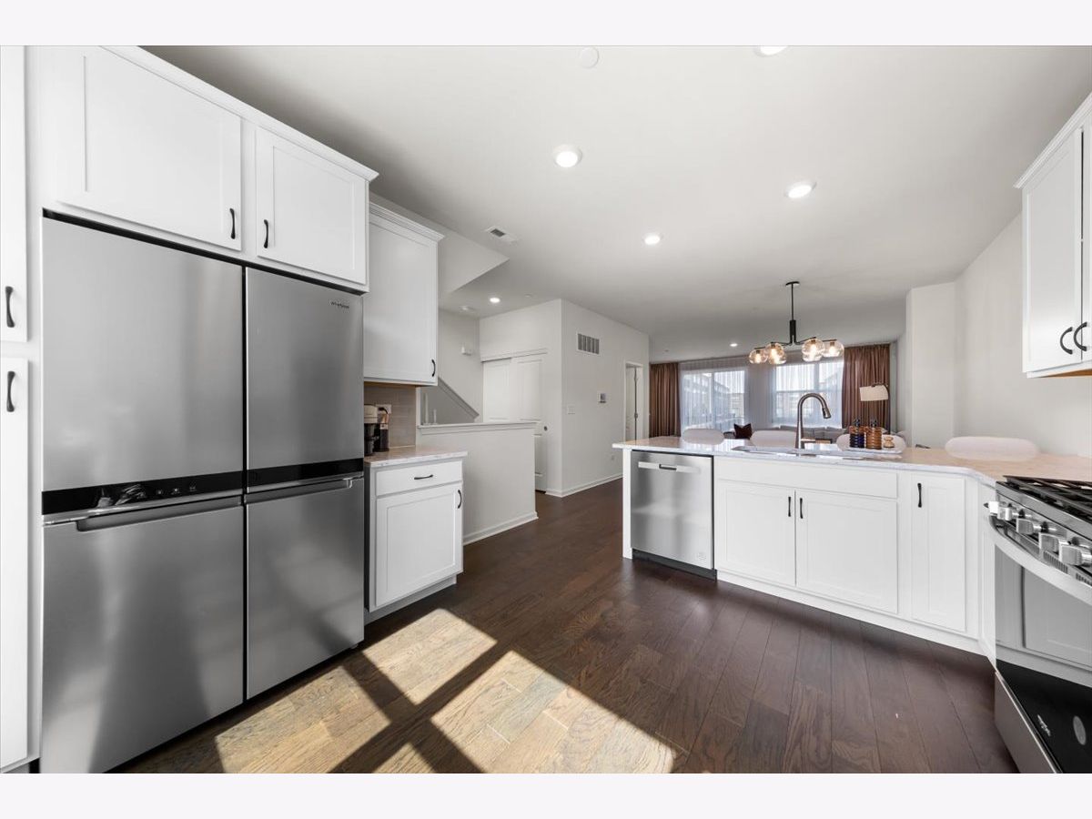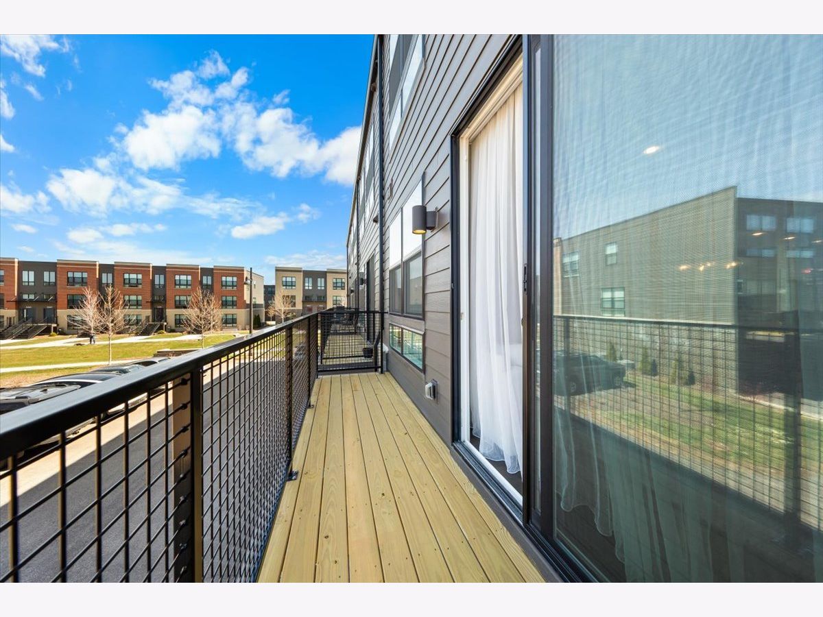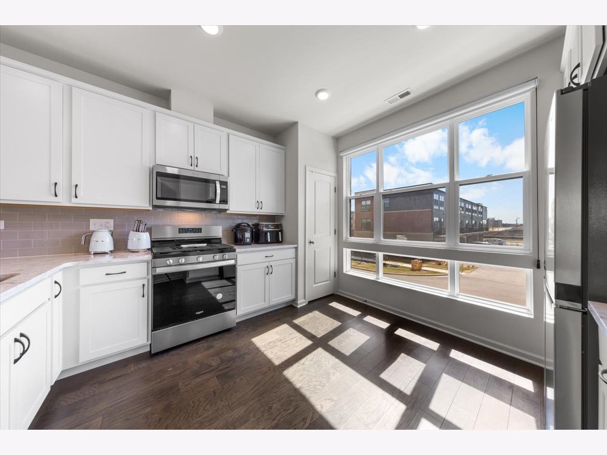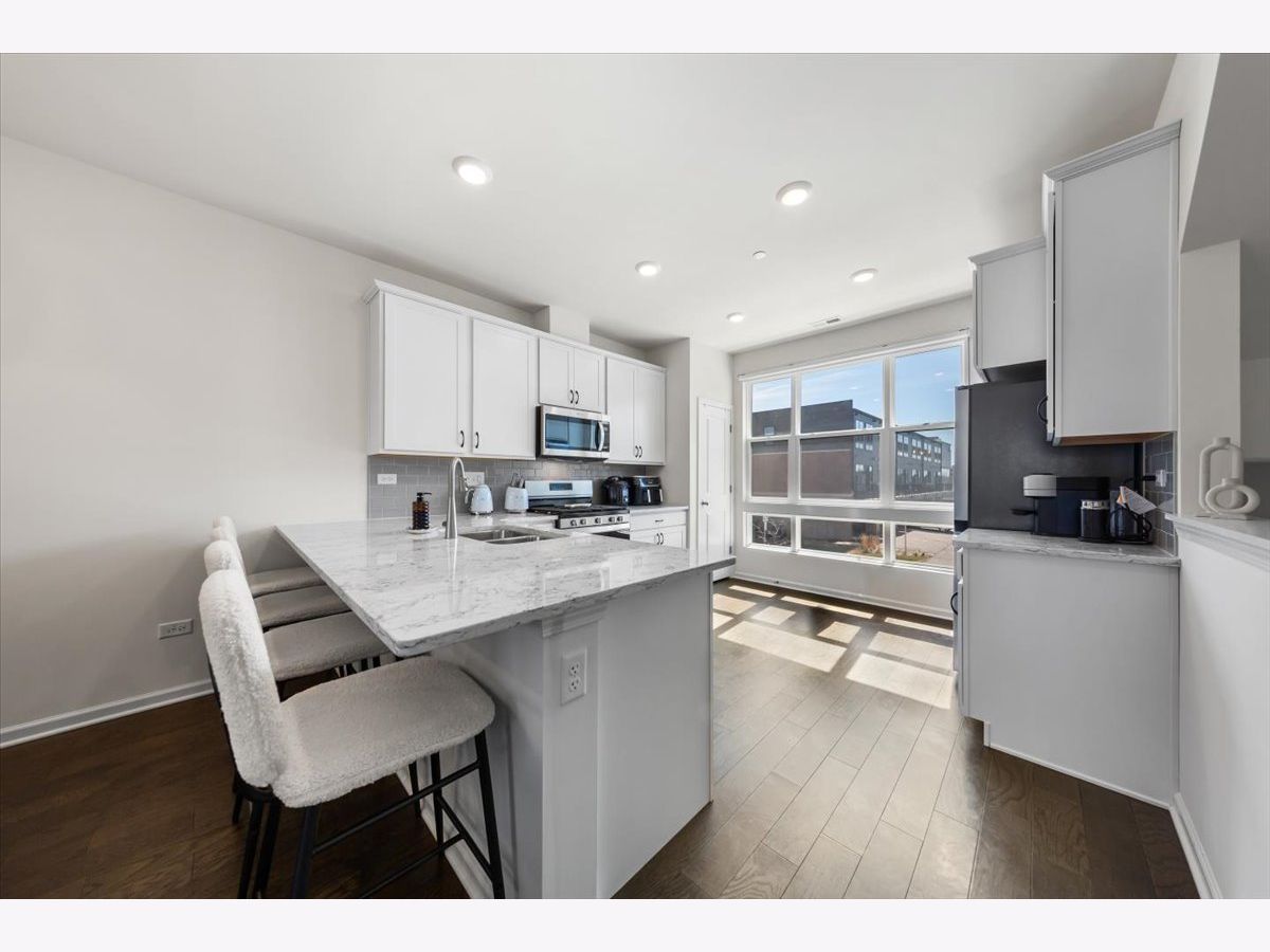 Move right into this beautifully maintained, townhome located in a quiet area of the community with a great location. This light-filled home offers 3 bedrooms, 2.5 baths, and a versatile flex room with unobstructed outdoor views. The finished lower-level flex room includes a full bathroom and is perfect for a home office, den, playroom, workout space, or even a 4th bedroom. The main level features an open-concept layout with 9-foot ceilings and floor-to-ceiling windows, creating a bright and inviting space ideal for both everyday living and entertaining. The expansive kitchen overlooks the dining area and great room and is appointed with 42" white designer cabinets with crown molding, dovetail drawers, and soft-close features, along with quartz countertops, a ceramic backsplash, a spacious island, and a pantry. Upstairs, the primary suite includes a walk-in closet and a private en-suite bathroom. Two additional bedrooms, a full bath, a convenient laundry room, and a linen closet complete the upper level. RevWood flooring runs throughout the main living areas, foyer, owner's entry, and full bathrooms. Additional highlights include an innovative furnace system, tankless water heater, and garage conduit for a future electric vehicle charger. Smart home features include a video doorbell, Honeywell smart thermostat, Amazon Echo Pop, smart lock, and more. Located in a rapidly growing community adjacent to The District, a 30-acre mixed-use development planned as the area's future Main Street, with an 8-mile greenway trail system and a 12-acre urban park with additional enhancements planned beginning in 2026. Enjoy convenient access to highways, shopping, dining, and top-rated Fremd High School District. Credit and background check required.