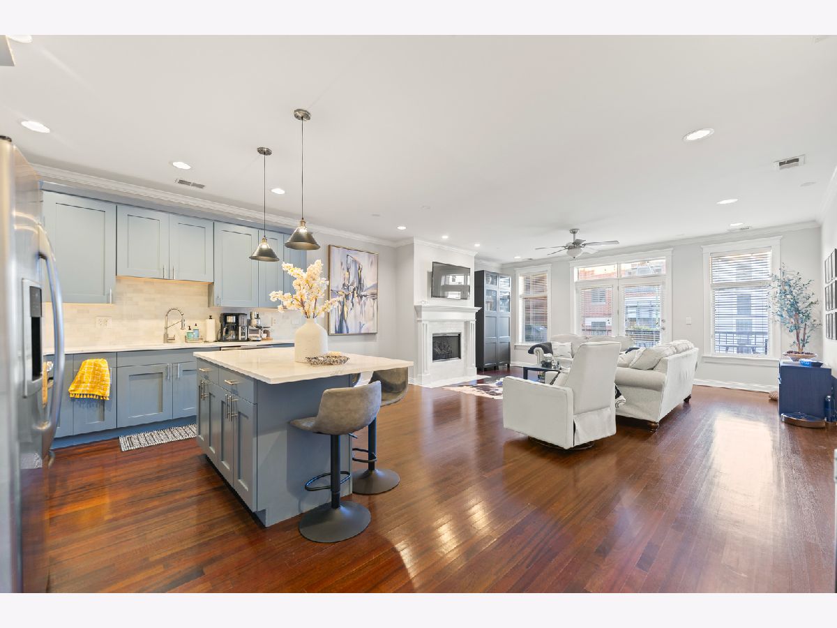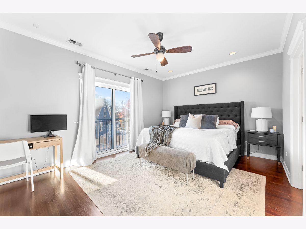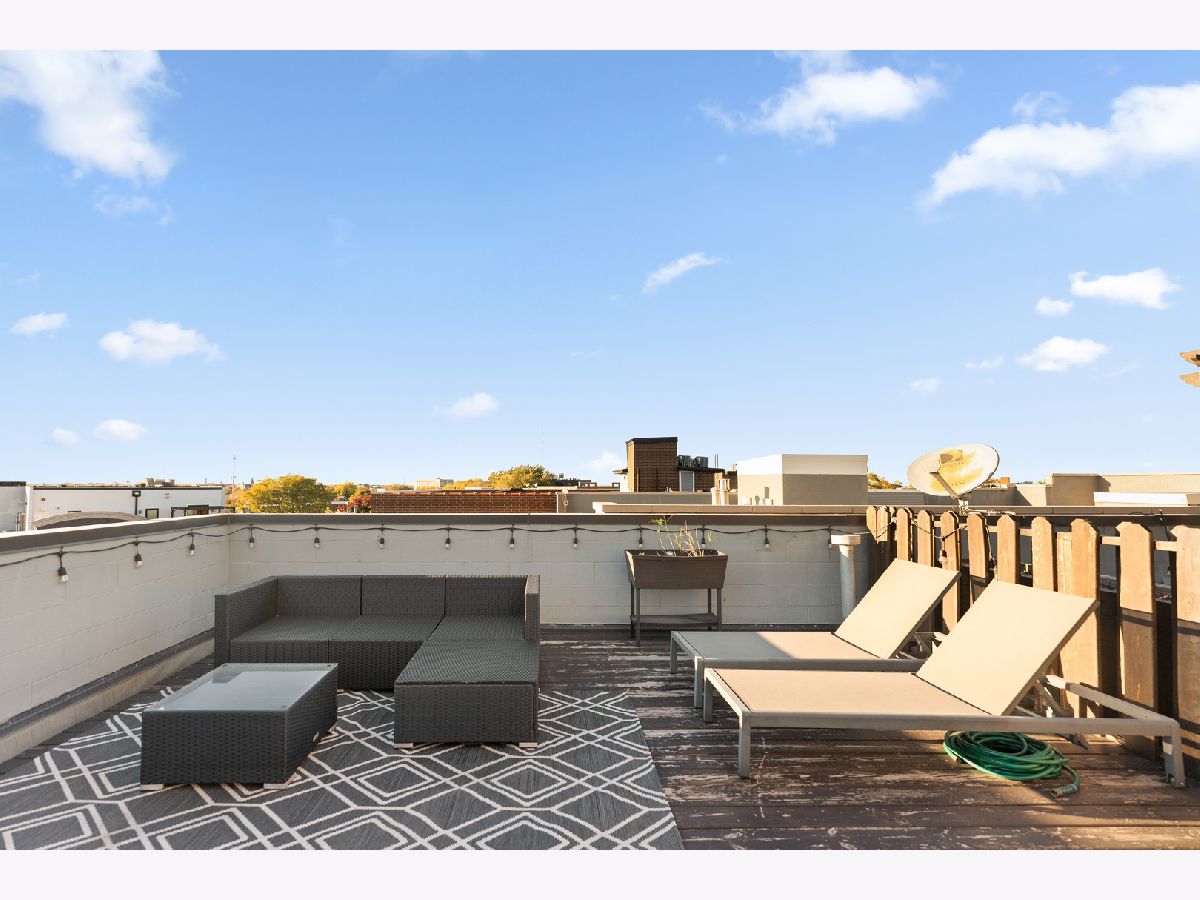 Available for rent starting December 1st, this exquisite 3-bedroom, 2-bathroom condo in Roscoe Village offers luxurious living with direct access via a key-coded elevator. As you enter, you'll notice the beautiful hardwood floors, crown molding, recessed lighting, and custom built-ins throughout the home. The spacious, high-end kitchen is equipped with quartz countertops, marble kitchen backsplash, stainless steel appliances and an island for additional seating. The open-concept living and dining area provides an inviting space for entertaining, featuring a gas fireplace with marble surround and an adjoining front balcony. The primary suite includes a full en-suite bathroom and a roomy closet with a custom organization system. Enjoy stunning city views from your private rooftop deck, accessible by stairs or elevator. Additional features include in-unit laundry and an indoor garage parking spot is available for 150/mo. Conveniently located just minutes from Roscoe Village dining and shopping, grocery, Hamlin Park, Clybourn Metra, bus stops Western/Belmont.