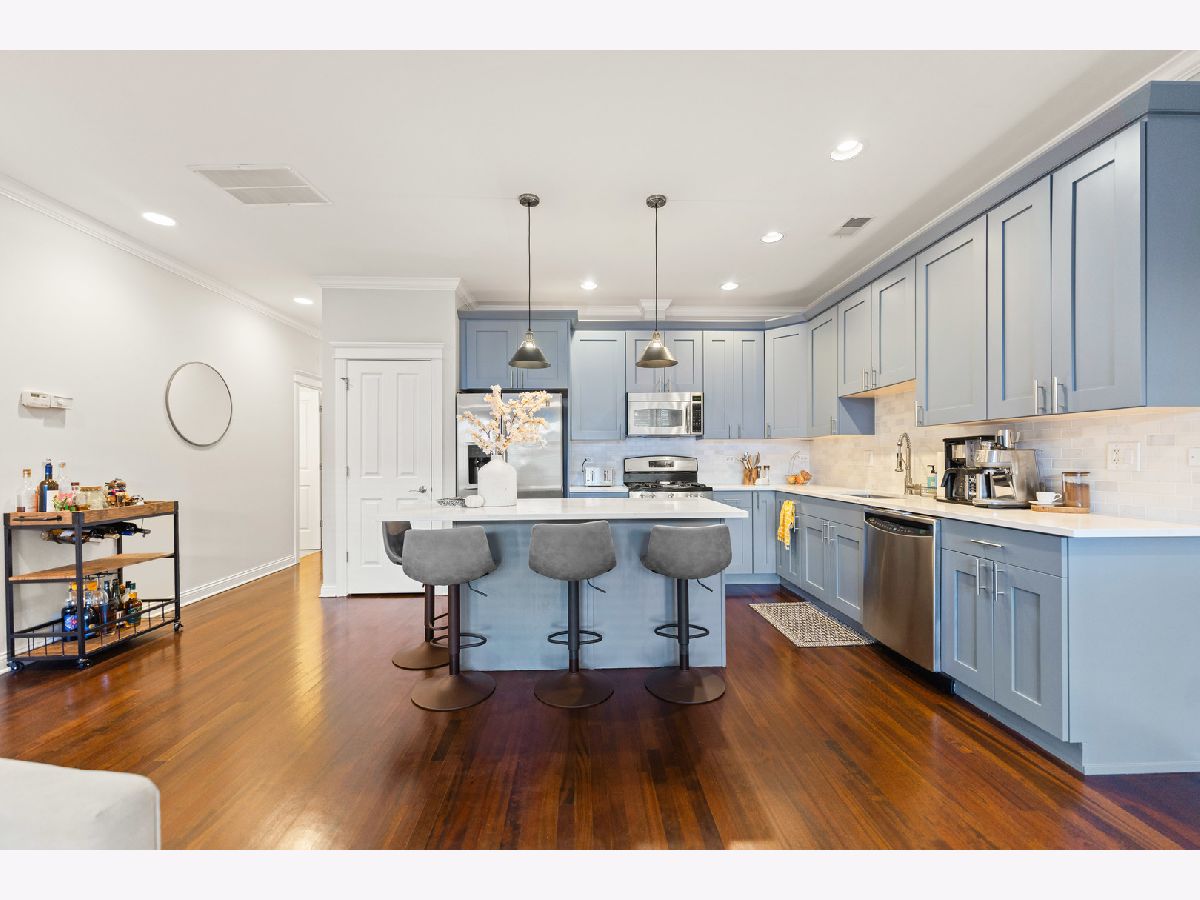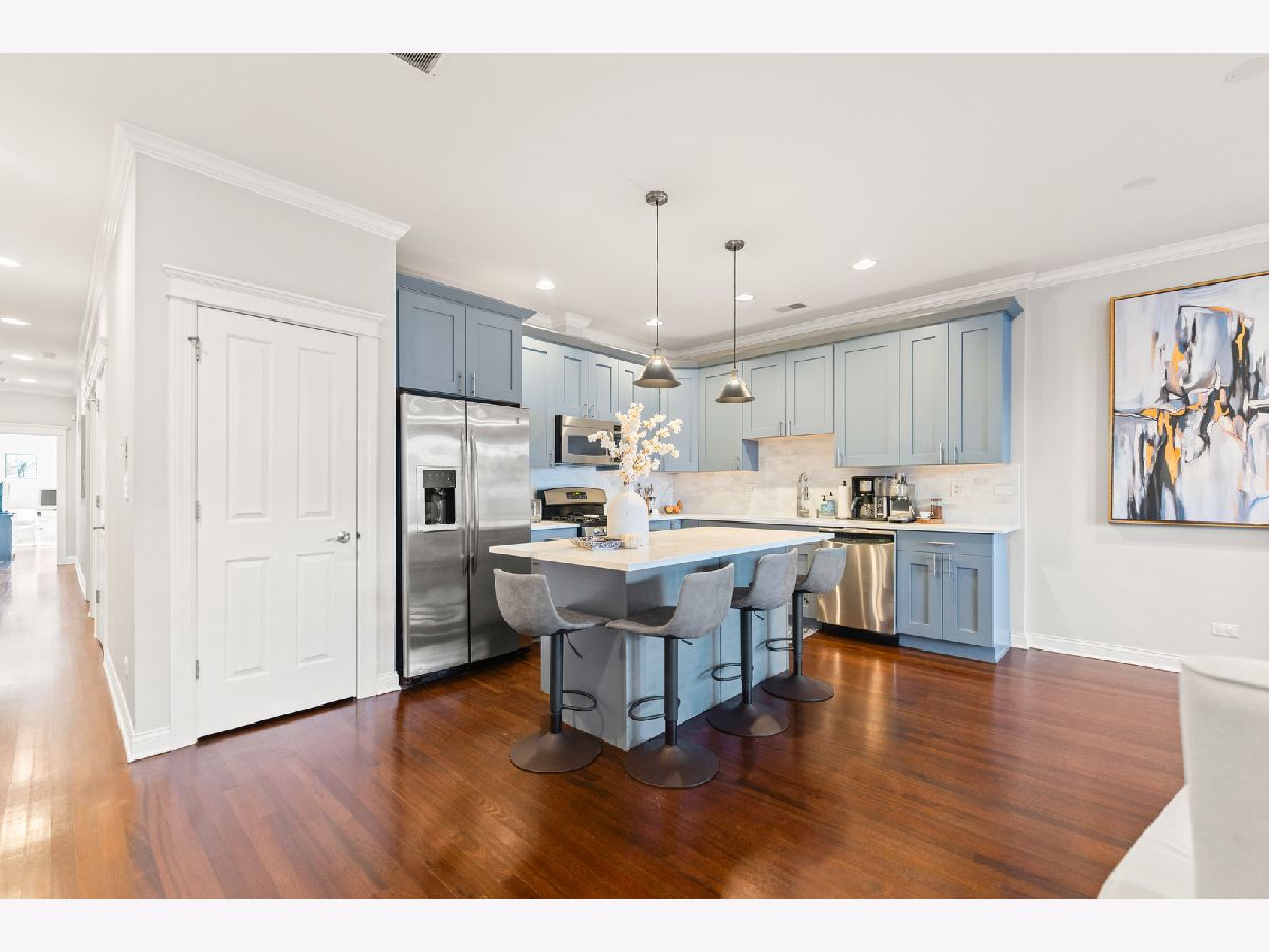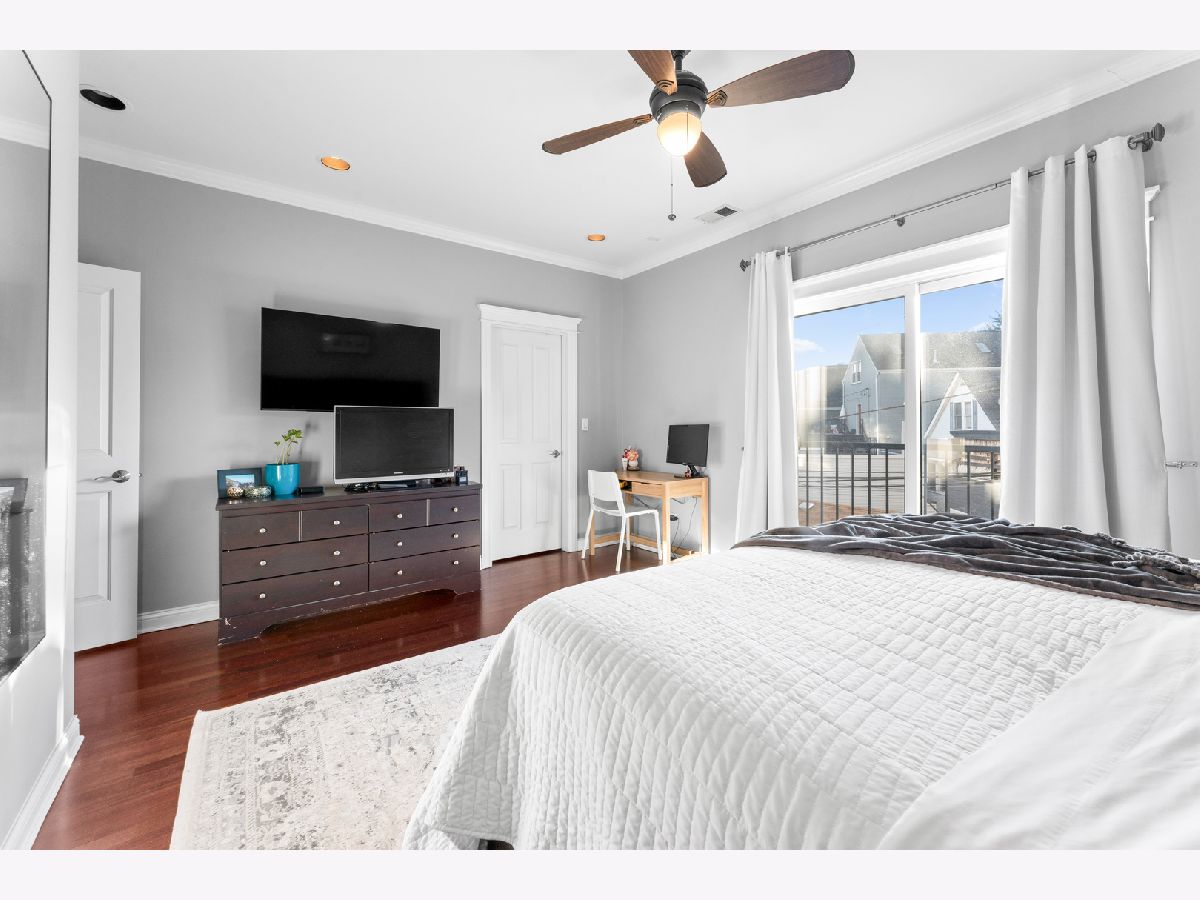 Available for rent starting December 1st, this exquisite 3-bedroom, 2-bathroom condo in Roscoe Village offers luxurious living with direct access via a key-coded elevator. As you enter, you'll notice the beautiful hardwood floors, crown molding, recessed lighting, and custom built-ins throughout the home. The spacious, high-end kitchen is equipped with quartz countertops, marble kitchen backsplash, stainless steel appliances and an island for additional seating. The open-concept living and dining area provides an inviting space for entertaining, featuring a gas fireplace with marble surround and an adjoining front balcony. The primary suite includes a full en-suite bathroom and a roomy closet with a custom organization system. Enjoy stunning city views from your private rooftop deck, accessible by stairs or elevator. Additional features include in-unit laundry and an indoor garage parking spot is available for 150/mo. Conveniently located just minutes from Roscoe Village dining and shopping, grocery, Hamlin Park, Clybourn Metra, bus stops Western/Belmont.