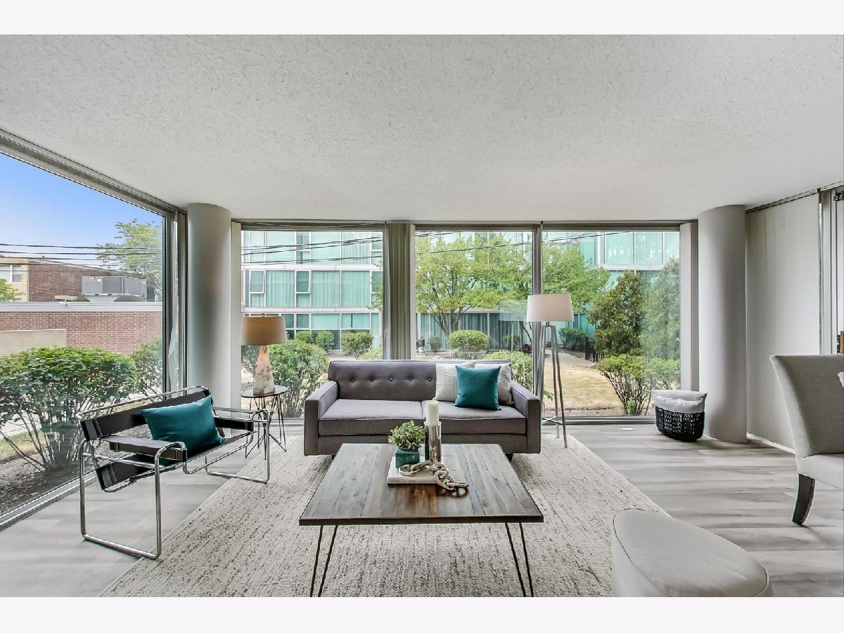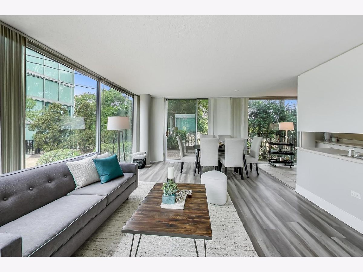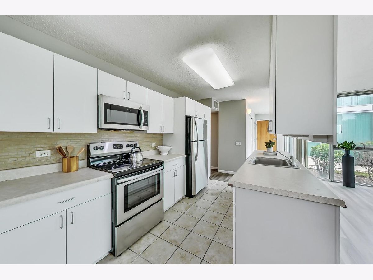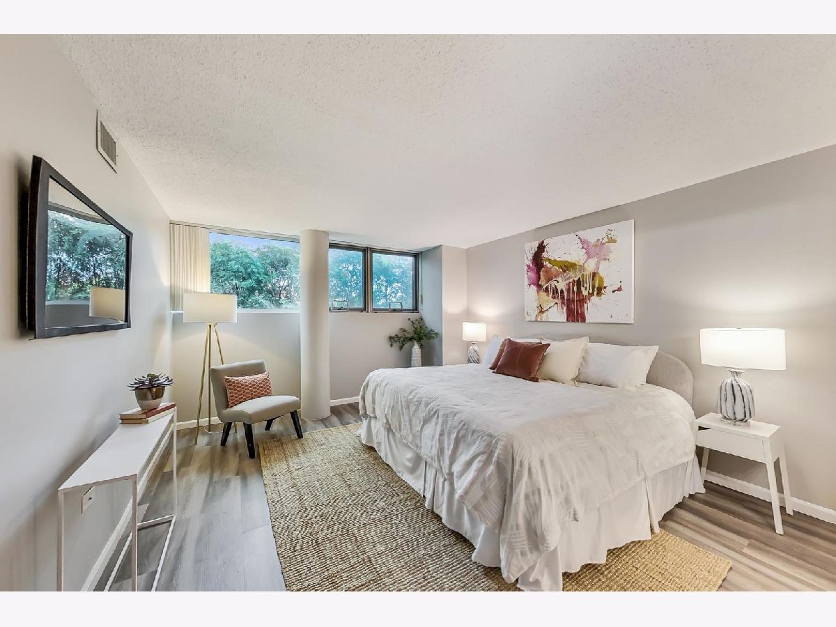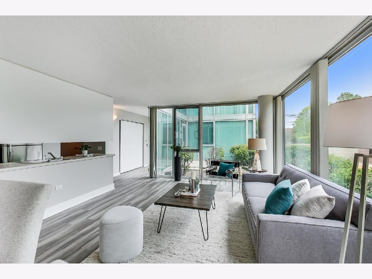 Fantastic modern 2 bed/2 bath residence. Open floor plan with floor to ceiling windows in living/dining/kitchen. Kitchen features stainless steel appliances, tile backsplash and tons of storage. Plenty of room in the living/dining space for larger furniture and large dining table. Concrete patio through sliding glass door adjacent to living/dining room. Primary suite includes walk-in closet and bathroom with standup shower and large vanity (currently single, but room for 2nd sink). Brand new luxury vinyl plank flooring throughout, custom paint job, full-size side-by-side washer/dryer, great storage in unit. Building has 1 heated garage space (included), storage cage (included), indoor pool, party room, rooftop deck, and exercise facilities. Assessment includes heat, cooking gas, pool, exercise facilities, parking, etc. Gorgeous unit ready for you to call home.