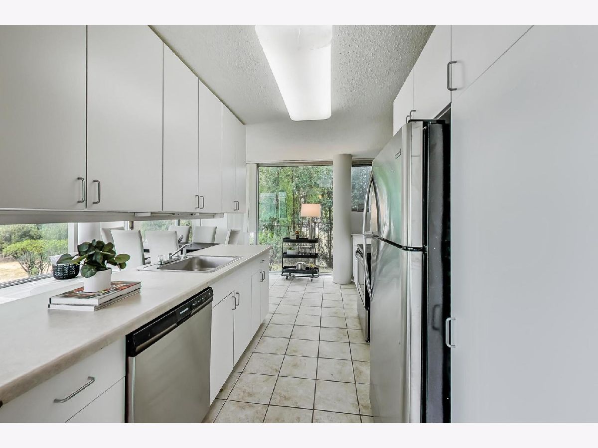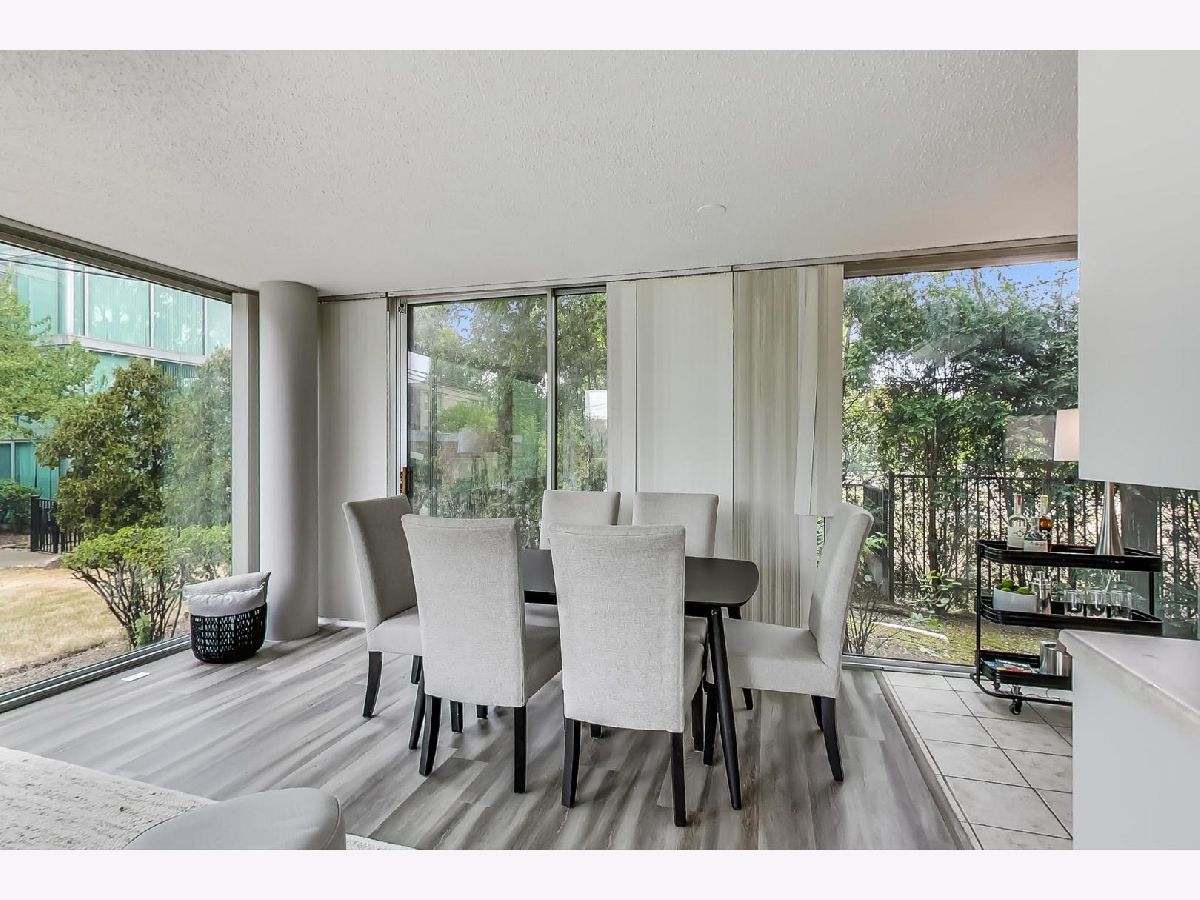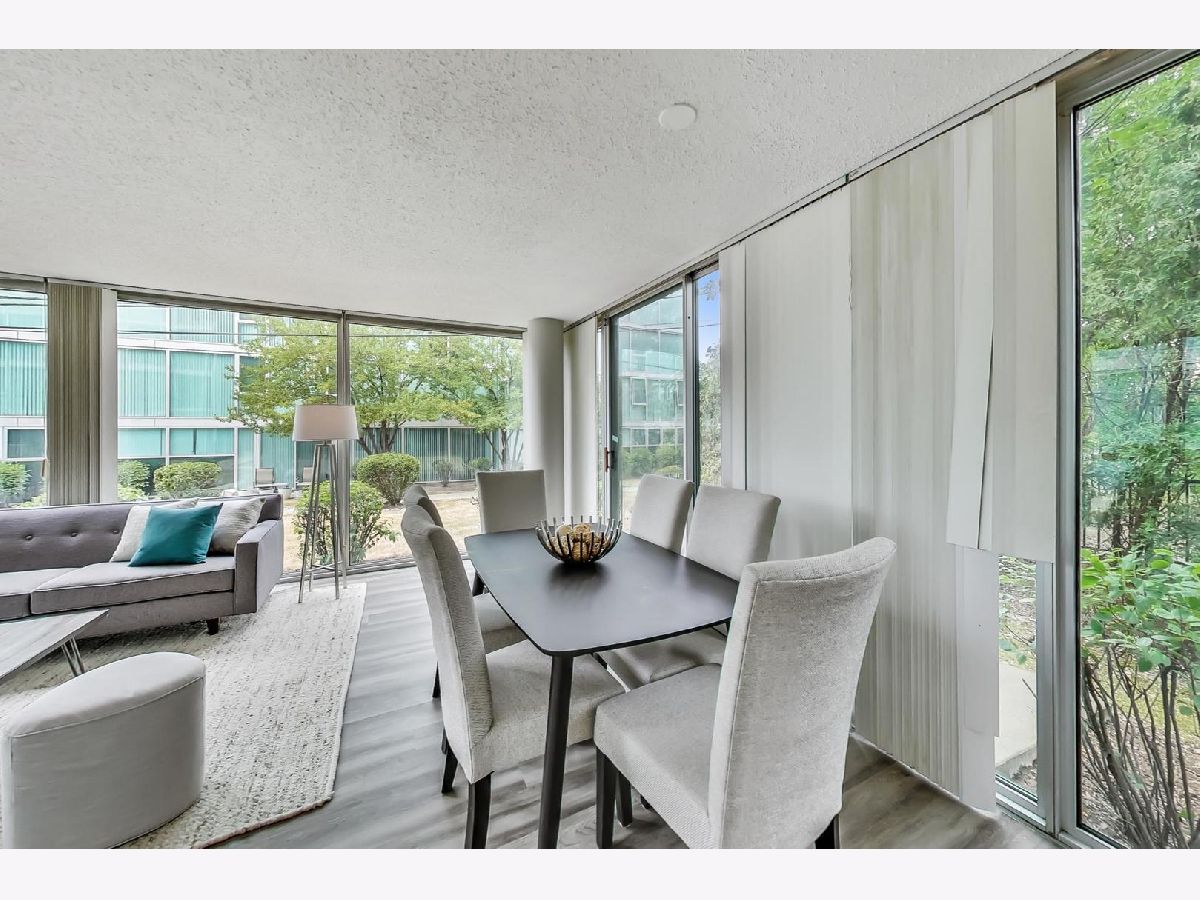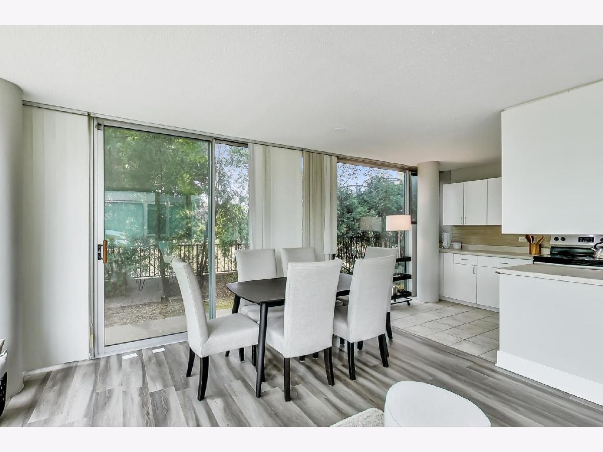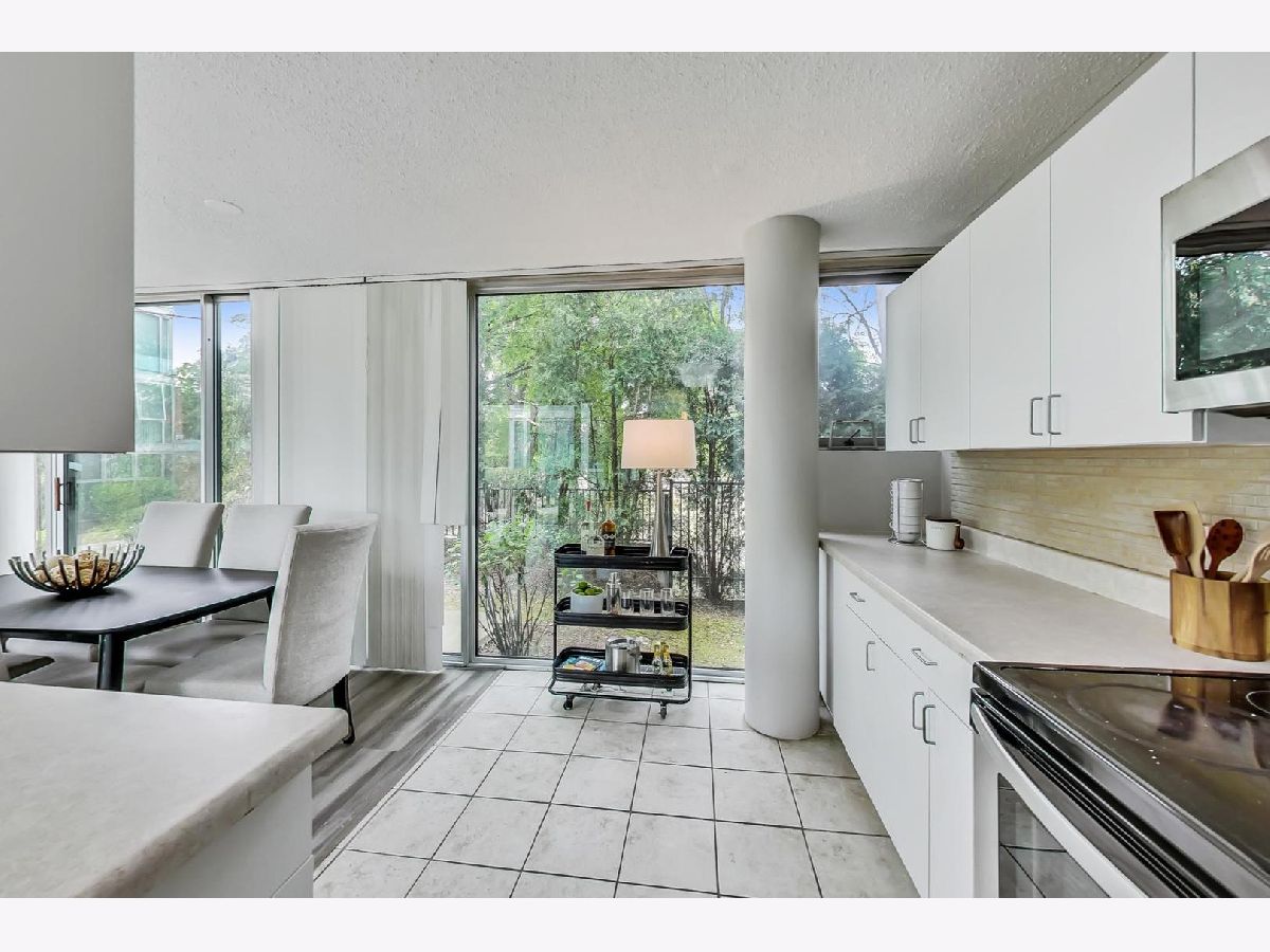 Fantastic modern 2 bed/2 bath residence. Open floor plan with floor to ceiling windows in living/dining/kitchen. Kitchen features stainless steel appliances, tile backsplash and tons of storage. Plenty of room in the living/dining space for larger furniture and large dining table. Concrete patio through sliding glass door adjacent to living/dining room. Primary suite includes walk-in closet and bathroom with standup shower and large vanity (currently single, but room for 2nd sink). Brand new luxury vinyl plank flooring throughout, custom paint job, full-size side-by-side washer/dryer, great storage in unit. Building has 1 heated garage space (included), storage cage (included), indoor pool, party room, rooftop deck, and exercise facilities. Assessment includes heat, cooking gas, pool, exercise facilities, parking, etc. Gorgeous unit ready for you to call home.