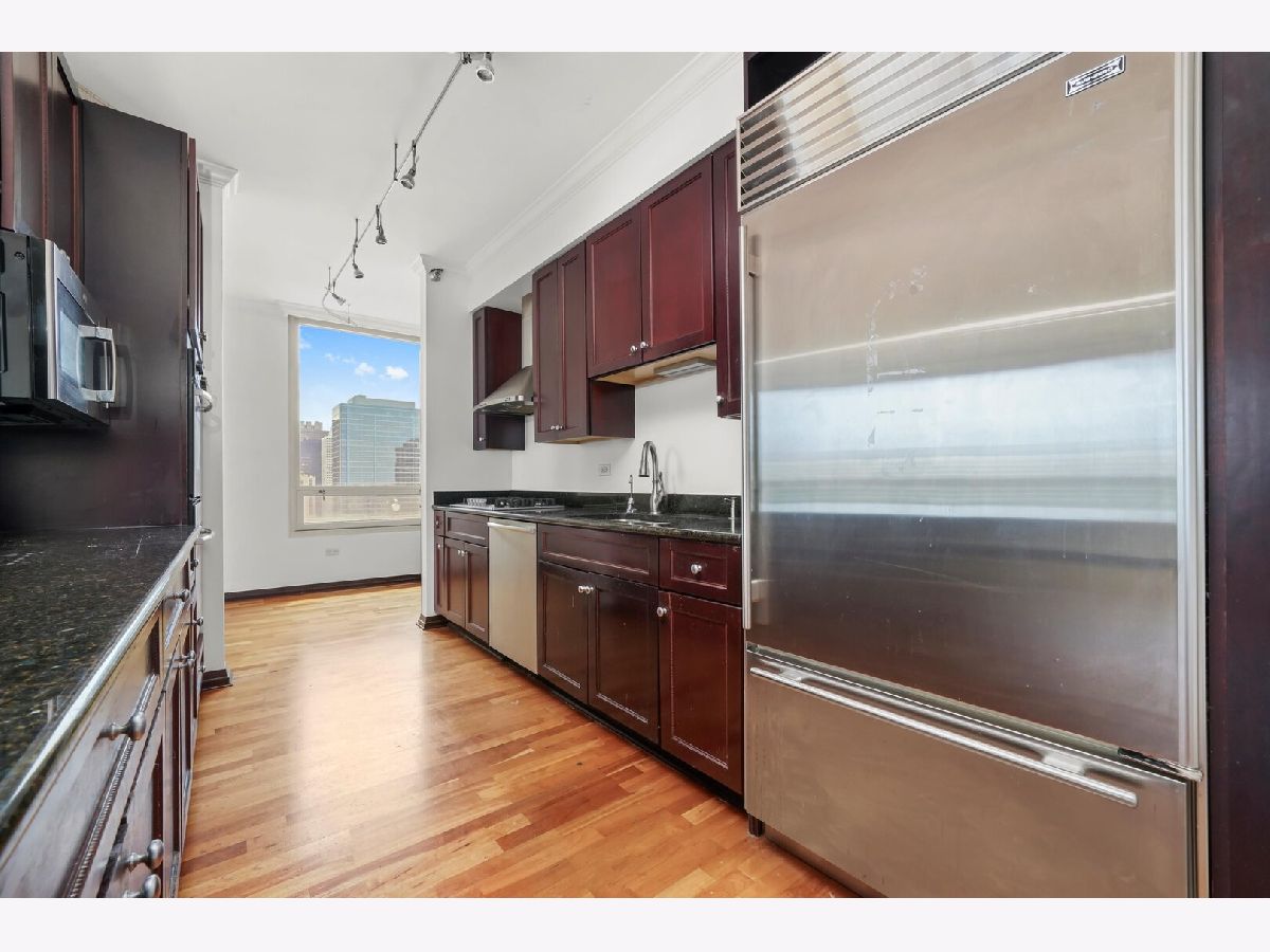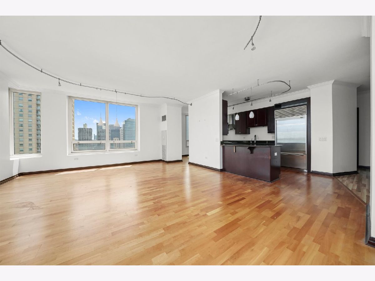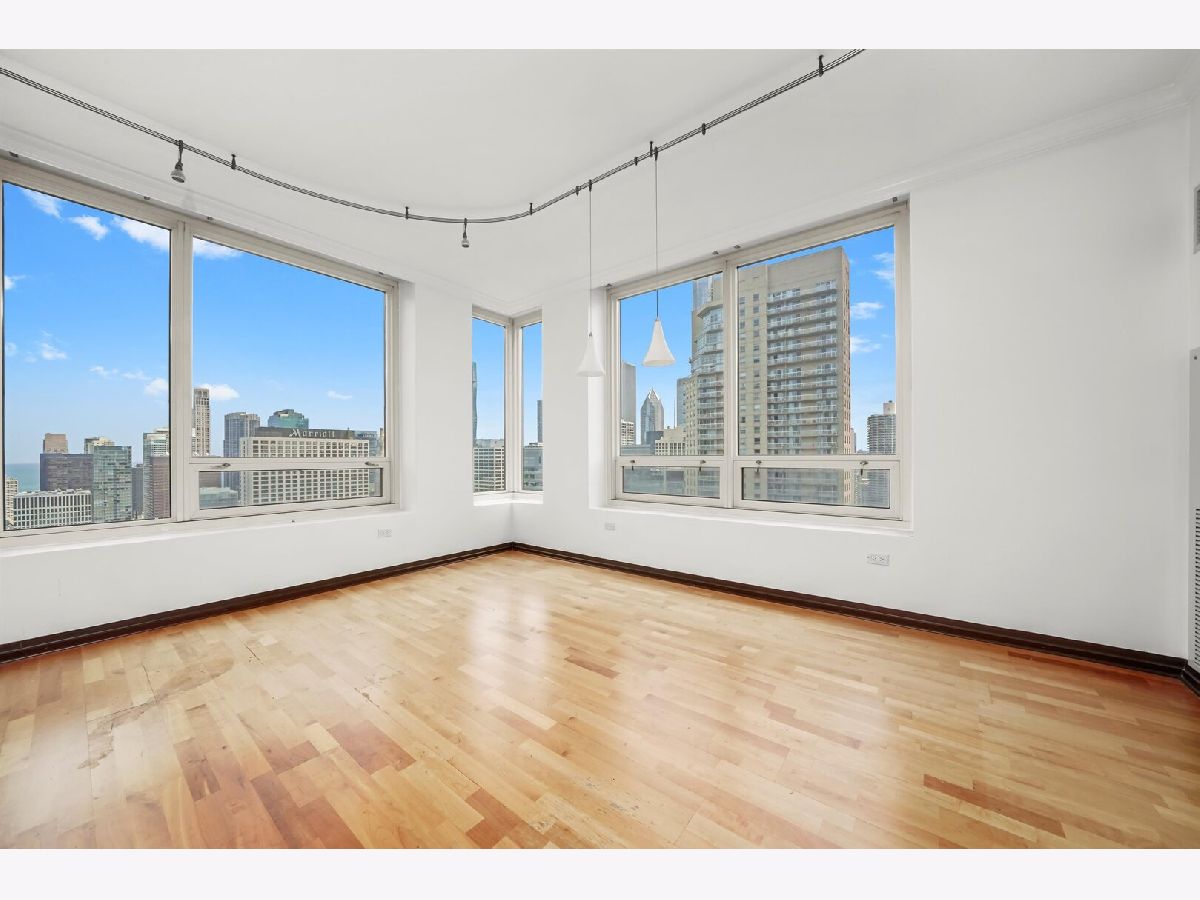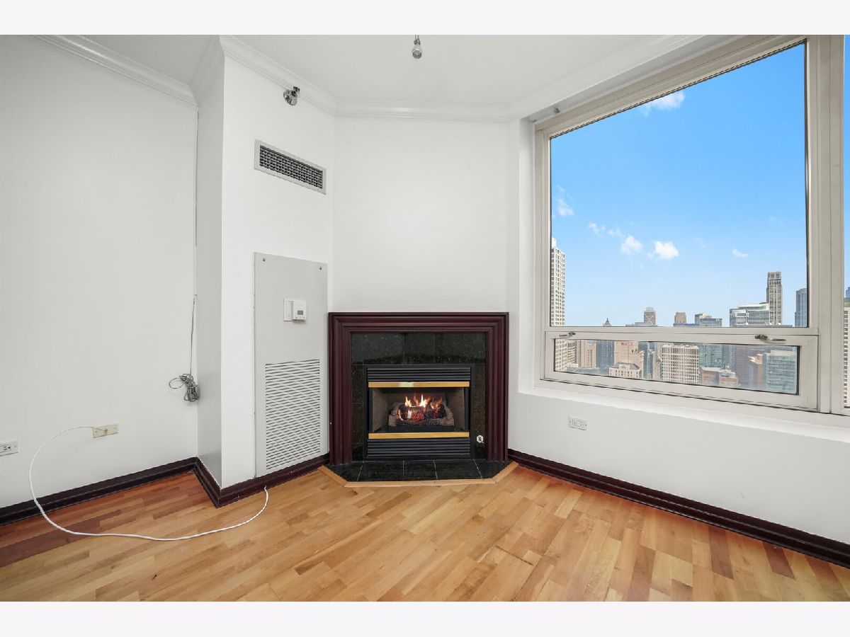 Parking included.! Step into this spacious 3-bedroom, 2.5-bath condo located in downtown Chicago. This high-floor unit features floor-to-ceiling windows with sweeping skyline views, an open-concept layout, and hardwood floors throughout the main living areas. The kitchen includes beautiful stone countertops, stainless steel appliances - including a double oven - and a large breakfast bar, perfect for entertaining. The expansive living and dining area is centered around a modern fireplace and wrapped in natural light from panoramic windows. The bedrooms offer generous closet space. One bathroom with dual vanities, soaking tub, and separate shower. In-unit washer/dryer, ample storage, and neutral finishes throughout complete this ideal city home. Full-amenity building with 24-hour door staff, fitness center, outdoor pool, and steps from shopping, dining, and nightlife.