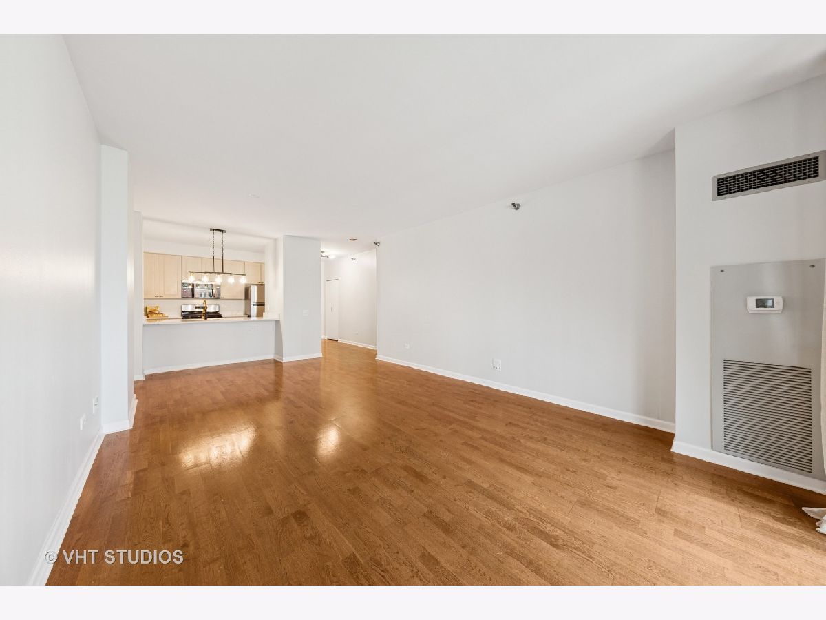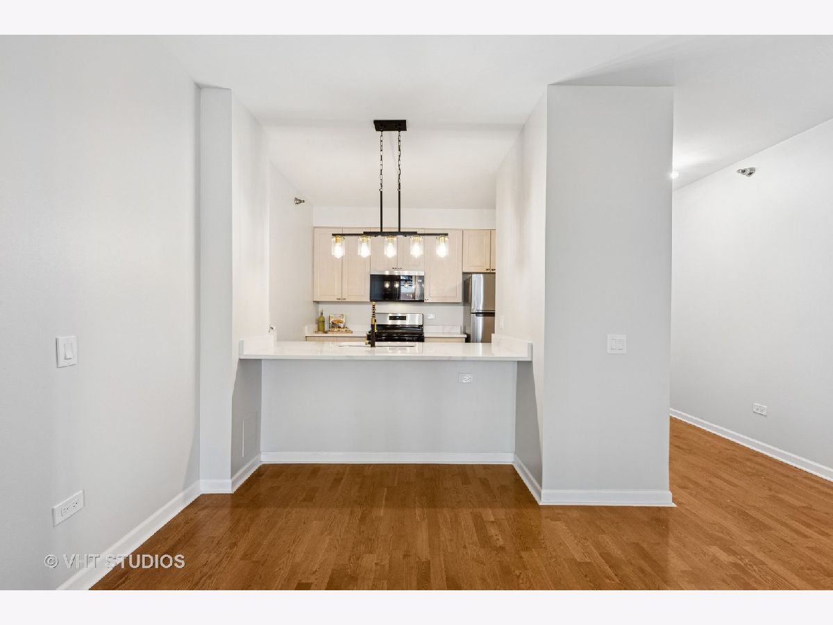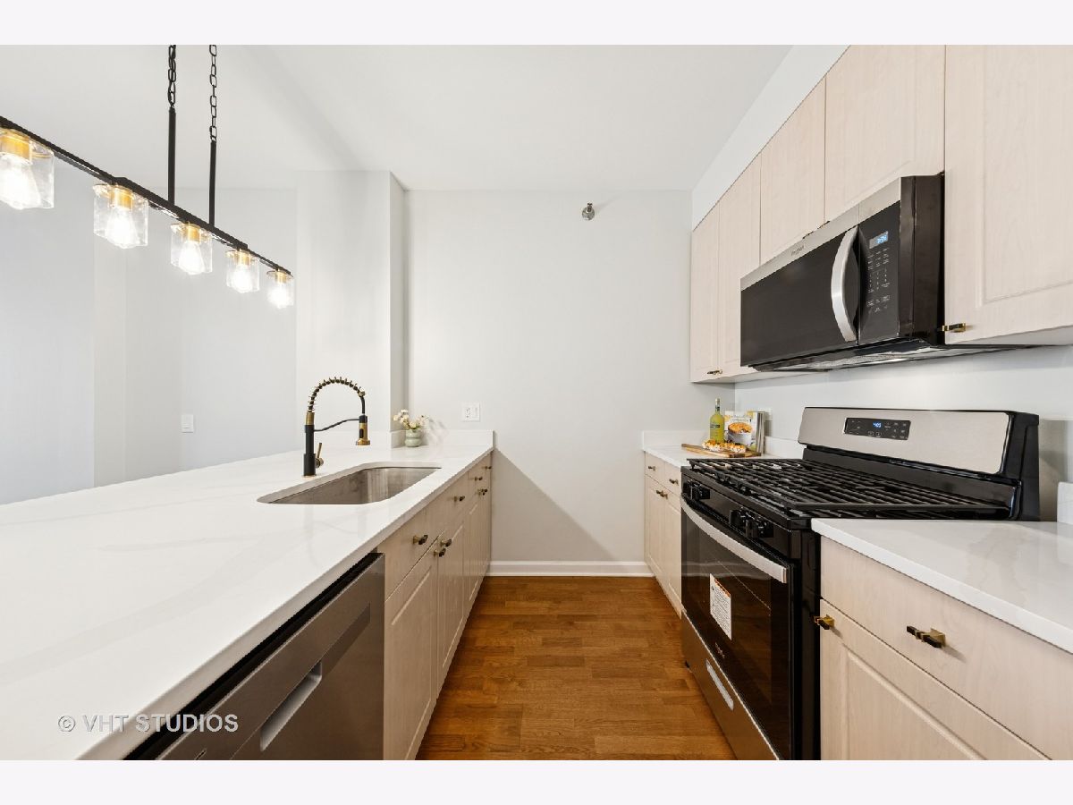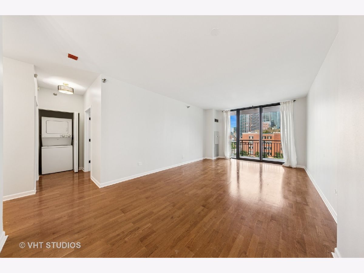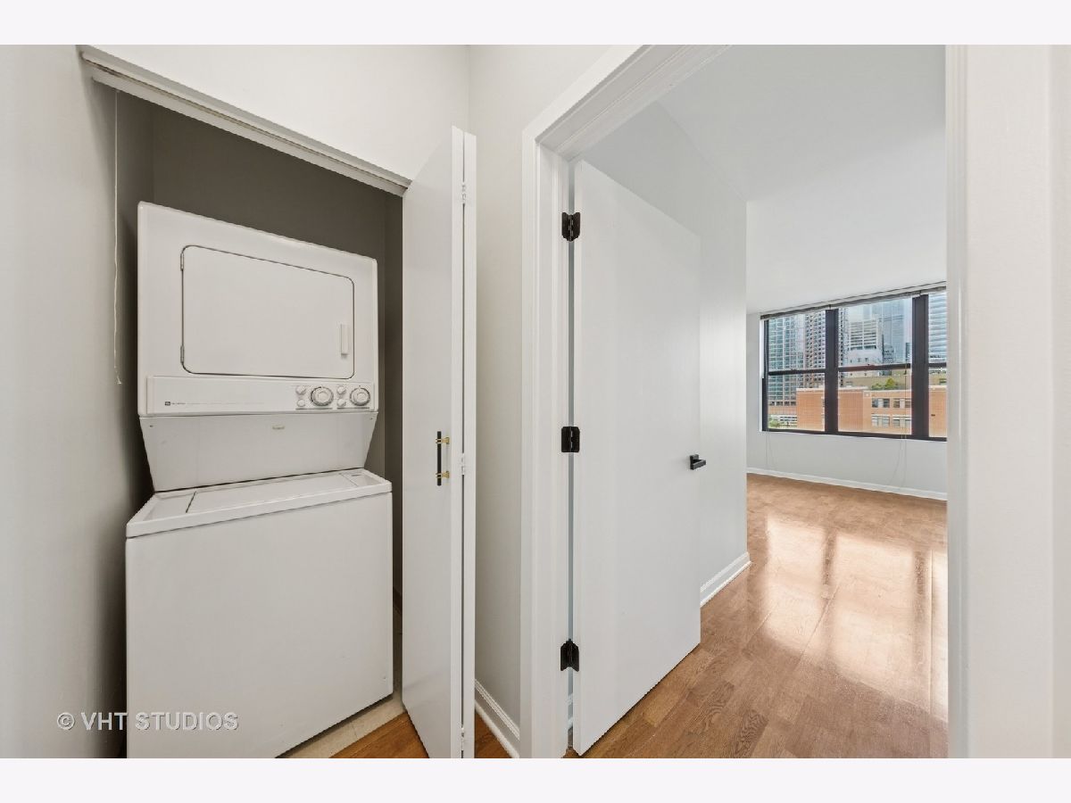 Beautifully upgraded 1BR/1BA freshly painted east facing move-in ready condo at Kinzie Station located in the heart of Fulton Market/West Loop! Garage parking and additional storage included! The kitchen features brand-new Whirlpool stainless steel appliances-refrigerator, oven, microwave, and dishwasher-along with sleek quartz countertops and modern cabinetry, all complemented by engineered hardwood flooring throughout. The spacious, open layout offers a bright living area leading to a private balcony with stunning city skyline views! The bedroom offers spacious walk in closet and easily fits a king size bed and additional furniture. In-unit laundry, ample closet storage space, and central heating and cooling. The building offers full-service, 24-hour door staff, a fitness center, landscaped terrace, party room, Amazon Hub, on-site dry cleaner, and a dog relief area. Pets friendly. The monthly HOA covers gas, heat, A/C, cable, internet, water, and building amenities. Unbeatable location walking distance to restaurants and grocery stores, Metra, CTA Green/Pink/Blue lines, and major expressways-ideal for modern city living. Come to see it today!