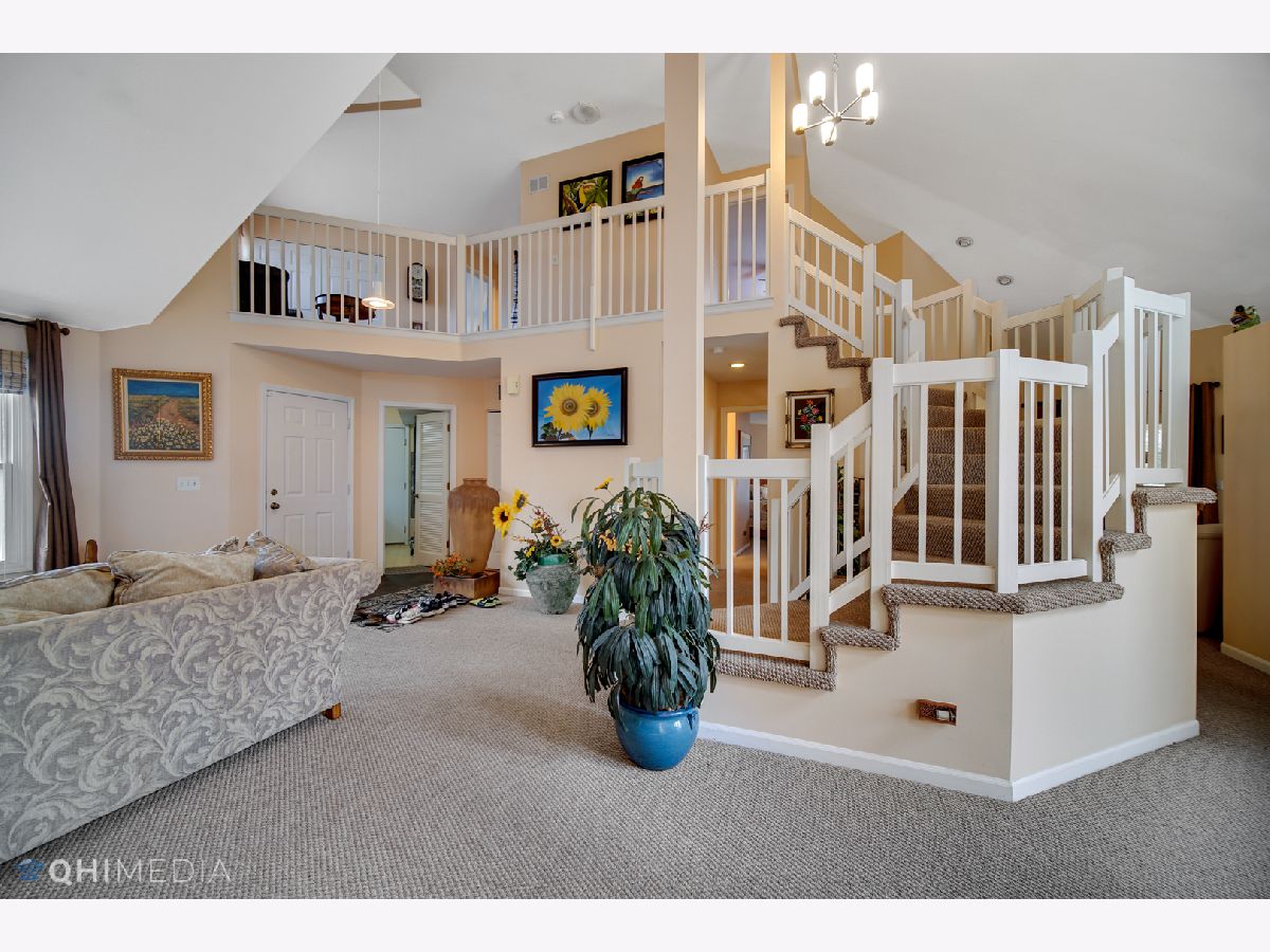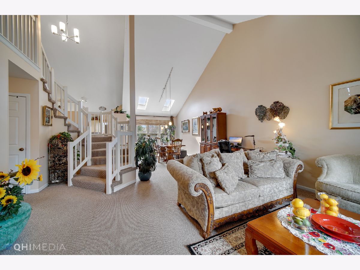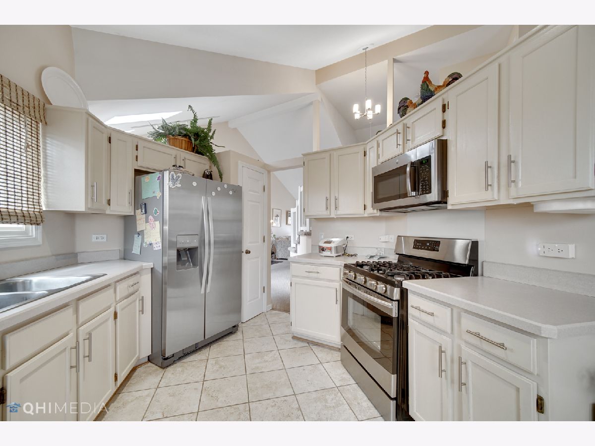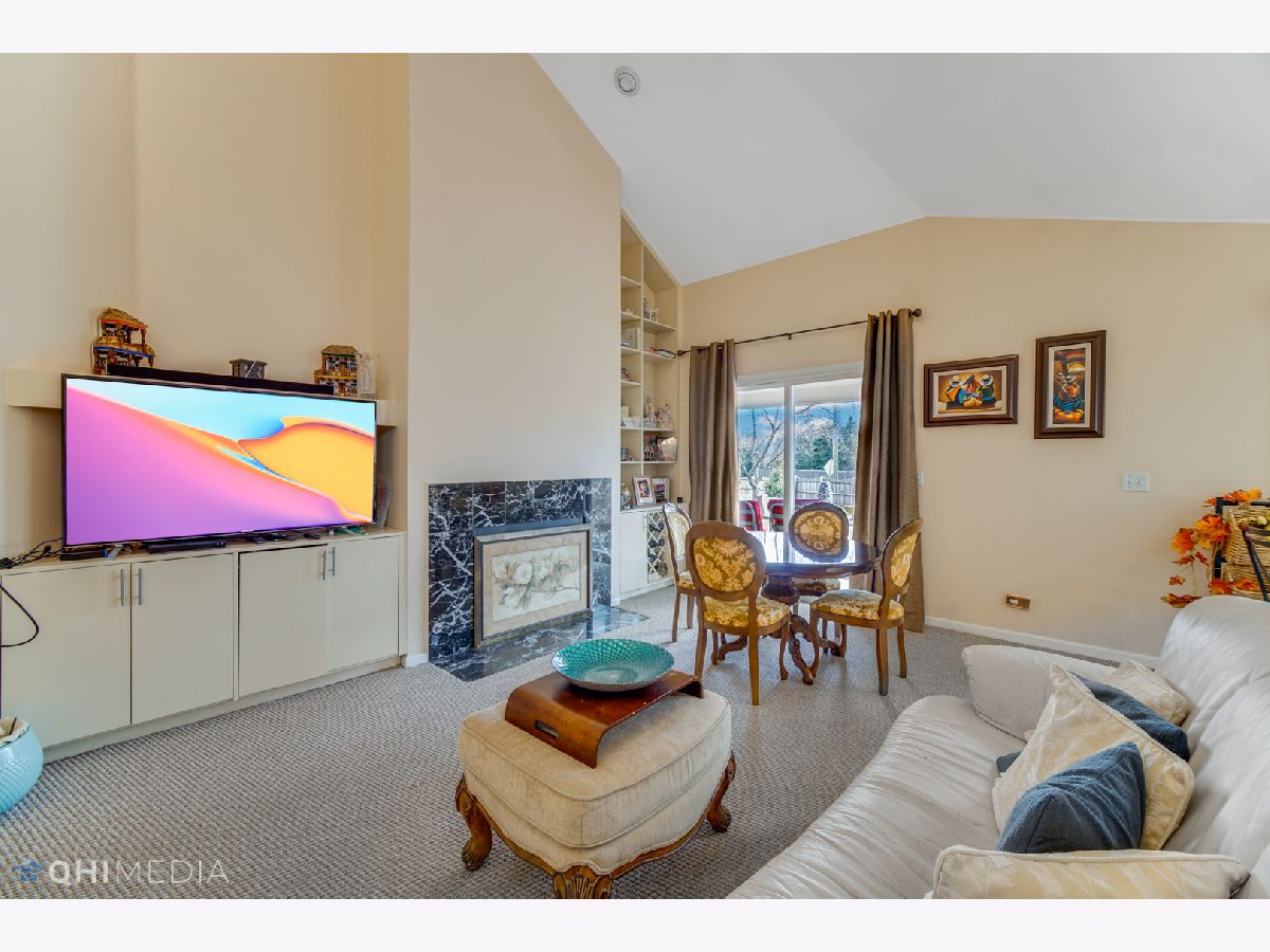 Sun-filled contemporary townhome located in the popular Woodlands of Fiore. This home features an open floor plan with vaulted ceilings, skylights, and a neutral interior palette. The main floor includes a spacious primary suite with a walk-in closet and a master bath that offers a separate shower and a soaking tub. The family room boasts built-in shelving, a wood-burning fireplace, and sliding doors that lead to a private patio overlooking an open area. The eat-in kitchen is equipped with updated stainless steel appliances. Upstairs, you'll find two generously sized bedrooms, a loft, and a shared full bath. The second bedroom also includes a walk-in closet. Convenient first-floor laundry room with newer washer and dryer. Plenty of storage throughout, plus a two-car garage. Enjoy the community amenities, including an outdoor pool and clubhouse. Prime location-just minutes from shopping, the Metra station, and top-rated schools in District 96 and Stevenson High School. Available July 1st.