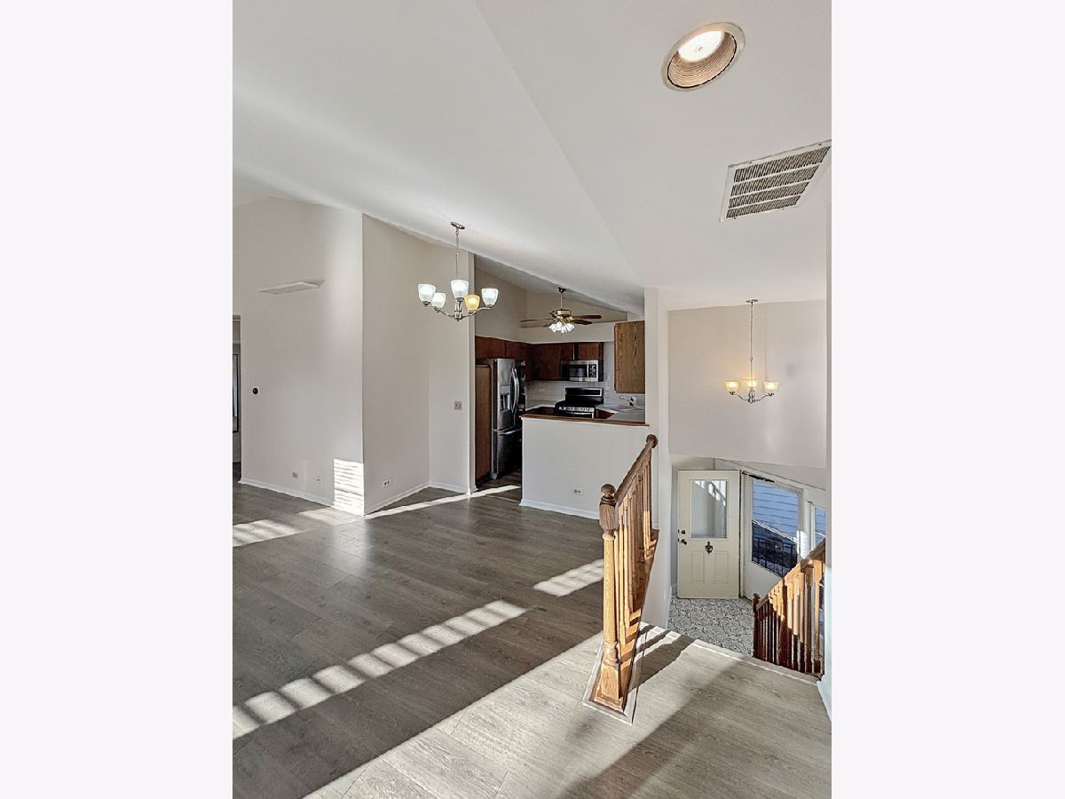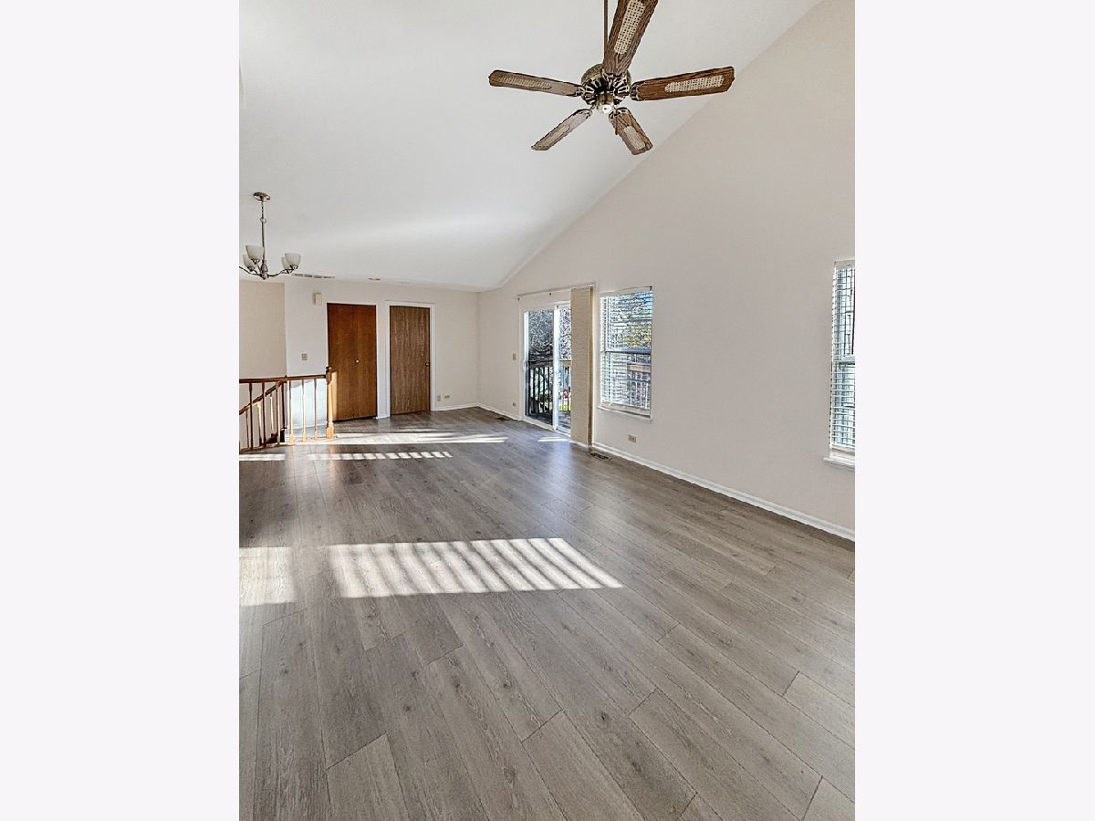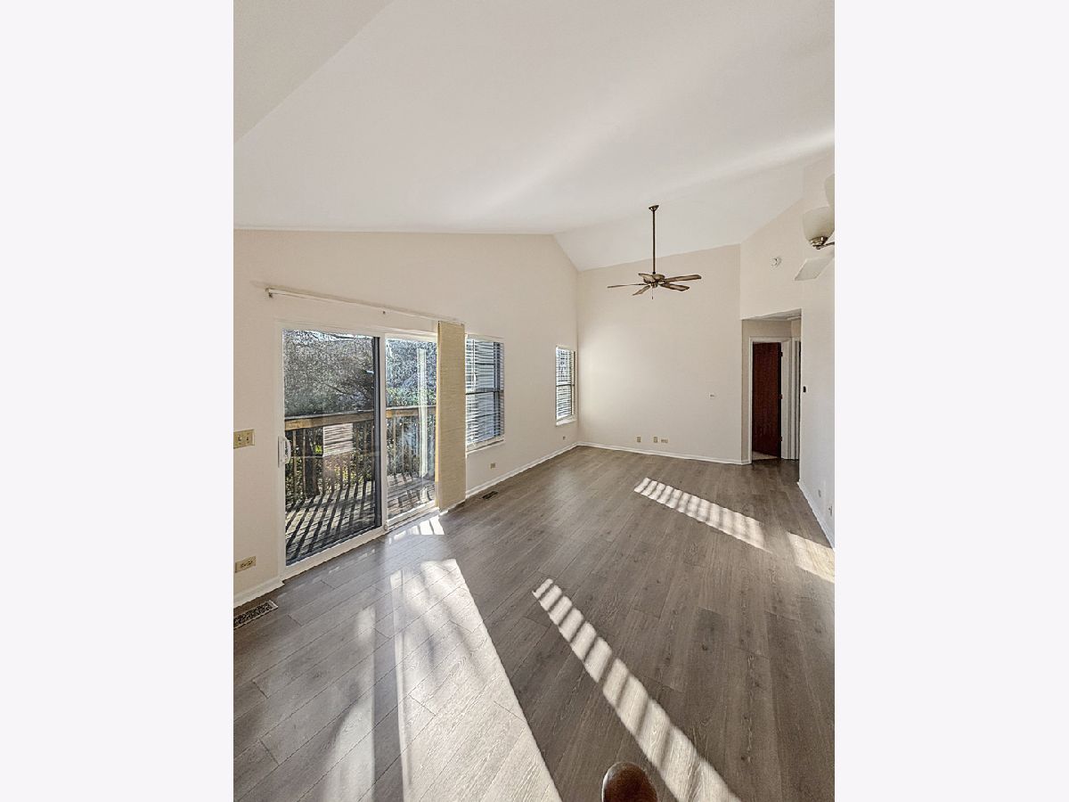 Discover serene townhome living in this inviting 2nd-floor, 2-bedroom end unit featuring a south-facing balcony that fills the home with natural light. The expansive living and dining area boasts a cathedral ceiling, new vinyl flooring, and bright balcony exposure, creating an airy and welcoming atmosphere. The open kitchen overlooks the flexible dining space and living room and features newer appliances and new vinyl plank flooring, which continues through the main living areas. Enjoy relaxing views of mature trees and greenery from your living room or step outside onto your private balcony for a peaceful retreat. Both bedrooms are generously sized, including a primary bedroom with a dedicated dressing/makeup area. The immense bathroom has been updated with new dual sinks and quartz countertops for a modern, polished feel. Additional conveniences include an in-unit laundry/utility room with extra storage and a welcoming foyer with direct access to your private one-car garage. Set within a beautifully landscaped community featuring ponds, mature trees, wildlife, and a bike/running path, this home offers the charm of living in a private park while remaining close to everyday amenities. Enjoy easy access to a nearby golf course, shopping, and you're just minutes from METRA and downtown Palatine.