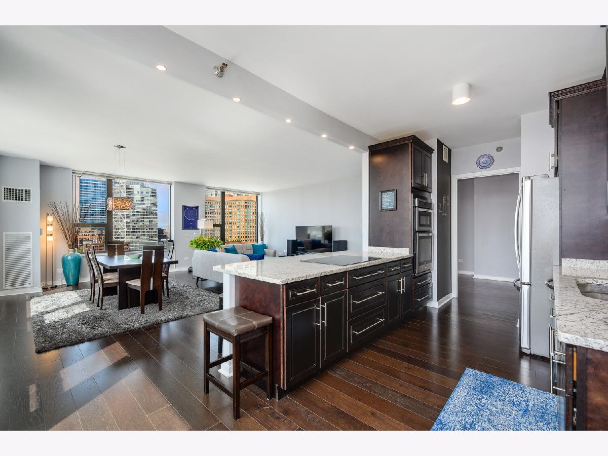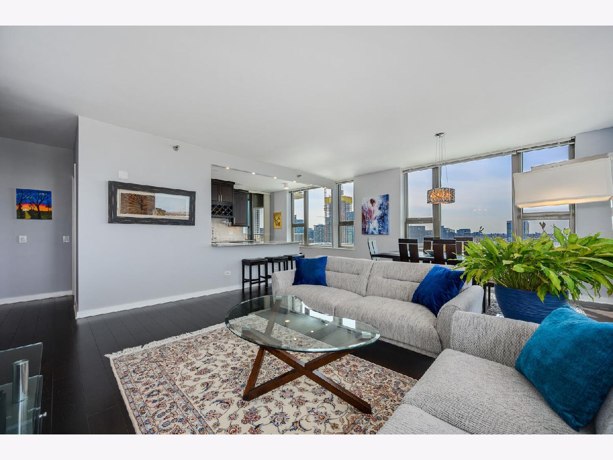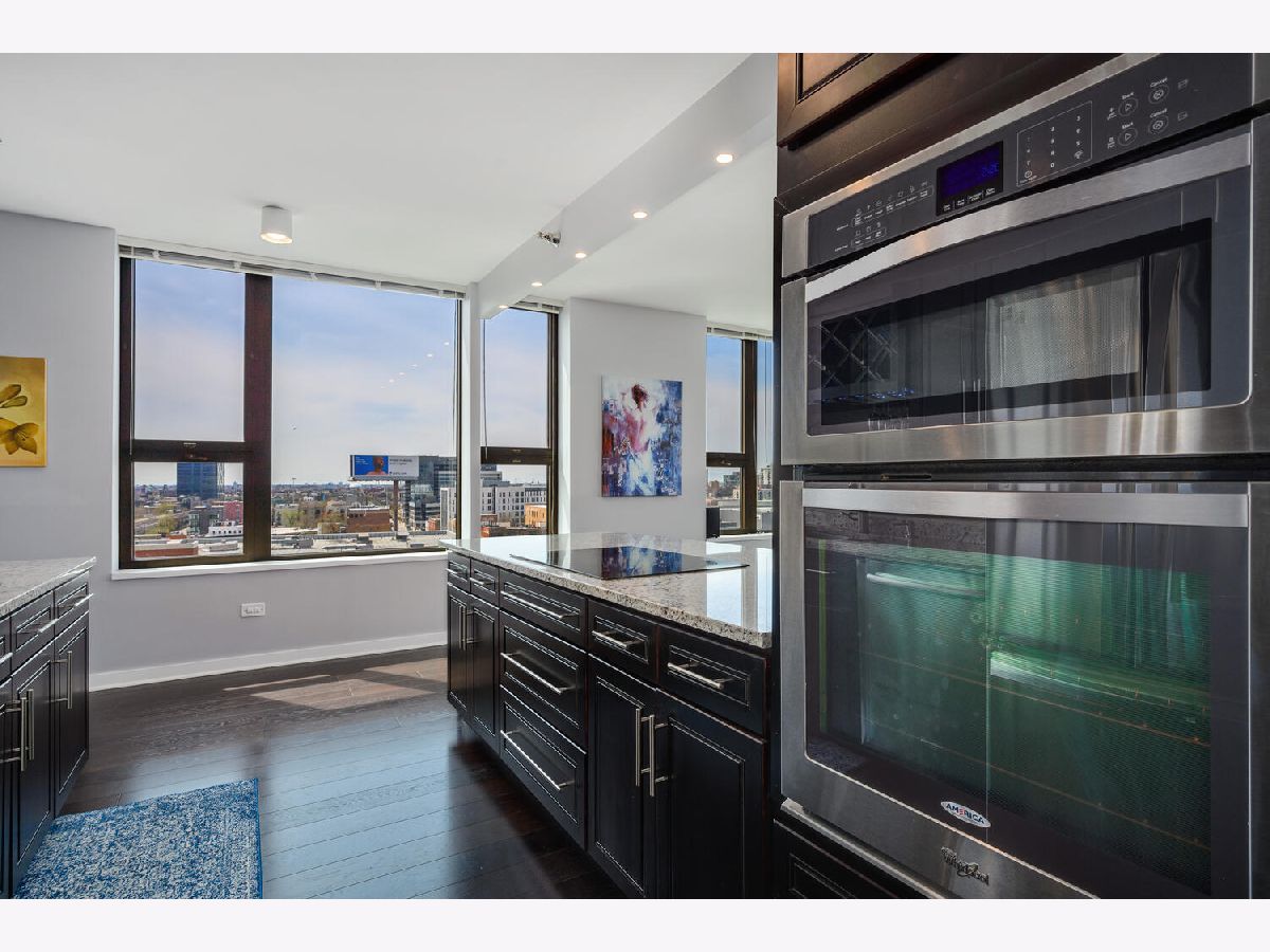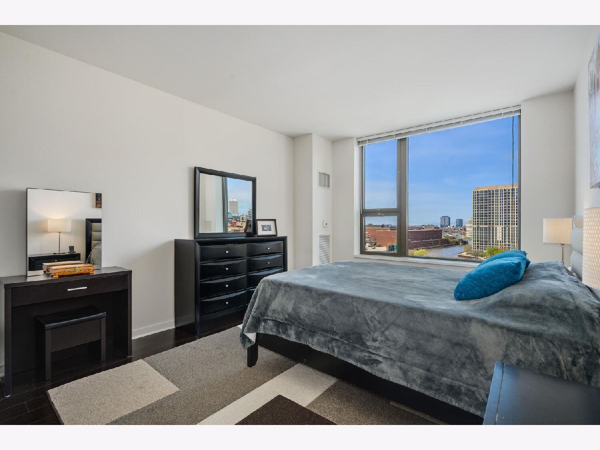 Beautifully renovated 2 bedroom 2 bathroom Unit at Kinzie Park. Hardwood flooring throughout, open kitchen with newer cabinets and premium stainless steel appliances , stone countertops, and custom tile work. Professional closet organizers in the primary bedroom. This northwest facing residence has a split bedroom plan and generous storage options in every room. The oversized terrace works seamlessly with the interior space providing easy in/out living. Kinzie Park offers 24 hour attended gated entry with free guest parking, lush gardens/common area outdoor space with Riverwalk, pool, gym, 24 hour door staff, bike room, party/meeting room with full kitchen, on site management, 24 hour engineering staff, generous storage area and heated parking garage parking available /additional $200. Urban Living has been perfected at Kinzie Park!