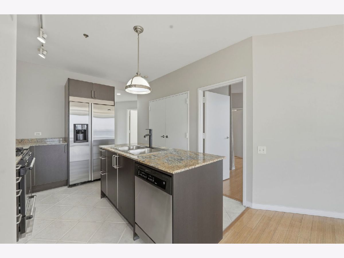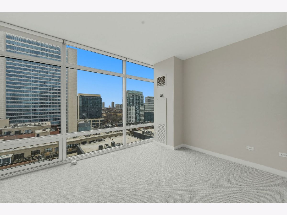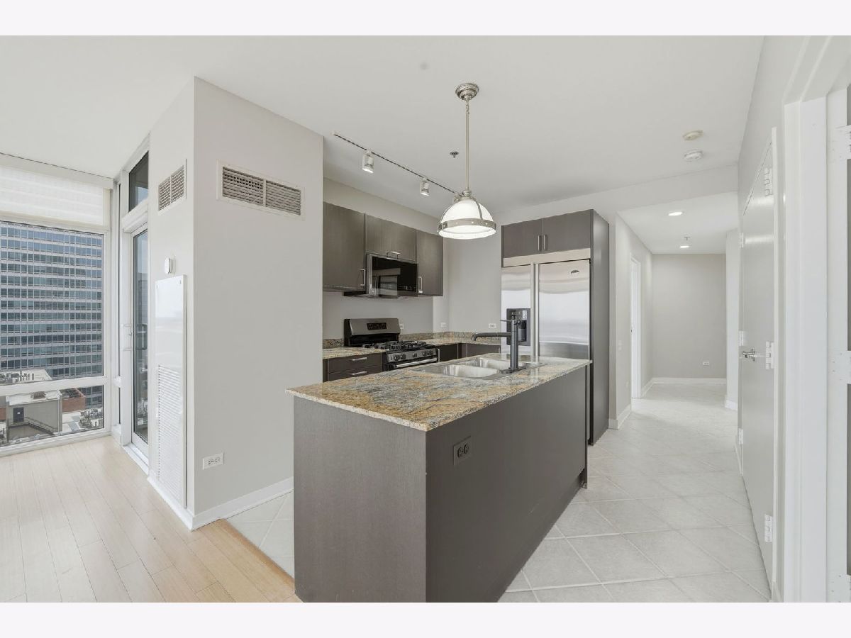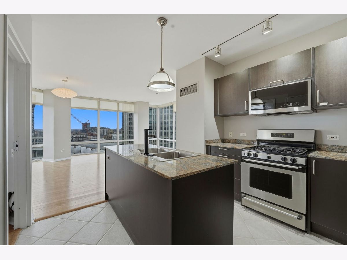 Stunning corner 2-bedroom, 2-bath residence featuring floor-to-ceiling windows in every room, offering unobstructed and endless north, south, and west views of Montgomery Park and the river. The sleek island kitchen is designed for both everyday living and entertaining, showcasing stainless steel appliances, rich chocolate Bulthaup cabinetry, granite countertops, and a spacious breakfast bar. Enjoy privacy and comfort with a desirable split-bedroom floor plan. The expansive ensuite primary suite features a custom bathroom vanity, soaking tub, and separate walk-in shower, creating a true retreat. A large private balcony off the living room offers breathtaking city views - perfect for relaxing or entertaining. Additional highlights include California closets throughout and an in-unit washer and dryer. Full-amenity building with 24-hour door staff, fitness center, and on-site management. Ideally located in vibrant River North, offering easy access to public transportation and expressways, and just steps from top restaurants, shopping, the East Bank Club, and a 2-acre park with dog park and riverwalk access. Includes storage locker #97 and two tandem heated garage parking spaces (#2-33 & #2-34).