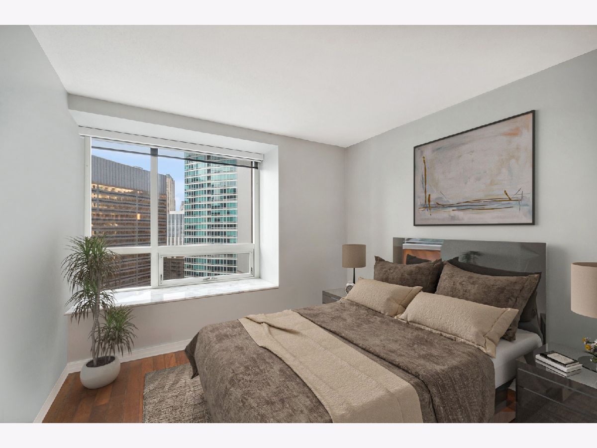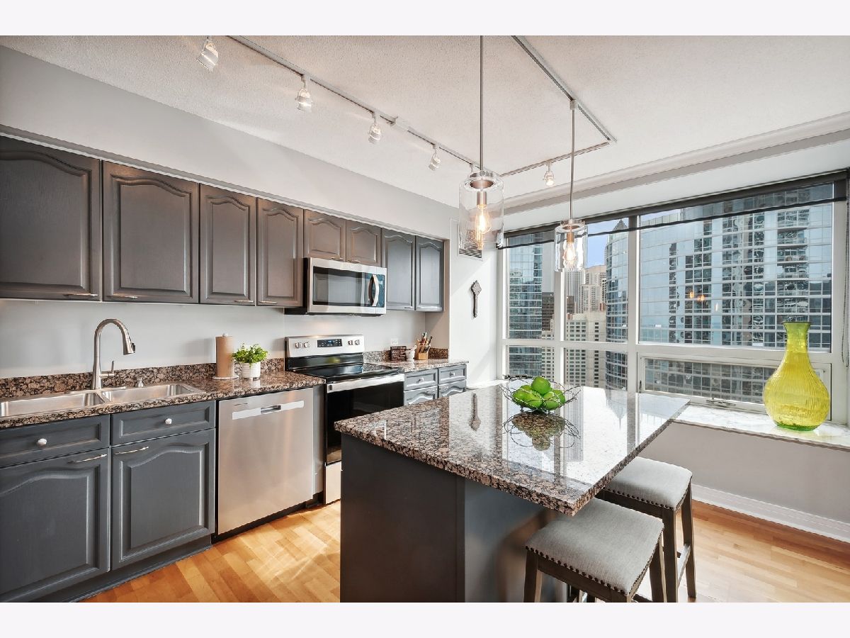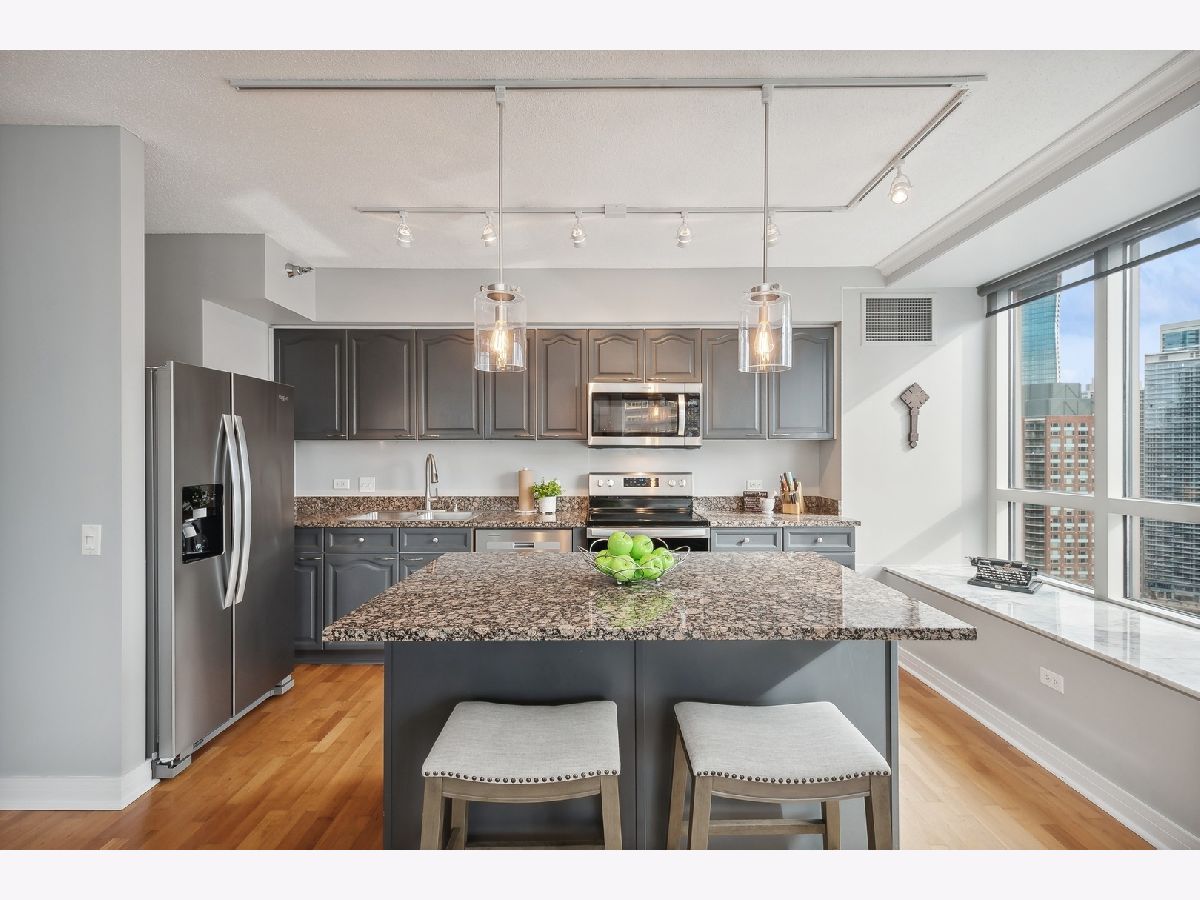 Beautiful 2 Bedroom 2 Bath in Streeterville with over 1445 sq ft of living space. You will be impressed with the spacious living and dining room and large, picturesque windows showcasing the skyline views. The condo features three exposures offering a light filled space with Views to the South, North and West. The grey toned galley kitchen offers plenty of cabinet space, an island with breakfast bar and all brand-new SS appliances. The split bedroom floor plan allows for privacy from the primary suite. The suite includes two huge windows, a walk-in closet, soffit lighting and bath with deep soaking tub/shower and new lighting. The secondary bedroom includes a wall of closets and space for a queen size bed. Newer washer and dryer in unit for your convenience. Great closets and storage. Full amenity, well-managed building with 24 hr. door staff, exercise room, entertainment suite and beautiful sundeck with grilling kitchens. Conveniently located to Whole Foods, Target, Walgreens and the AMC Movie Theater and countless restaurants. Rental Parking available.