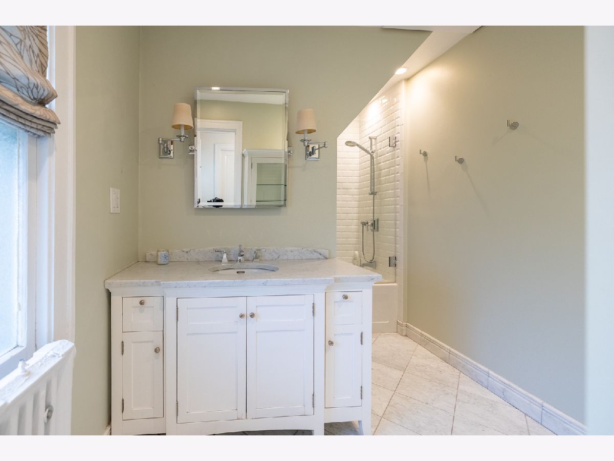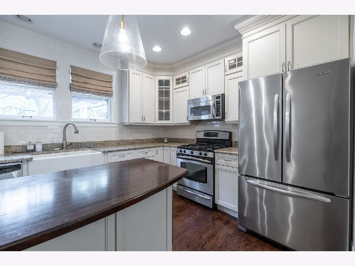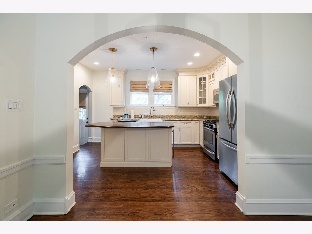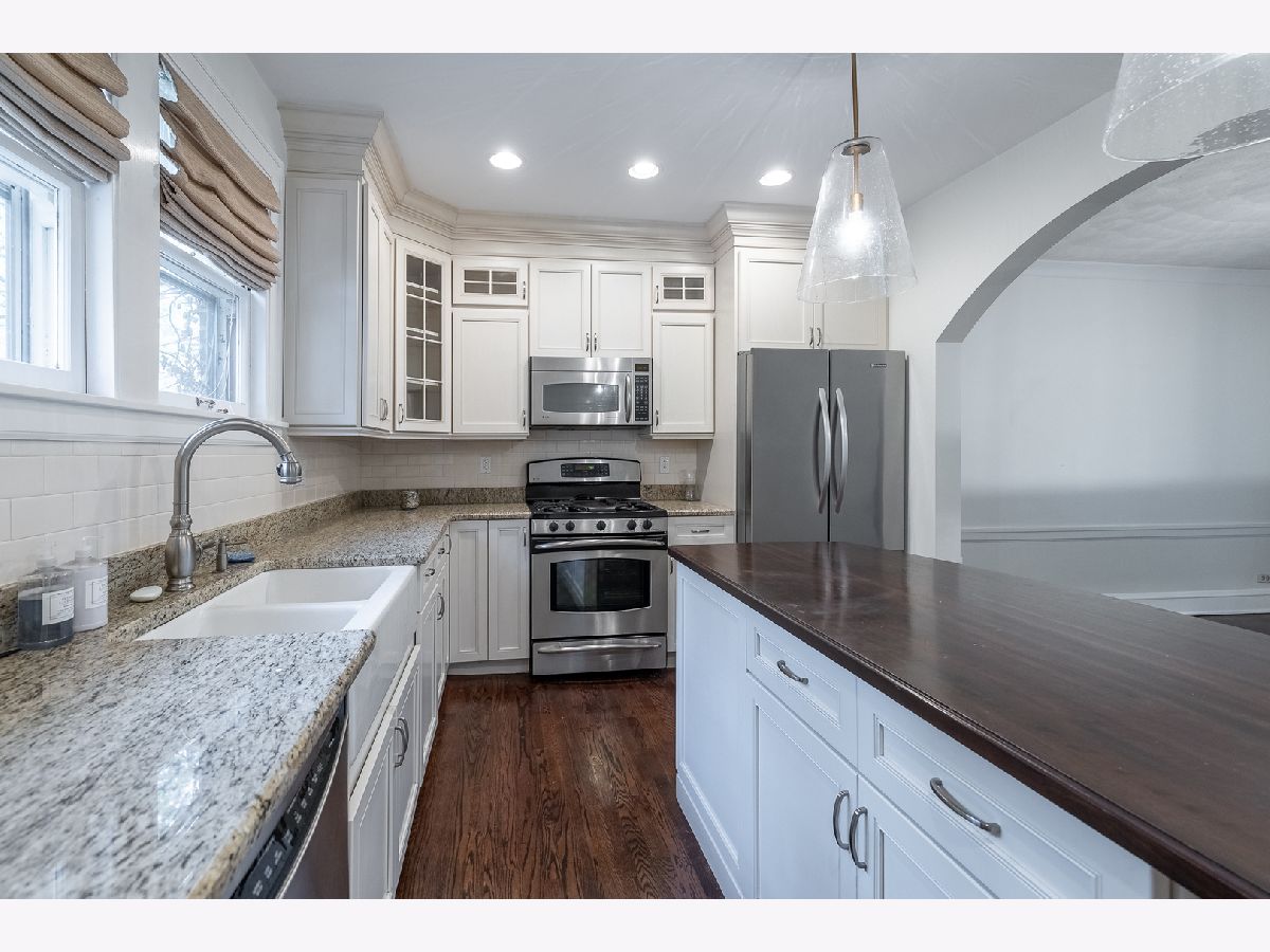 Elegant updated Tudor welcomes you in with grand entry, brick paver driveway and mature landscape. Fully renovated kitchen features custom cabinetry, granite, stainless appliances, farmhouse sink, center island/breakfast bar with dark hardwood countertop, storage and wine fridge. Kitchen complete with built in pantry to keep you organized, opens to dining room with newer chandelier for elegant dinners. Three bedroom, two bath home with with elegant hardwood floors, arched doorways, beautifully appointed trim & molding with designer lighting throughout home. Large Living room is centered around brick fireplace. French doors lead to private deck with pergola, columns and wide stairs opening to great backyard with stone patio and built in firepit. 2nd floor includes the primary bedroom with french doors to closet with custom built in organizers. Bedrooms are spacious with walk-in closets. Full hall bathroom updated with elegant fixtures, marble floors, sconce lighting, large vanity and newly tiled tub/shower. Finished basement with rec room, built in bar with sink & fridge. Bonus room in basement for office with large closet. Full bathroom with large shower. Laundry room with counter space and storage. Location is a half block from South Middle School, 5 block walk to downtown Arlington Heights & Metra Station and a couple blocks to award winning Pioneer Park with Swimming/Tennis/Basketball/Baseball/Walking & Running Path and Playground). No smoking. One pet allowed with approval and pet rent. Renters Insurance Required