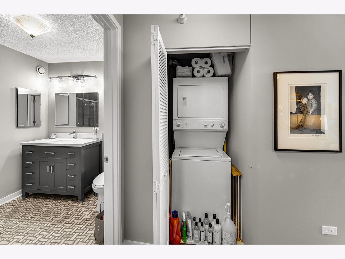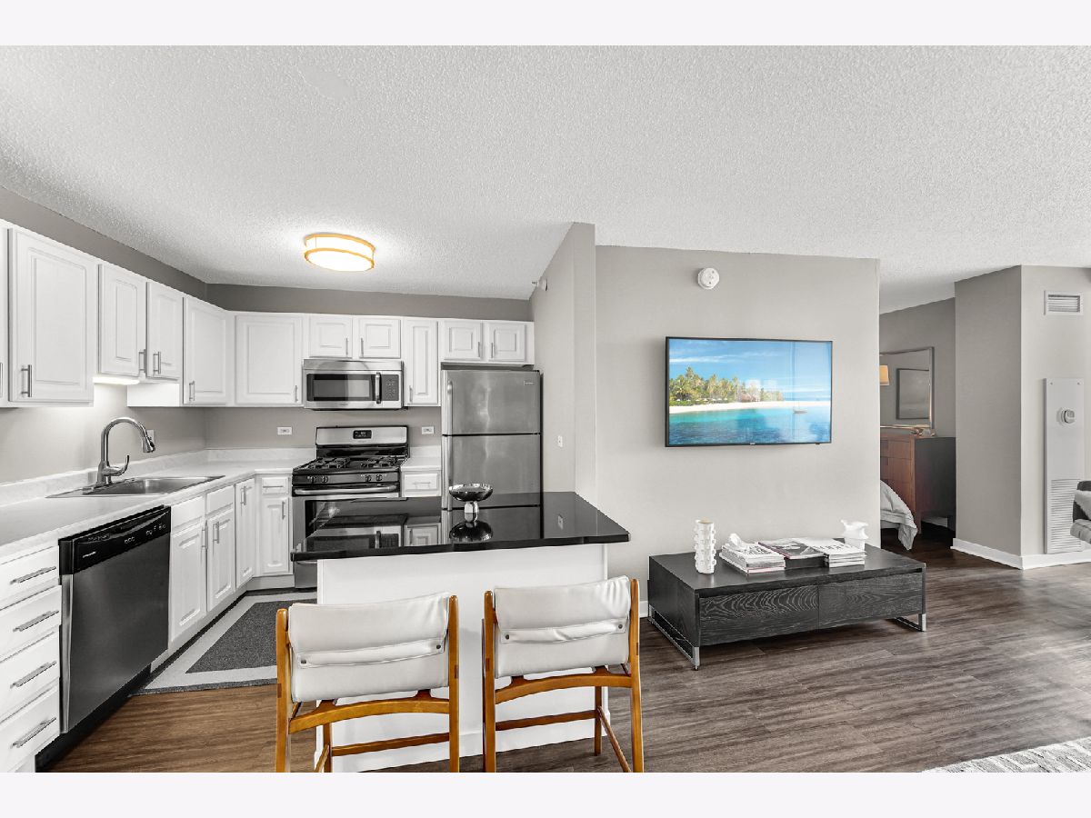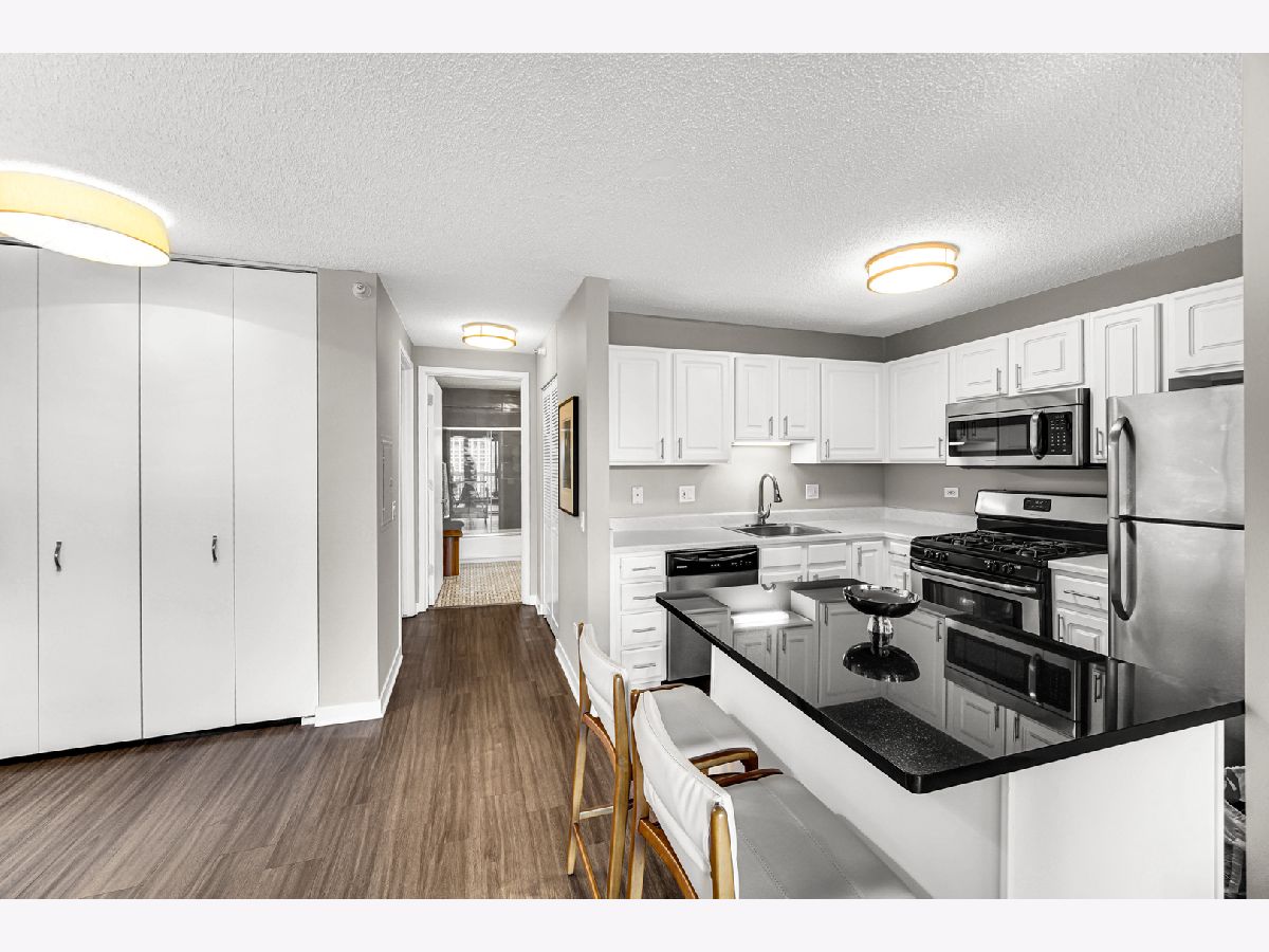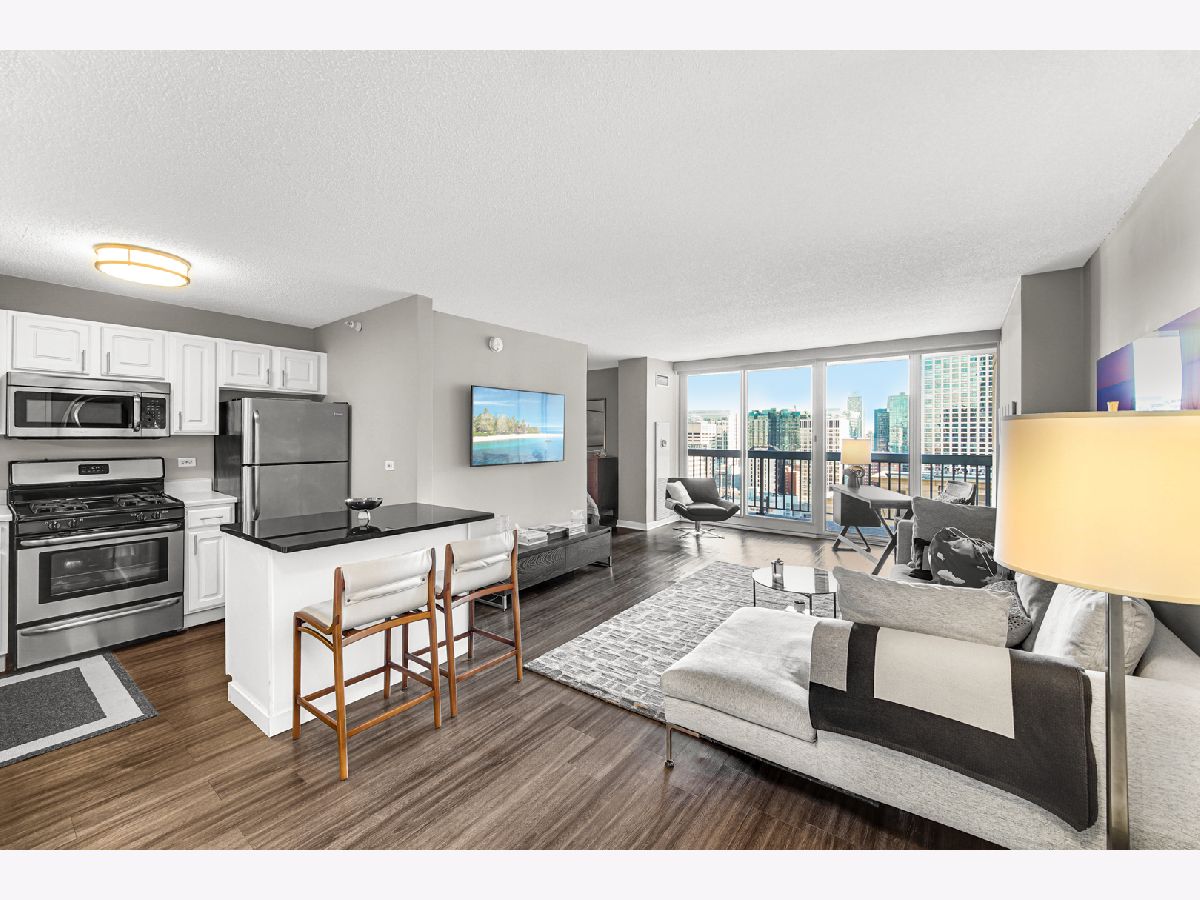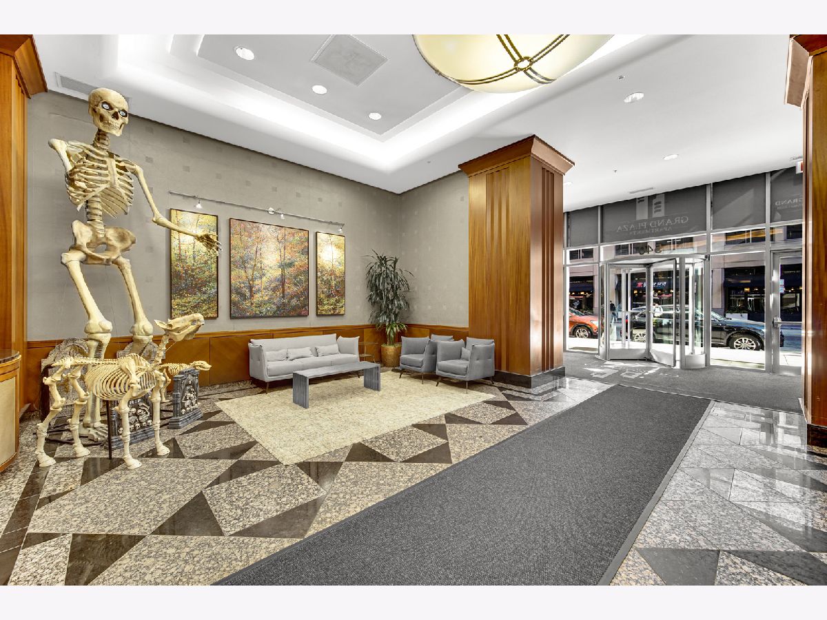 Stunning highly updated unit at The Residences at Grand Plaza. This Large Junior 1 bedroom, 1 bath condo offers a fabulous floorplan and tons of natural light. Enjoy an open concept unit with in-unit washer/dryer, multiple spacious closets including a walk-in closet, all w/ elfa organizers, white kitchen cabinets + island with granite countertop and SS appliances. Newer custom window treatments, vinyl plank flooring, fully renovated bathroom, and updated light fixtures throughout. Enjoy the sunrise with an East facing view complete with large balcony and gorgeous City views. This full amenity building features: Health club with Outdoor running track, Sundeck with grills, Outdoor pool, Party Room, Business Center, Game Room, Library, and Steam & Sauna Room. CTA red line is just steps. Walk to everything! Restaurants, Nightlife and Shopping just steps away. All utilities included in rent other than electricity. Leased parking is available onsite.