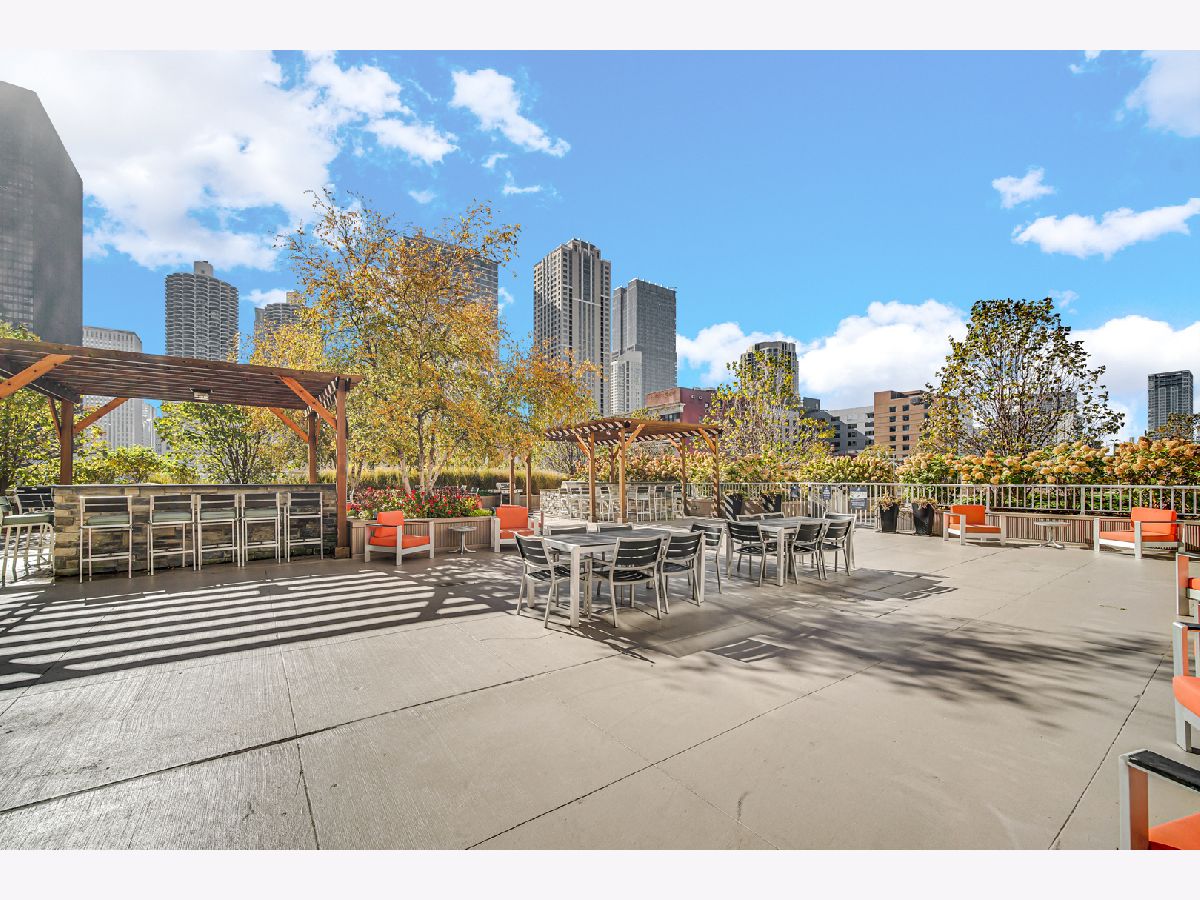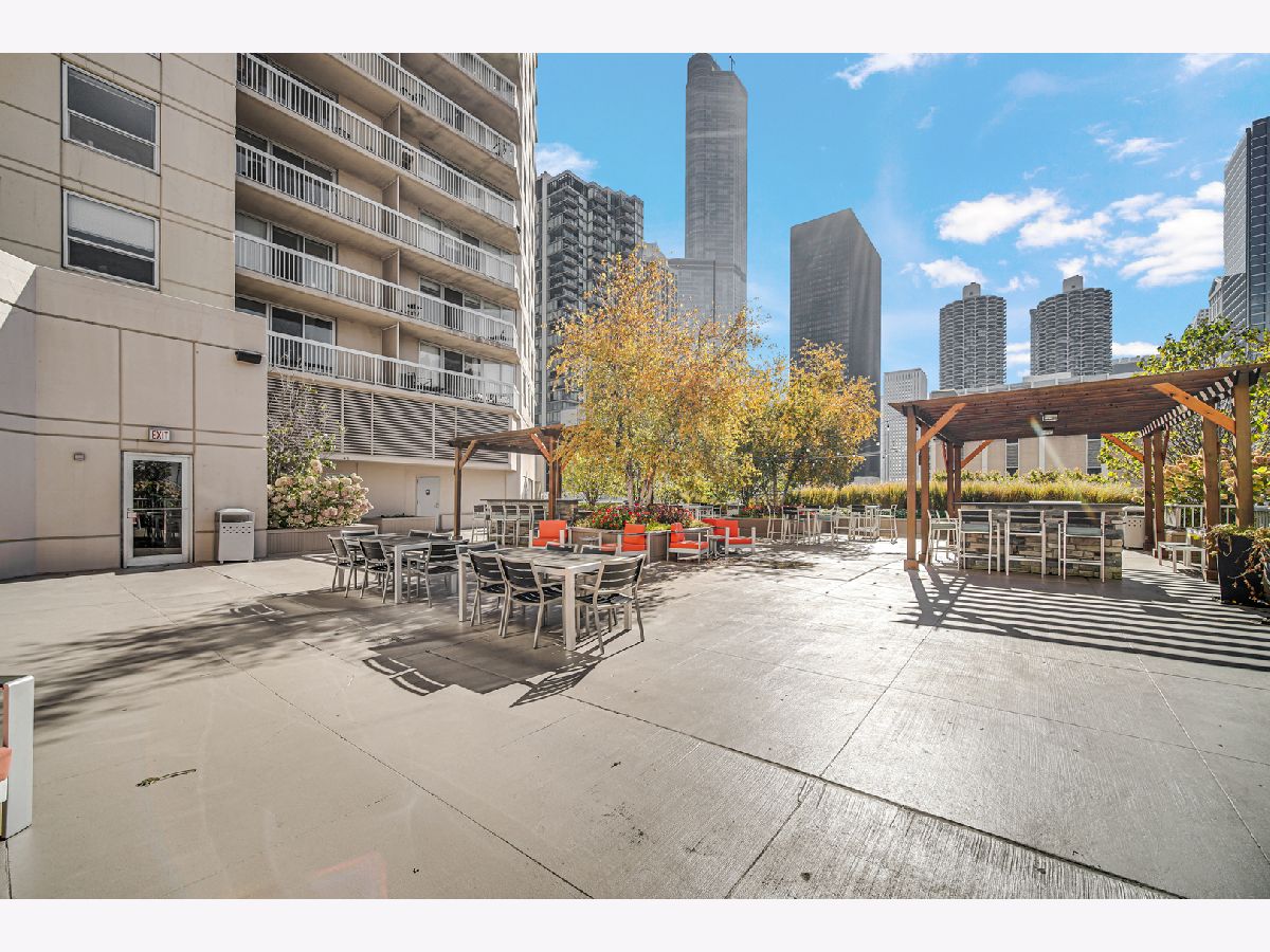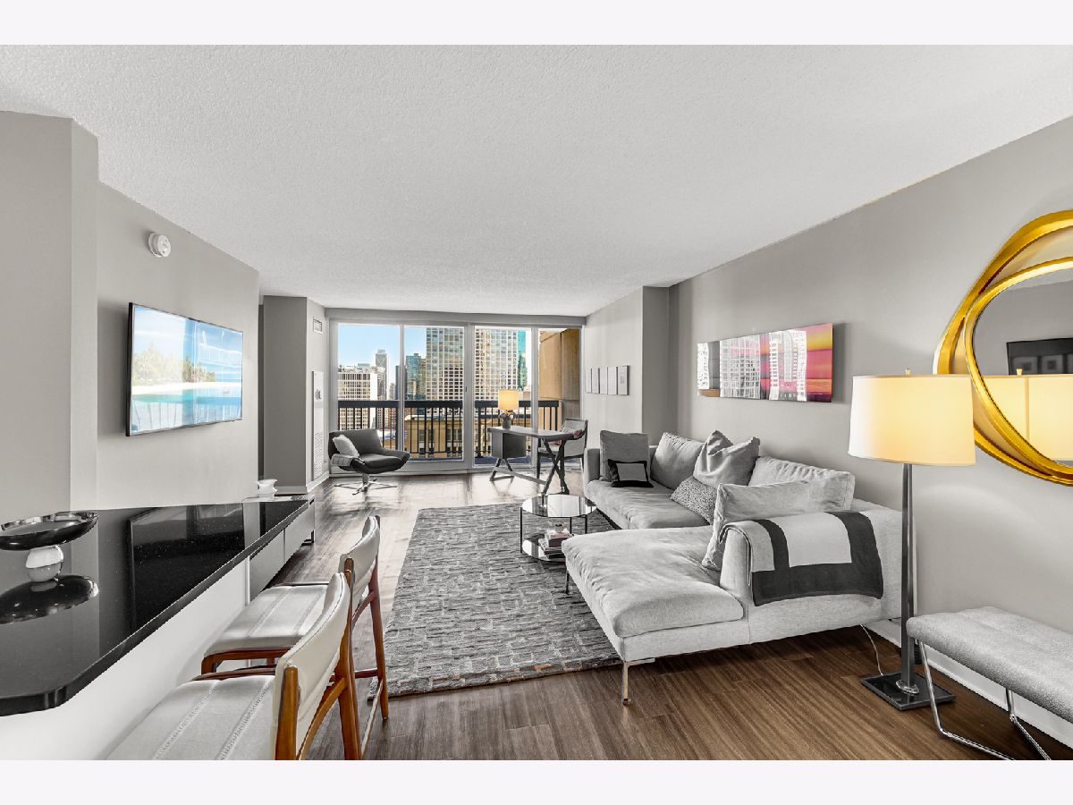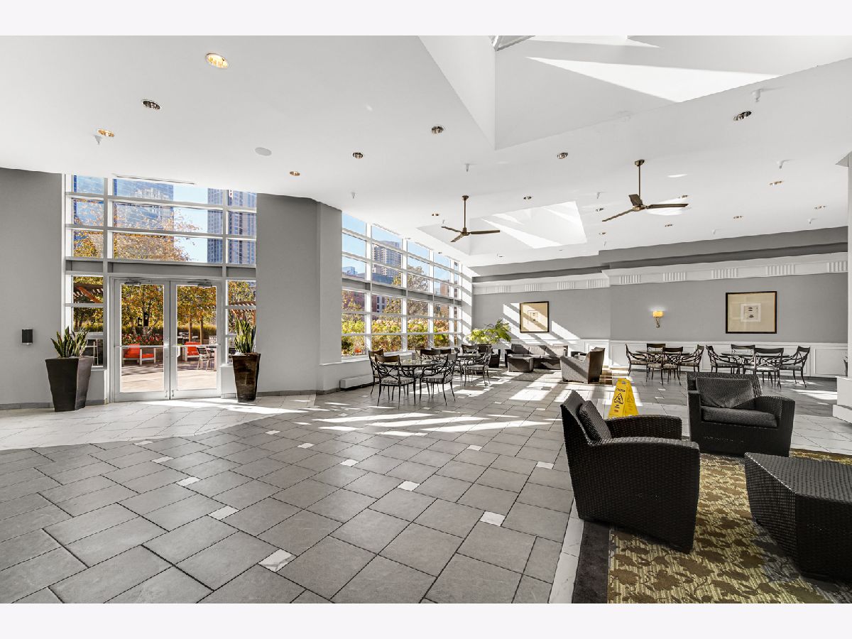 Stunning highly updated unit at The Residences at Grand Plaza. This Large Junior 1 bedroom, 1 bath condo offers a fabulous floorplan and tons of natural light. Enjoy an open concept unit with in-unit washer/dryer, multiple spacious closets including a walk-in closet, all w/ elfa organizers, white kitchen cabinets + island with granite countertop and SS appliances. Newer custom window treatments, vinyl plank flooring, fully renovated bathroom, and updated light fixtures throughout. Enjoy the sunrise with an East facing view complete with large balcony and gorgeous City views. This full amenity building features: Health club with Outdoor running track, Sundeck with grills, Outdoor pool, Party Room, Business Center, Game Room, Library, and Steam & Sauna Room. CTA red line is just steps. Walk to everything! Restaurants, Nightlife and Shopping just steps away. All utilities included in rent other than electricity. Leased parking is available onsite.