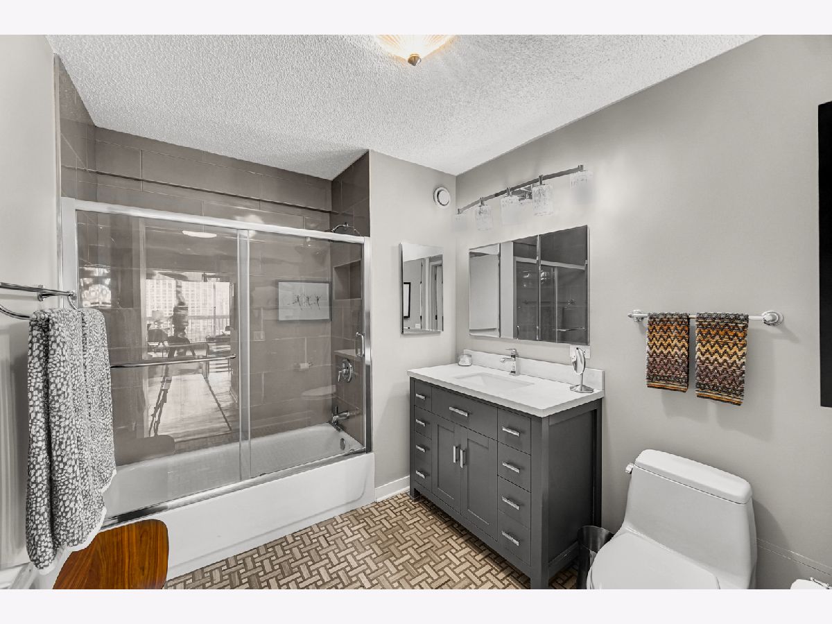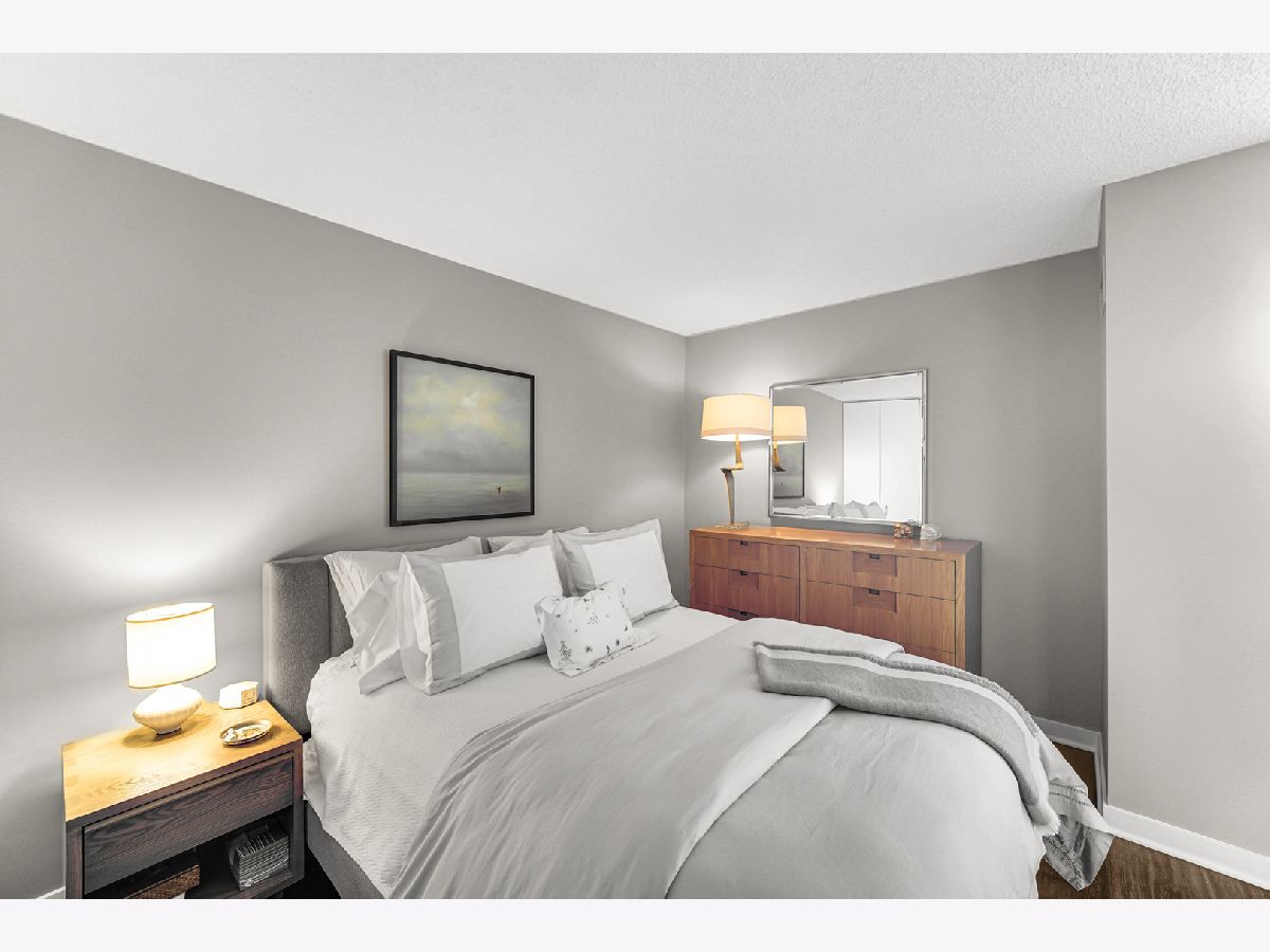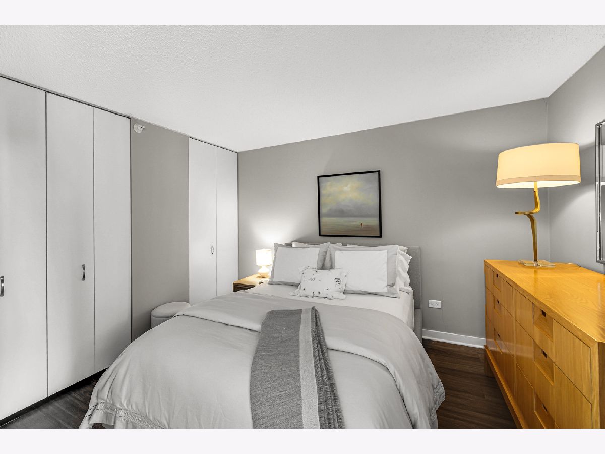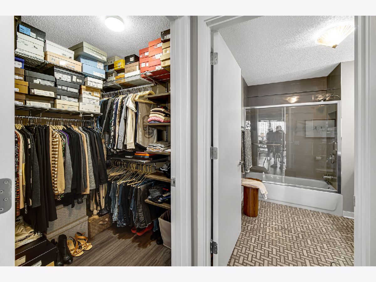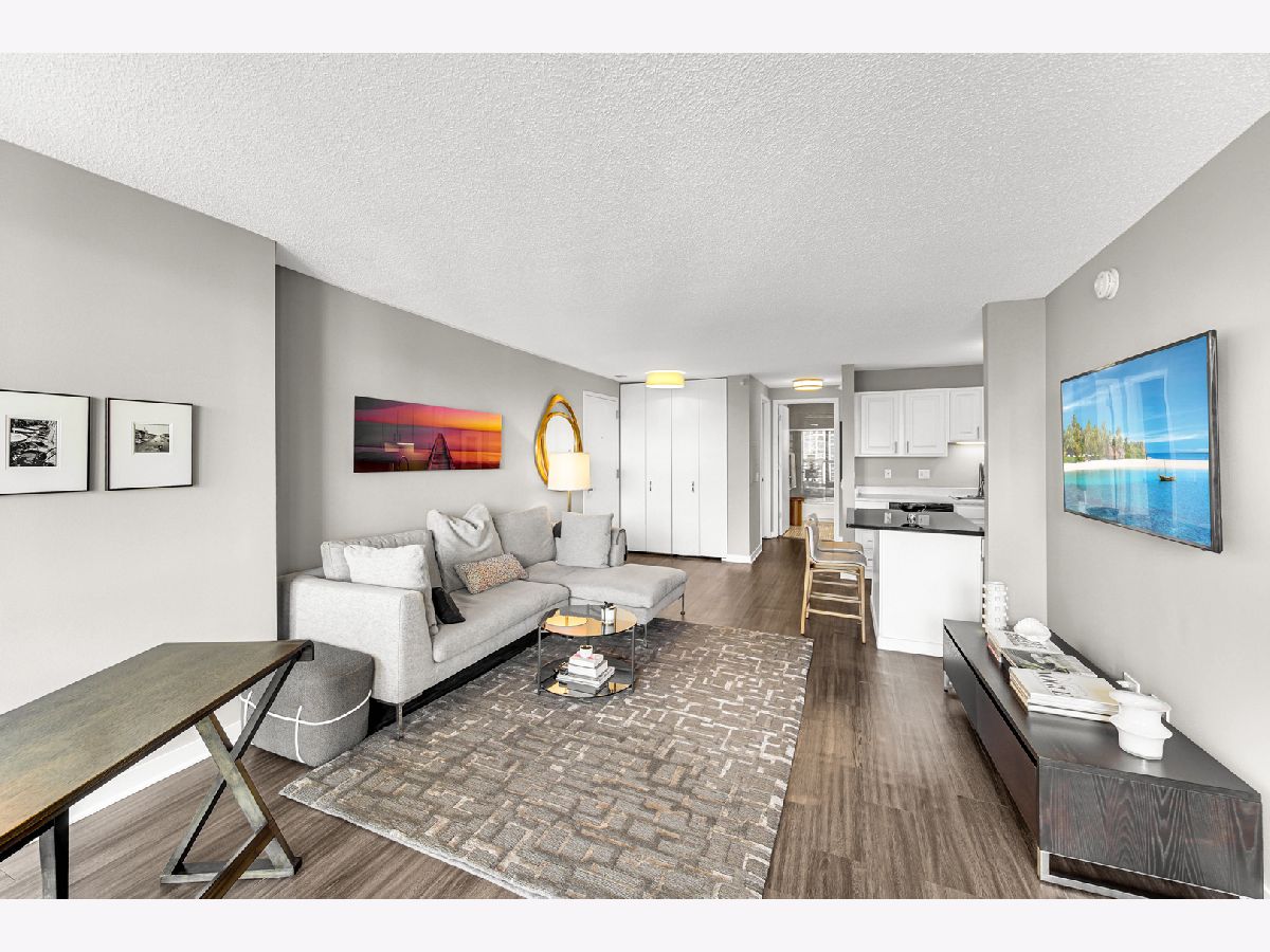 Stunning highly updated unit at The Residences at Grand Plaza. This Large Junior 1 bedroom, 1 bath condo offers a fabulous floorplan and tons of natural light. Enjoy an open concept unit with in-unit washer/dryer, multiple spacious closets including a walk-in closet, all w/ elfa organizers, white kitchen cabinets + island with granite countertop and SS appliances. Newer custom window treatments, vinyl plank flooring, fully renovated bathroom, and updated light fixtures throughout. Enjoy the sunrise with an East facing view complete with large balcony and gorgeous City views. This full amenity building features: Health club with Outdoor running track, Sundeck with grills, Outdoor pool, Party Room, Business Center, Game Room, Library, and Steam & Sauna Room. CTA red line is just steps. Walk to everything! Restaurants, Nightlife and Shopping just steps away. All utilities included in rent other than electricity. Leased parking is available onsite.