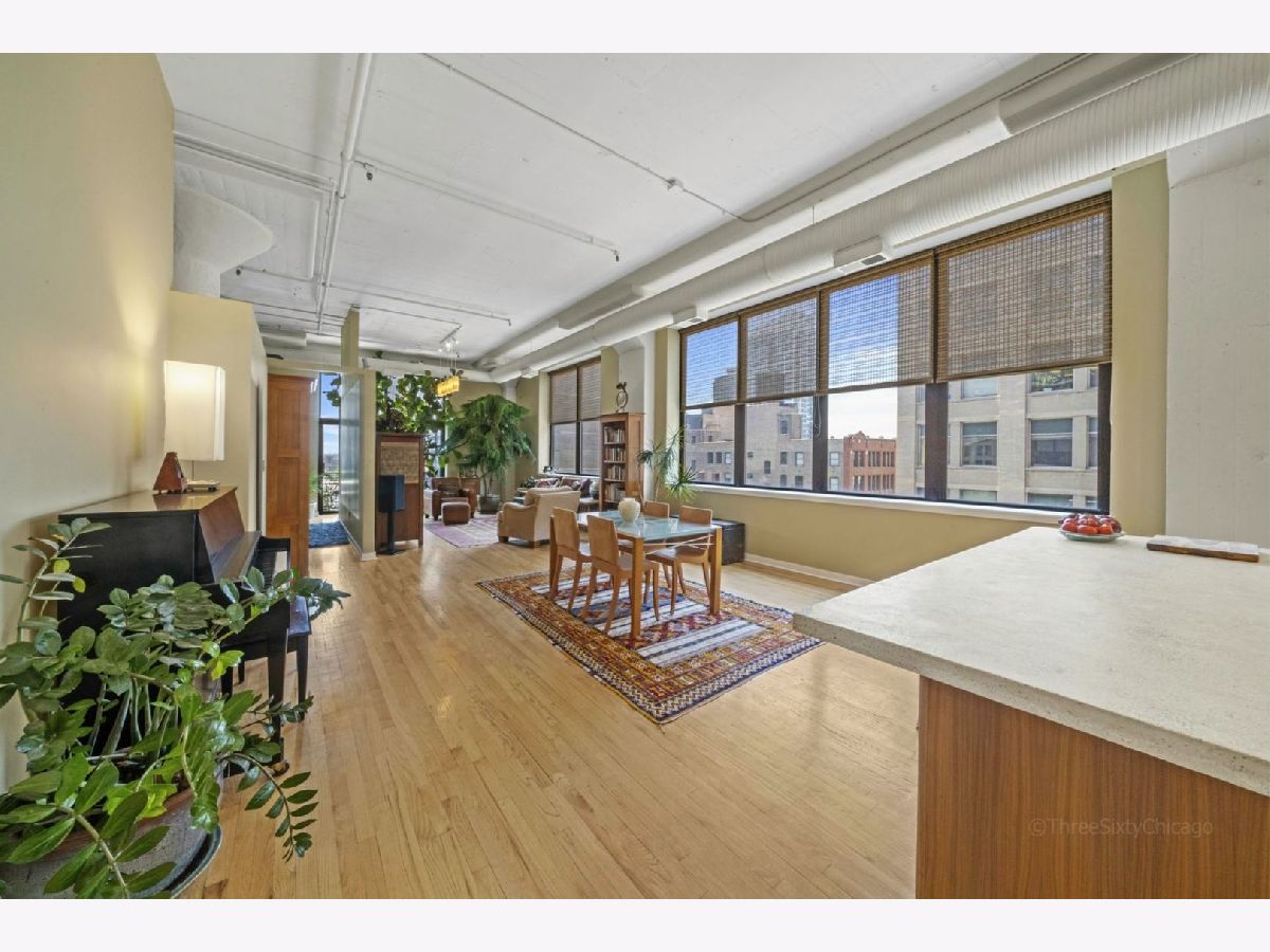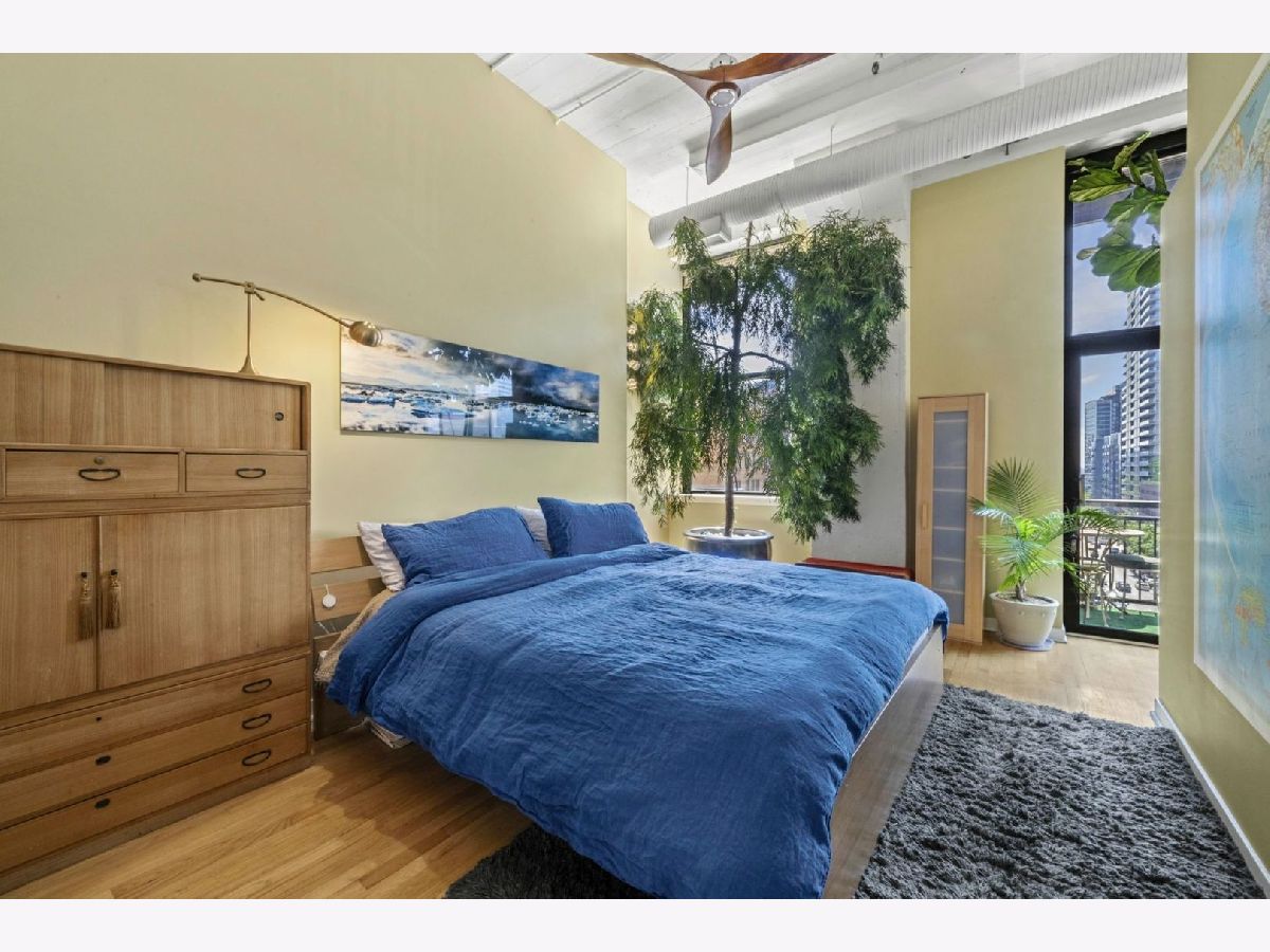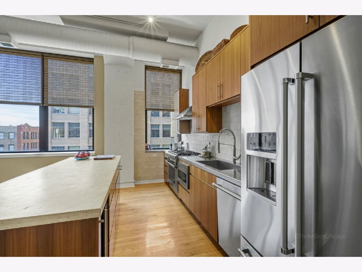 Beautiful sun-drenched SW corner unit with private balcony at Harrison St Lofts in historic Printers Row. This true concrete loft two bed/ two bath unit features soaring 12 ft ceilings with beautiful hardwood flooring and an extra large open concept living area featuring a cozy fireplace that makes for an amazing entertaining space. The recently updated kitchen features high end stainless appliances including a Thermador range, amazing stainless countertops with integrated sink and a huge island topped with polished concrete featuring a built-in wine fridge and tons of cabinet space. The spacious main bedroom suite has a walk-through closet leading to the spa-like master bath. This beautiful unit is move-in ready! Exercise room, water, cable and Internet included in the rent. Heated garage parking available in building for additional 250 per mo. Bike storage in building. Great location near Blue Line, Red Line, I-290, 90/94 and Lakeshore Drive. Walk to the Lake, Museums, Millennium Park, Restaurants, Shopping, Nightlife. Click link above for 3D Tour!