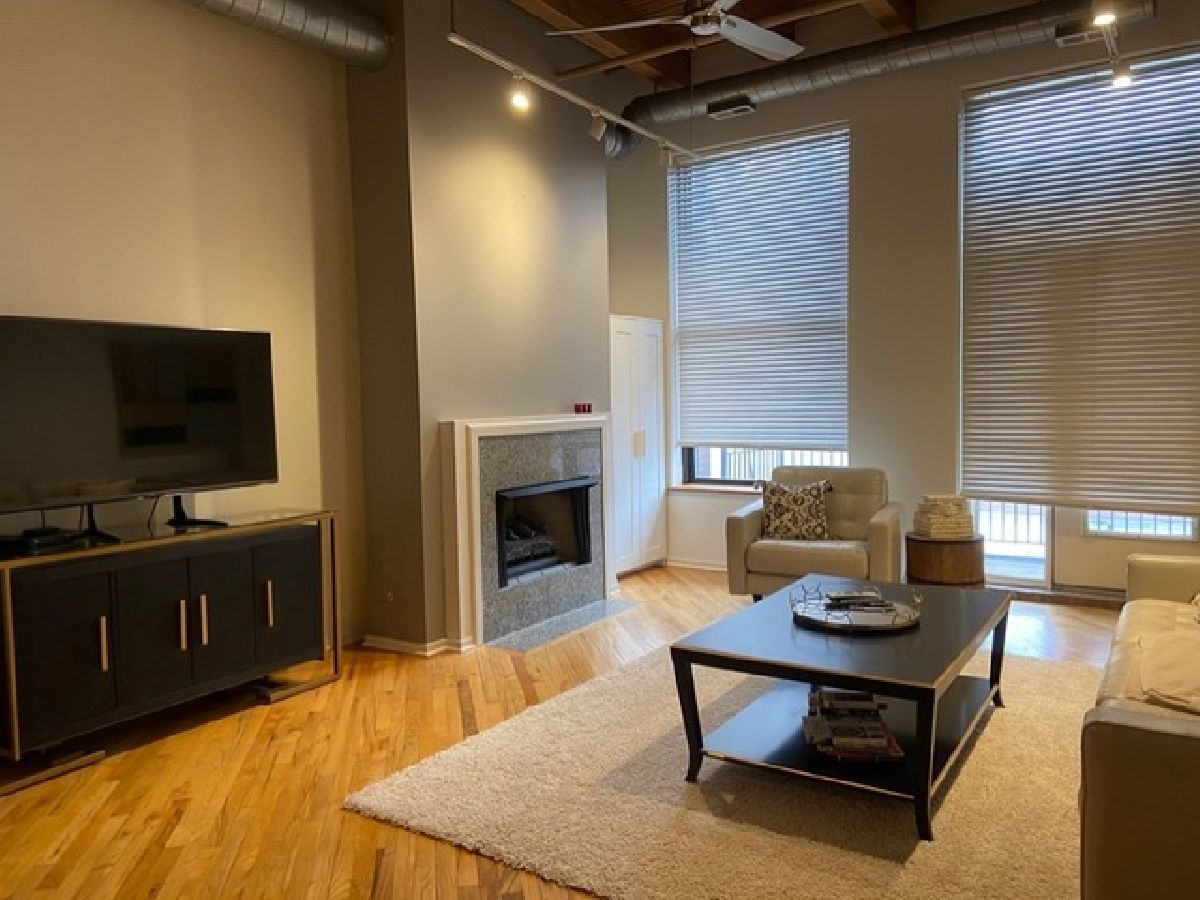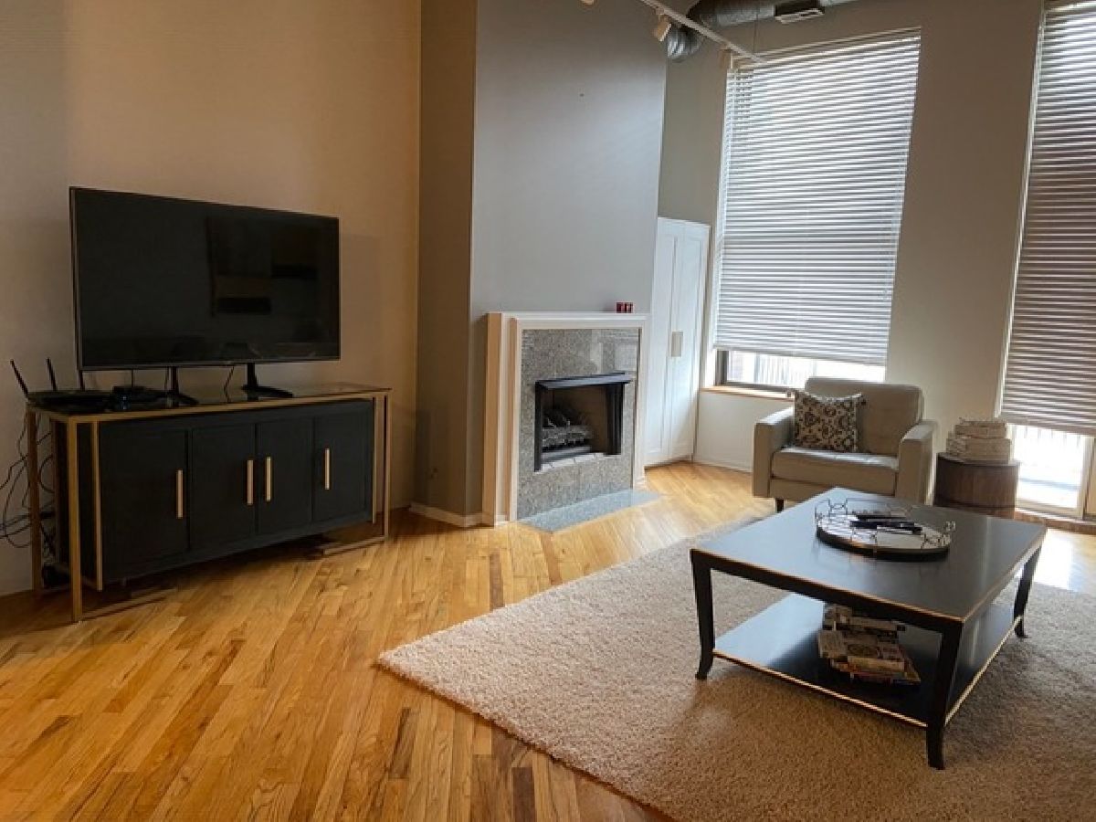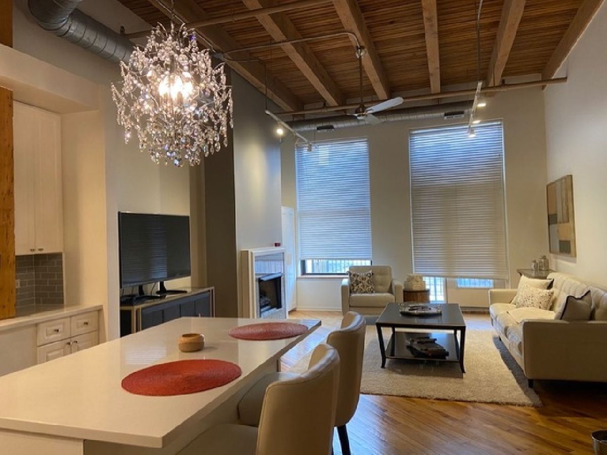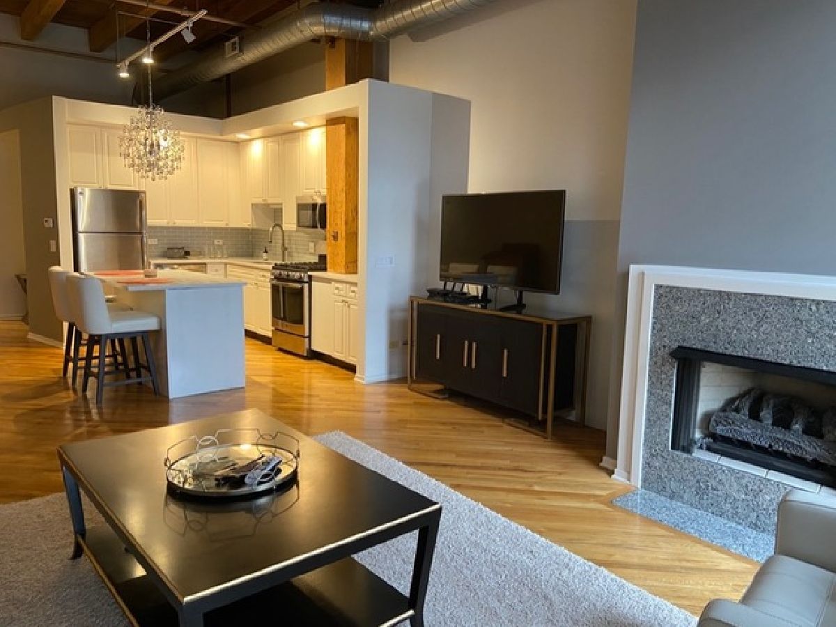 Stunning one bedroom. 1.5 bath gut rehabbed true loft at China Club Lofts on Fulton Street in the West Loop features gorgeous new kitchen with quartz countertops, stainless steel appliances, gas oven/range, built-in microwave, dishwasher, fridge, large, open living/dining room, marble surround fireplace, beautiful hardwood floors, central air, new bathroom fixtures, large bedroom, great closet and storage space, 14' wood beamed ceilings, skyline views, private deck, in-unit laundry, Direct TV and Internet included, exercise room, doorman, and garage parking included! This unit also features a huge bonus room right across the hall, can be used for storage, office, guest room, etc. Located steps from the river walk, park, Metra, El, expressway, Fulton Market, Randolph Street Restaurant Row, the Loop and East Bank Club! DirectTV and internet included in rent! VIDEO TOUR LINK ON BROKER REMARKS