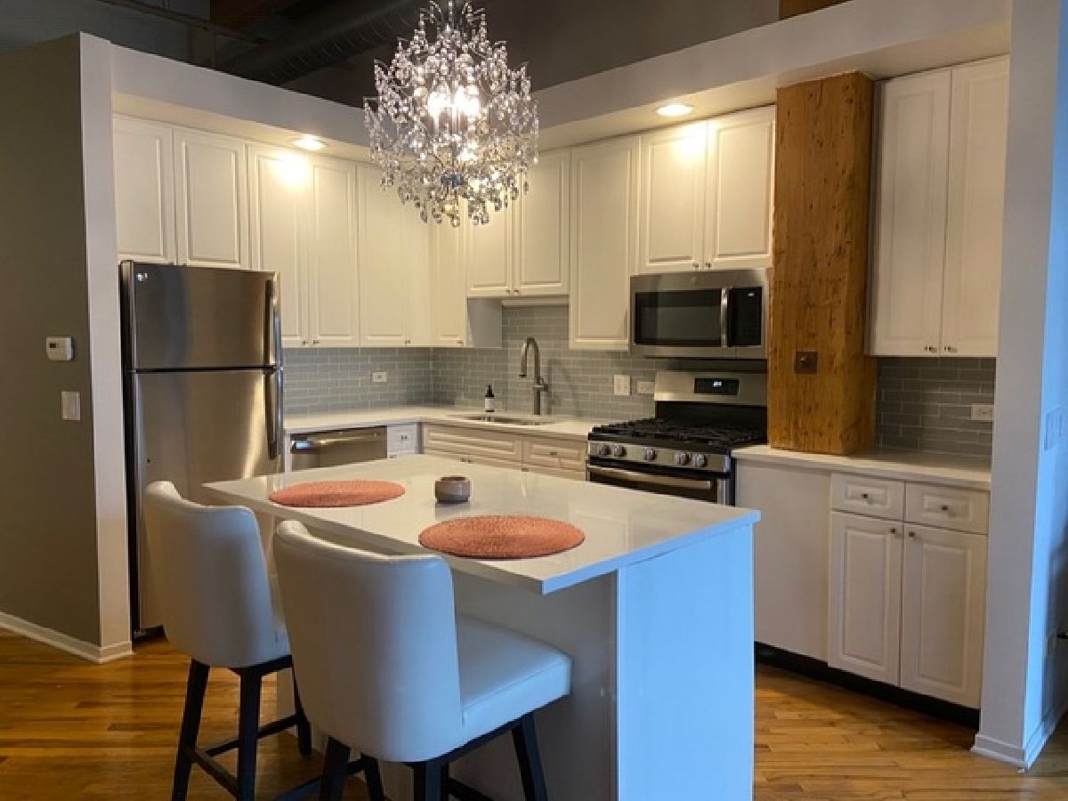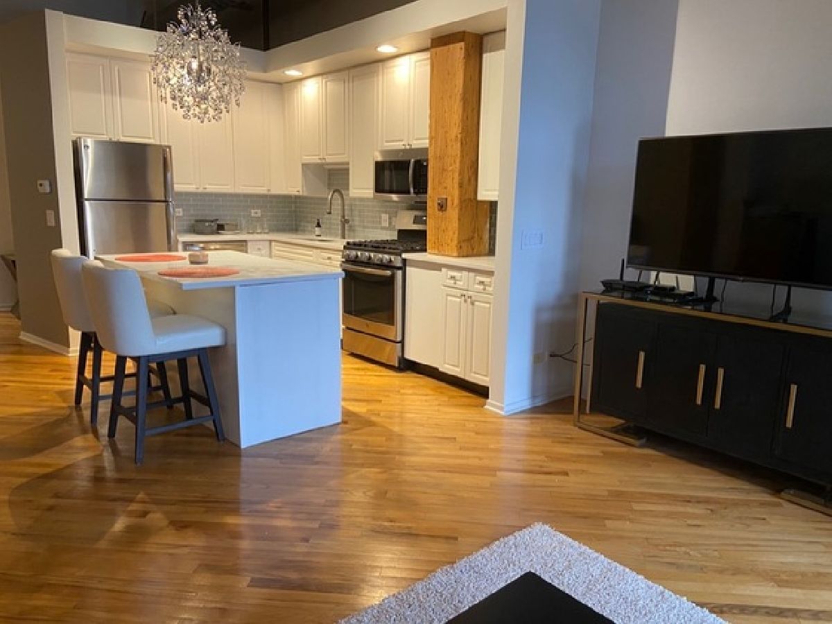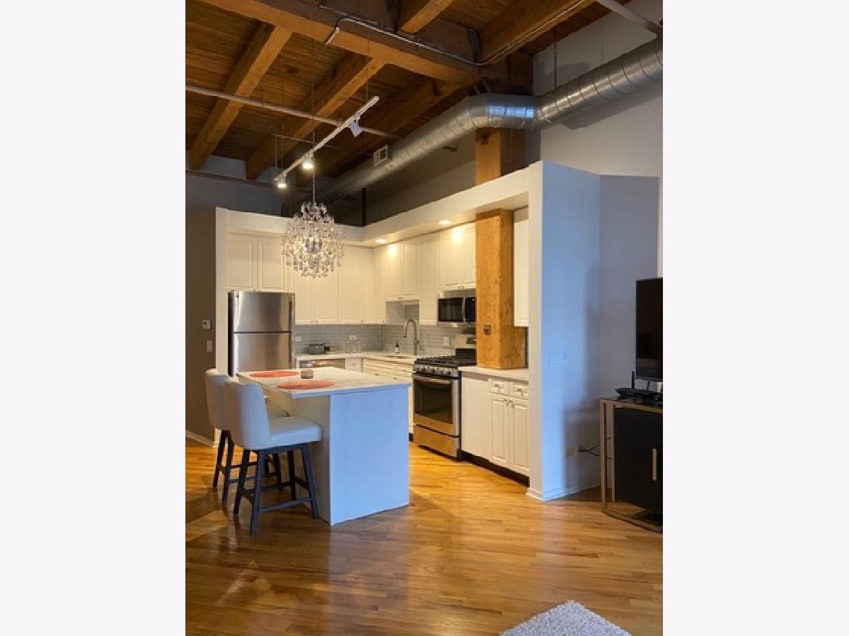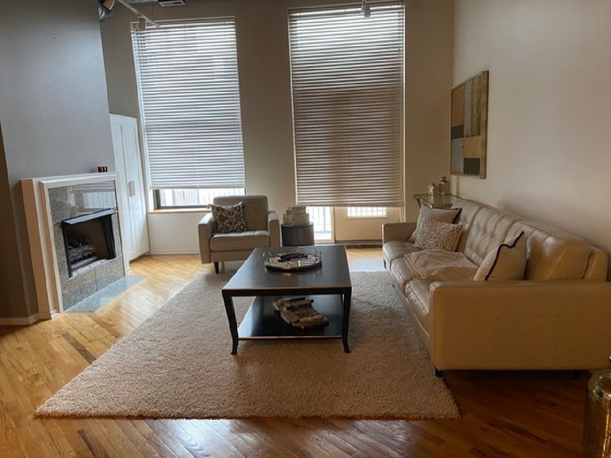Stunning one bedroom. 1.5 bath gut rehabbed true loft at China Club Lofts on Fulton Street in the West Loop features gorgeous new kitchen with quartz countertops, stainless steel appliances, gas oven/range, built-in microwave, dishwasher, fridge, large, open living/dining room, marble surround fireplace, beautiful hardwood floors, central air, new bathroom fixtures, large bedroom, great closet and storage space, 14' wood beamed ceilings, skyline views, private deck, in-unit laundry, Direct TV and Internet included, exercise room, doorman, and garage parking included! This unit also features a huge bonus room right across the hall, can be used for storage, office, guest room, etc. Located steps from the river walk, park, Metra, El, expressway, Fulton Market, Randolph Street Restaurant Row, the Loop and East Bank Club! DirectTV and internet included in rent! VIDEO TOUR LINK ON BROKER REMARKS