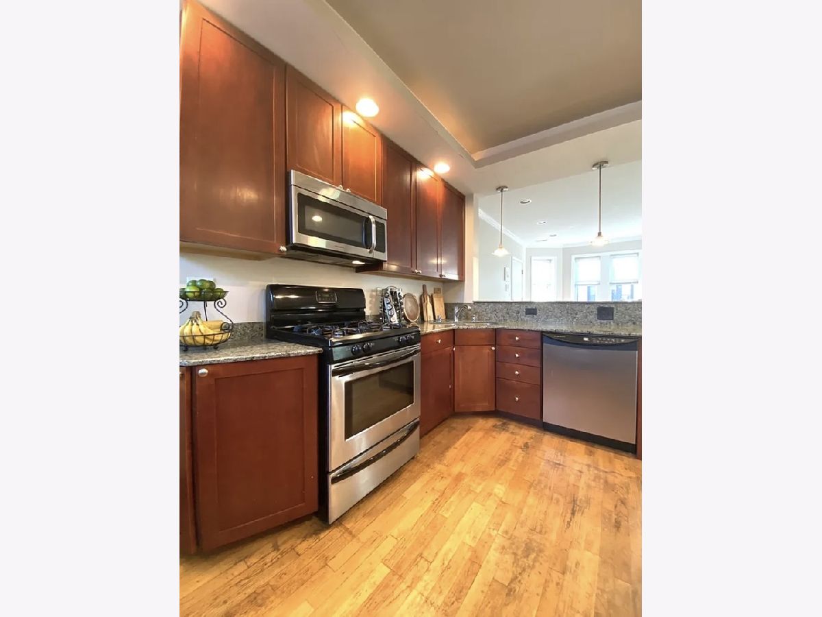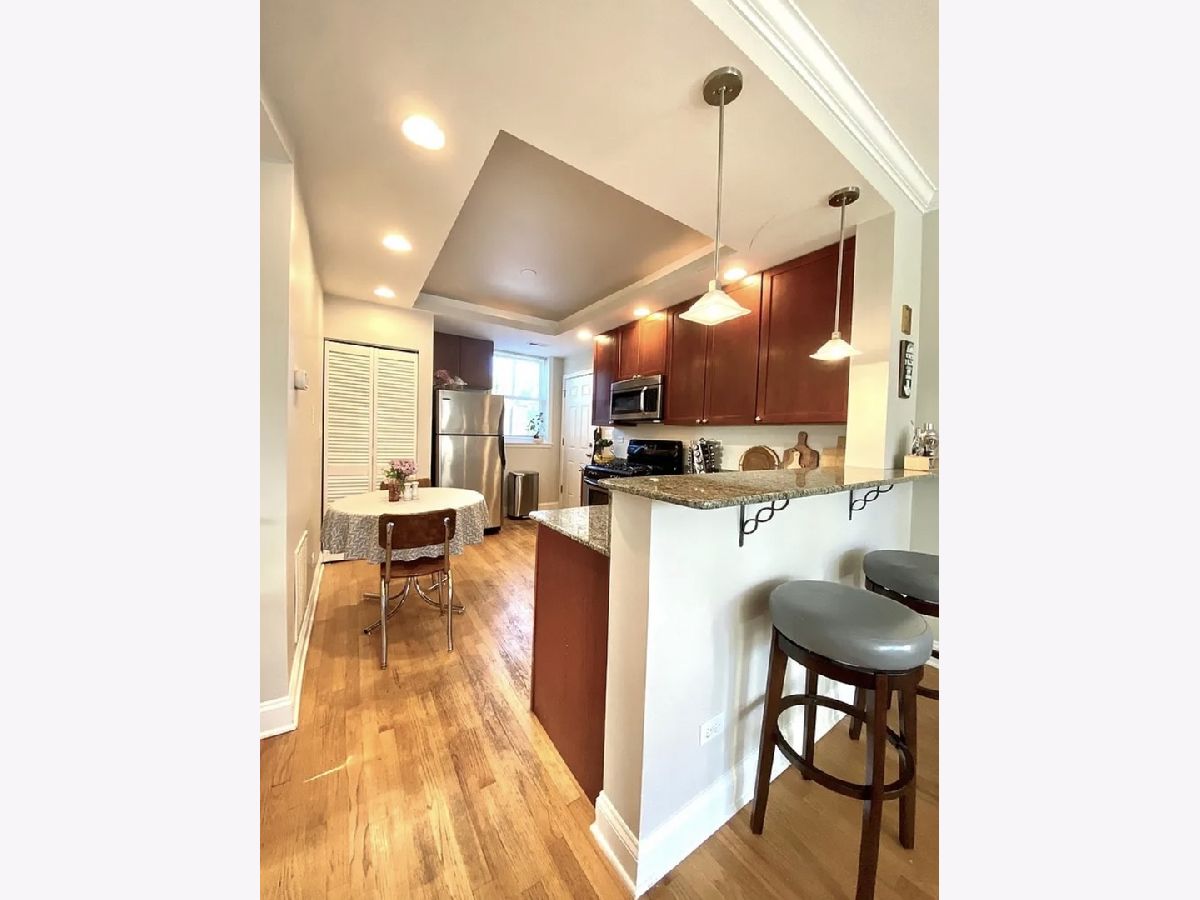 Bright, move-in-ready 2 bedroom, 1 bath condo with treetop views in a fantastic location. Freshly painted with newly redone hardwood floors, this unit features a spacious living room and eat-in kitchen with breakfast bar. The kitchen includes granite countertops, stainless steel appliances, and 42" cabinets. Generous bedrooms offer great closet space. Additional highlights include in-unit laundry, central air, a private outdoor sitting area, and extra storage. No shared common walls provide added privacy. Set on a tree-lined street with easy street parking, just a short walk to the Metra and Honey Bear Cafe. Tenant responsible for heat, electric and internet. Available for immediate occupancy.