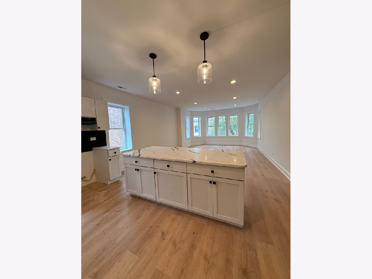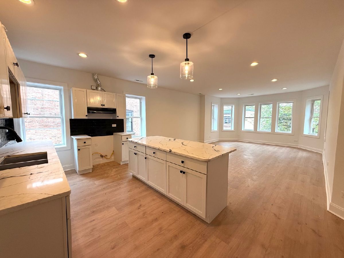This beautiful 2 bedroom, 1 bathroom unit located in South Shore has been fully rehabbed in 2025. Be the first to live in this unit while everything is brand new! It is located on the top floor of a well-maintained 3 story building. The spacious, open concept living area is framed by large windows providing an abundance of natural light. The contemporary kitchen has white shaker cabinets, a sleek black tile backsplash, and an island perfect for entertaining or dining. The large bathroom keeps the same modern black and white color scheme. It has central air and there is laundry in the building. You will be minutes from Lake Michigan, Jackson Park, the South Shore Cultural Center, and easy transportation via CTA and Metra.