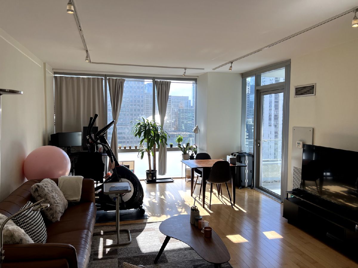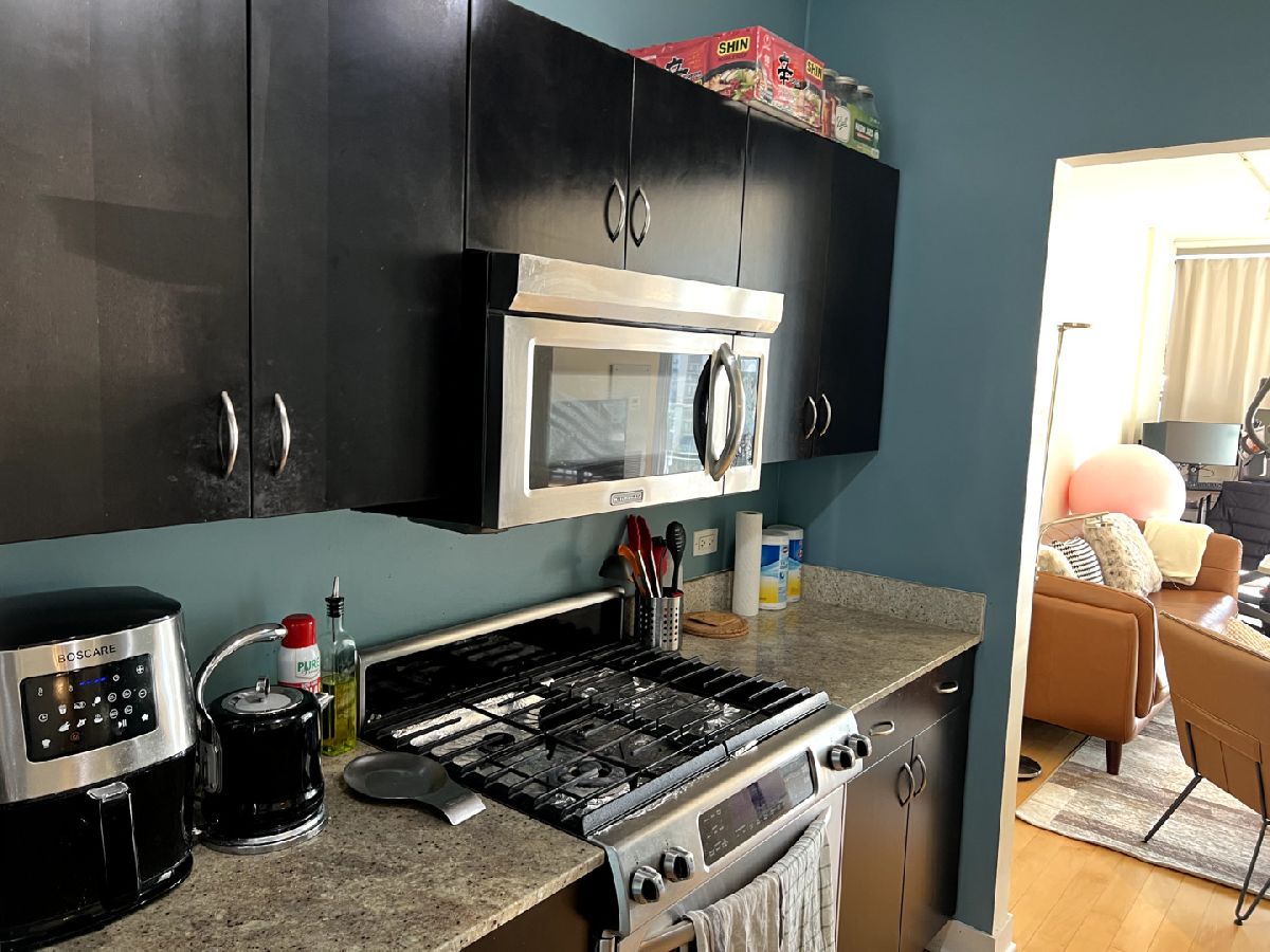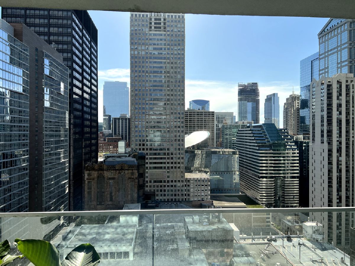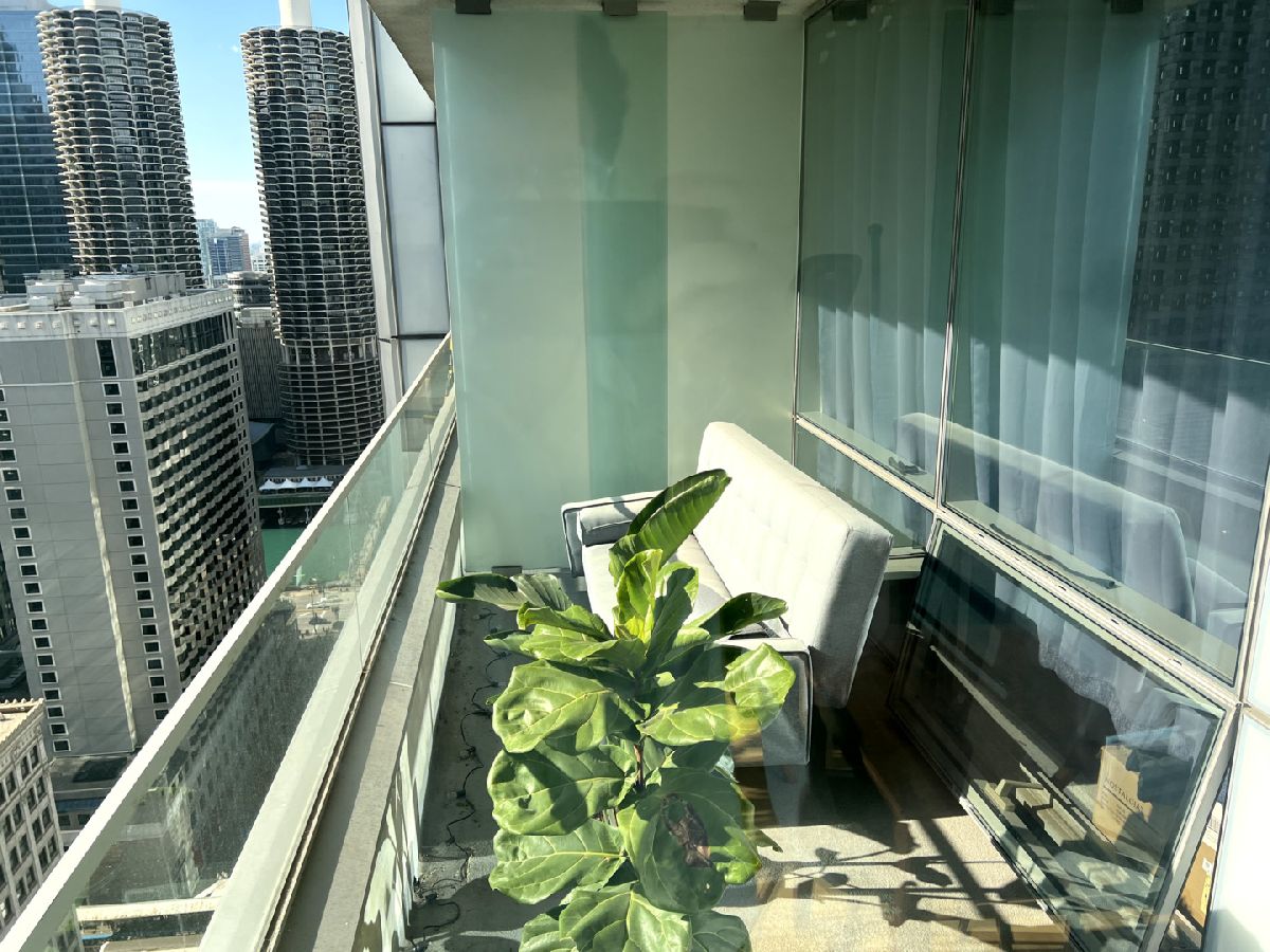 Spacious one bedroom at Joffrey Towers. Large king-sized bedroom with a full wall of closets. Side by side in-unit laundry is located right outside the bedroom door. The stylish kitchen includes granite counters with a breakfast bar, stainless steel appliances and dark cabinets. The living dining room combination has a wall of West-facing windows with great city views. A covered balcony off the living room provides private outdoor space. Gym and party room in building. Located steps from CTA, Grant Park and Michigan Ave.