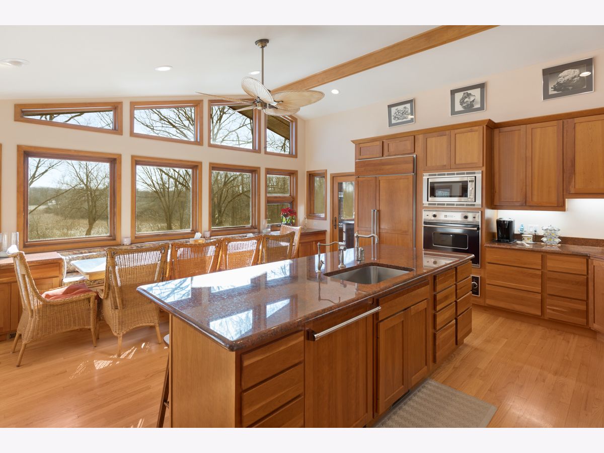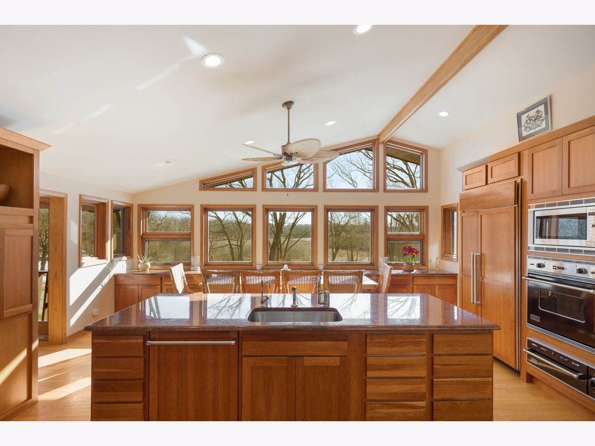 A Nature Lovers paradise with breathtaking, rolling, hillside views of the 1.5 acre property from both upper & lower levels of this custom-built home in Acorn Acres. Backs to protected wetlands - ensuring your views and privacy. This meticulously maintained stone & cedar ranch with full walkout lower level was designed to embrace the natural surroundings. The open foyer invites you in and the main level living space with vaulted ceiling is framed by a wall of windows that makes you want to stay and enjoy the serene views. The open & bright main kitchen has a huge island and seats 10 comfortably at table - a Chef's dream with Viking gas 6 burner + griddle cooktop & professional hood vent with lights, warming drawers, subzero fridge, reverse osmosis water system, Cherry Wood cabinets with pull out shelves and corner lazy Susans - even has a convenient dumb waiter that connects the upper kitchen to lower with the push of a button. The rest of the main level is thoughtfully laid out to include Primary bedroom, 2 full baths, versatile office/bedroom, laundry & screened porch - all doorways & hall are extra wide for handicap access. Primary ensuite has more vaulted ceilings, double vanities, separate shower, Pearl Whirlpool tub & double set of sliders to full length deck that extends to living room to enjoy more views and great flow! There are 3 additional bedrooms & 2 full baths on lower level which boasts walk out to concrete stamped patio that spans the length of the home with 2nd full kitchen, family room with floor to ceiling stone fireplace with additional Greenhouse/All Purpose room w/ heated floor. 2 bedrooms have private access to patio and yard & 1 soundproof bedroom, all updated, complete the lower level, which also features an abundance of natural light, thanks to all the windows throughout. This property is a true gem, blending luxury, privacy, and nature in perfect harmony. For additional details, please refer to the full list of unique features provided.
