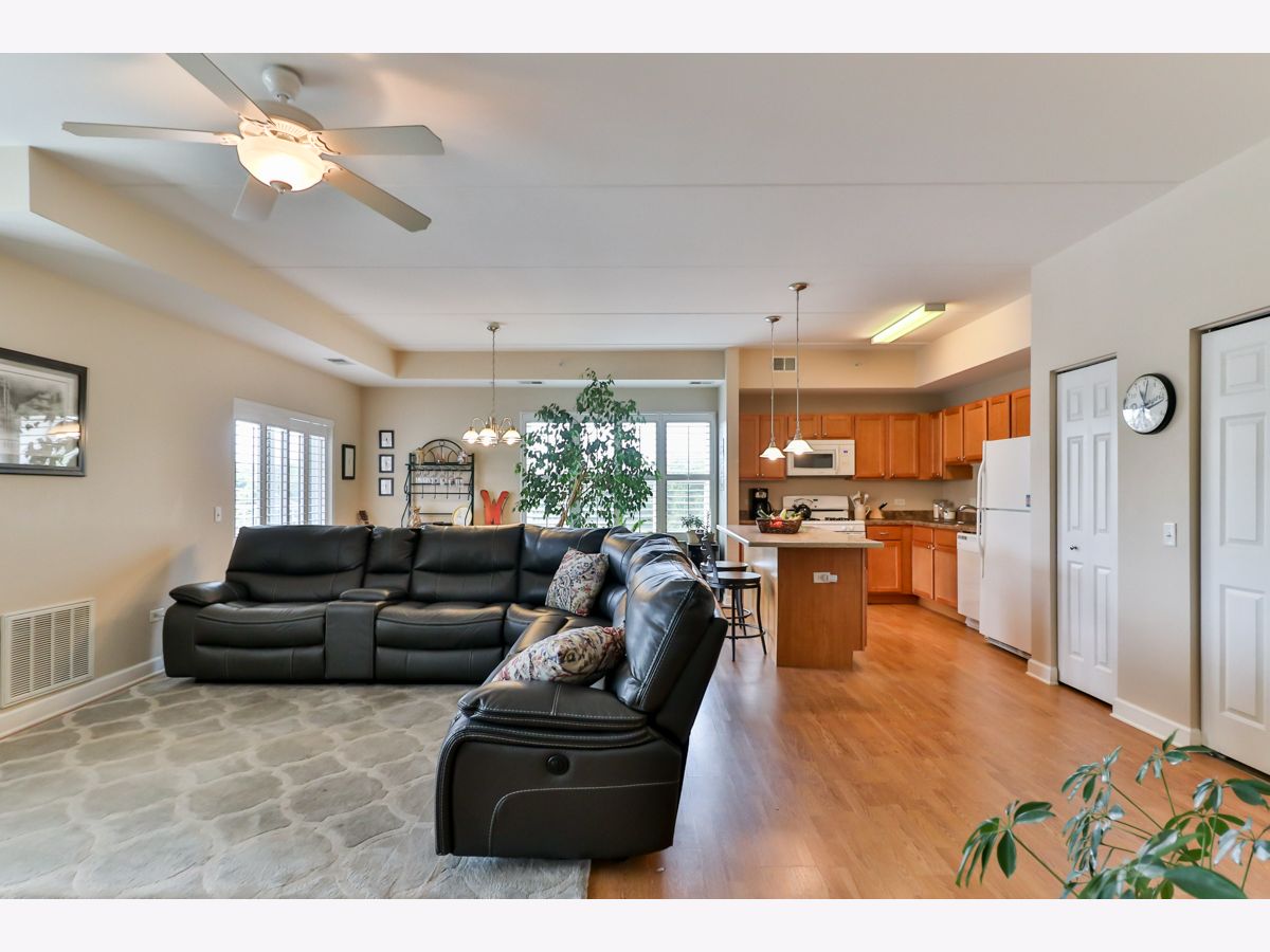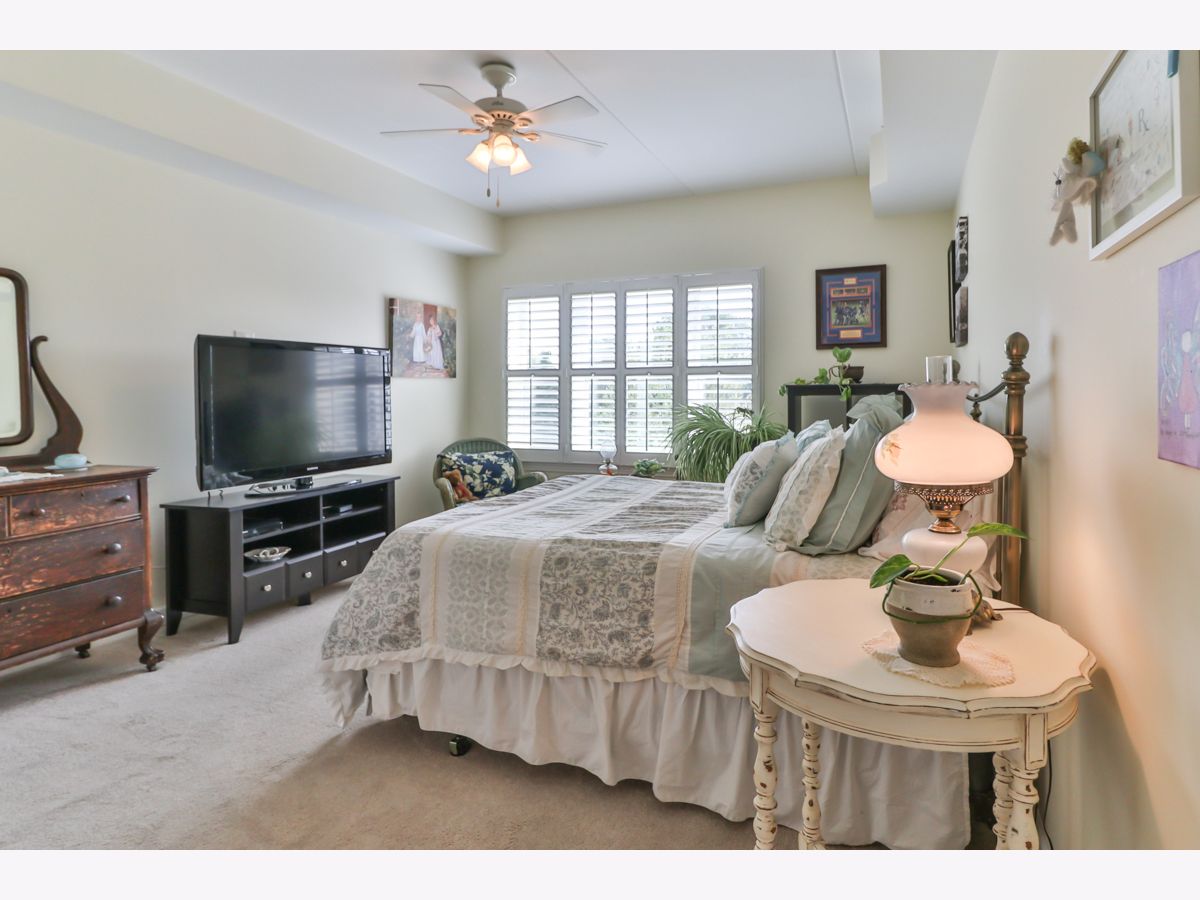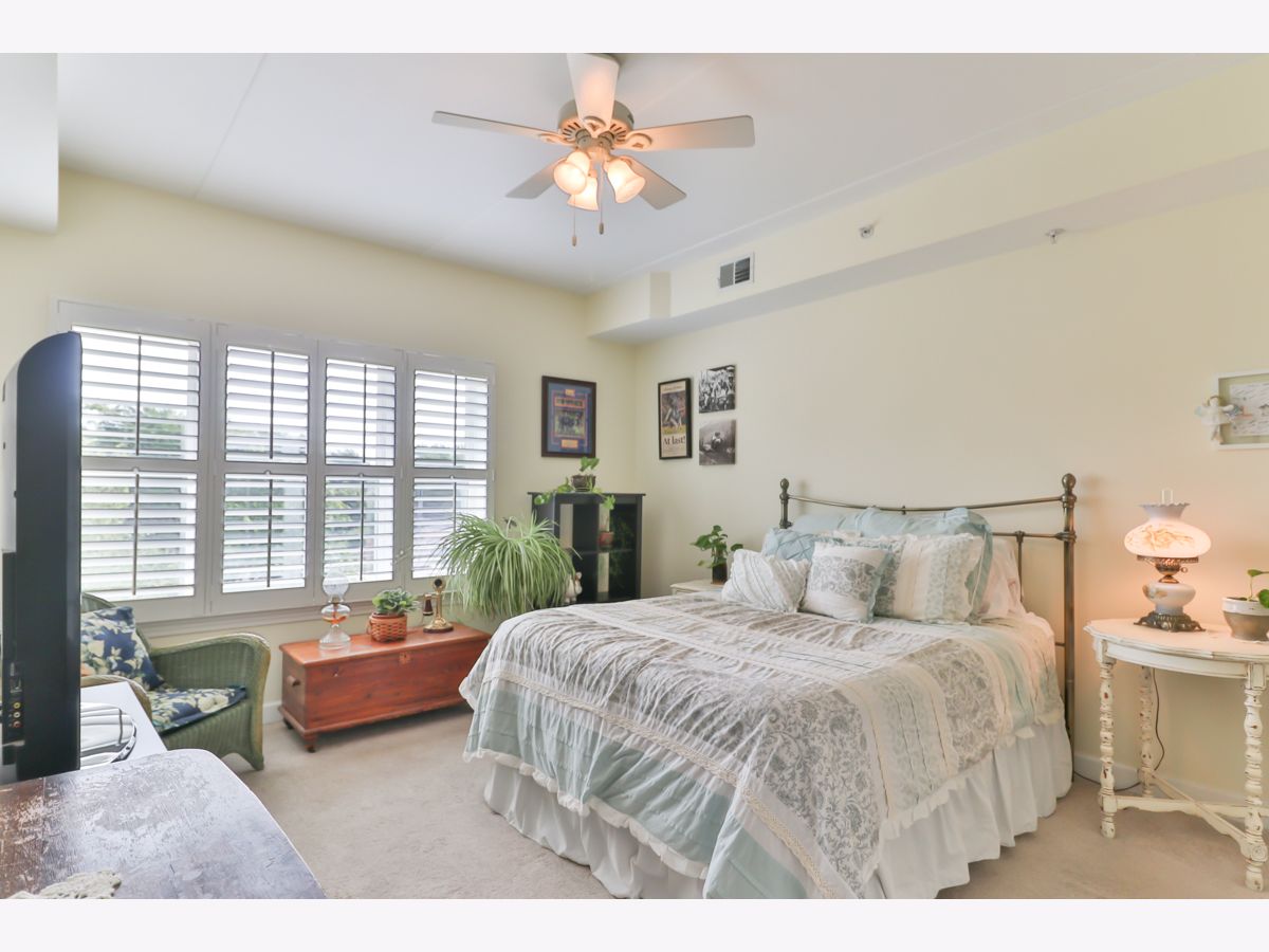 Rarely available third-floor corner unit. Natural light throughout this two-bedroom, two-bath condo in 55+ community. Walk-in closets in both bedrooms, including the 7'x7' closet in BR2. The master bath has ceramic tile, separate shower and soaking tub and double bowl vanity. All white millwork with 6-panel doors and brushed nickel hardware throughout the home. Center island with Corian countertop and breakfast bar. Beautiful plantation shutters on all windows and balcony door. Nine-foot ceilings and concrete construction provide for a quiet interior. No neighbors above. Deeded parking space in the heated underground garage is convenient to the elevators. Party room and exercise room on the premises. Great location - one block to the Fox River, where redevelopment is creating a community hub. Just minutes to Downtown Elgin or Downtown St Charles, as well as Randall Road shopping!