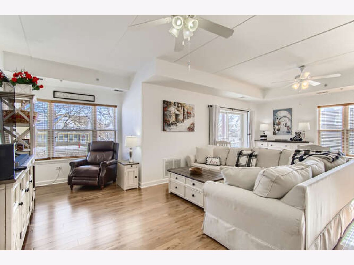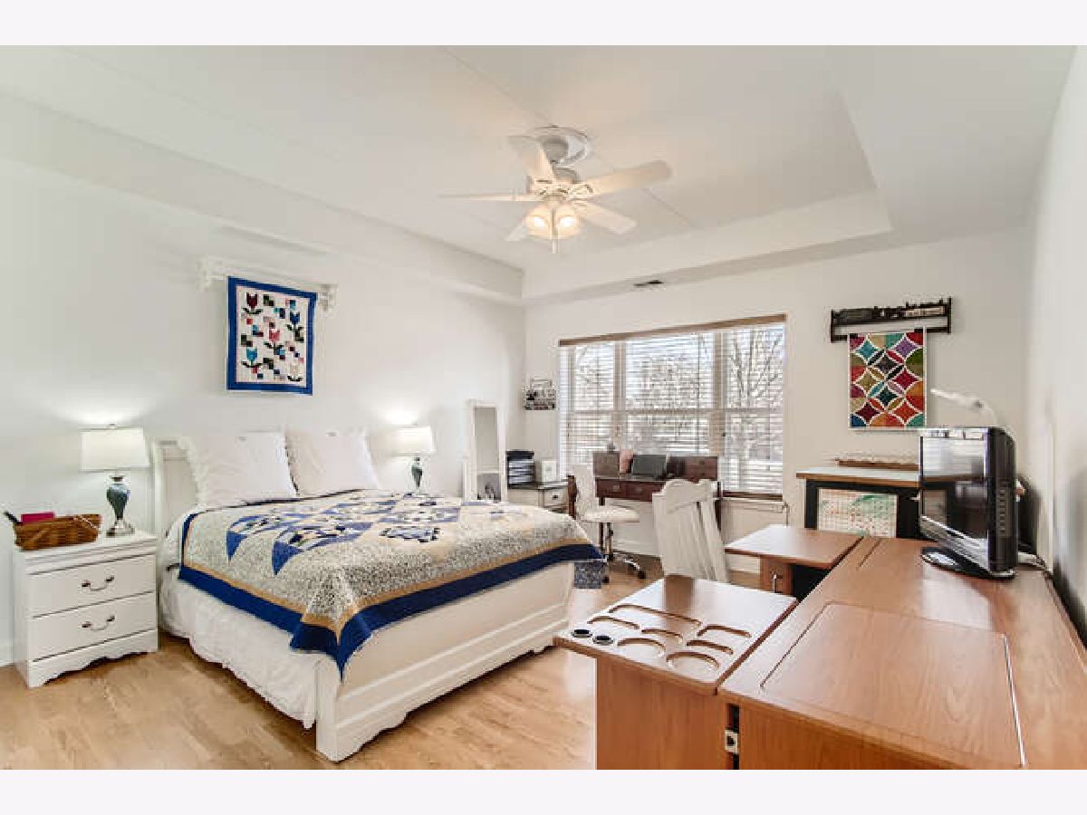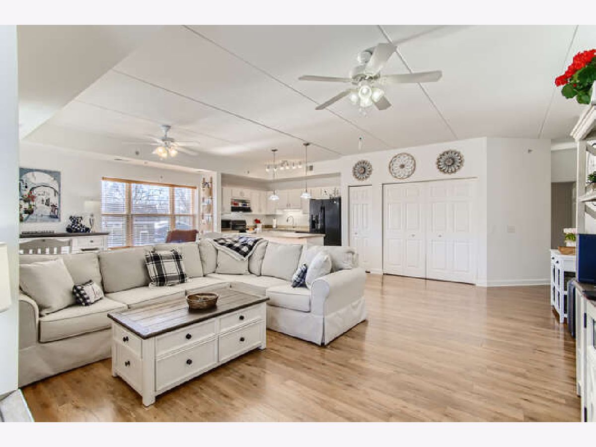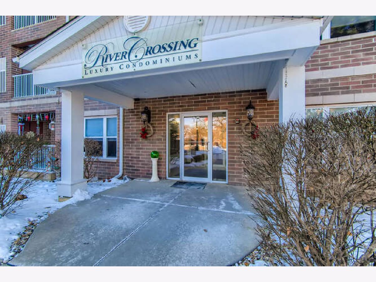 LIGHT & BRIGHT corner unit with southern & eastern exposure in exceptional active adult community at River Crossing! Wonderful 1st floor location with covered balcony & interior stairway to heated garage parking directly below! Delightfully updated including freshly painted interior & open great room with rich Pergo Ultra flooring! Professionally painted white kitchen cabinetry is complimented by Applewood floor! Primary Bedroom Suite features walk-in closet, linen closet, double vanity, soaking tub & separate shower! Convenient in-unit laundry! Spacious guest bedroom w/2nd full bath! 9 ft ceilings throughout! All new HVAC system (Furnace & A/C) in July 2020 & new H20 heater in 2016! Self-managed building results in super reasonable HOA fees, which include water & garbage pickup! There is also a water softener which services the entire building! Wide interior hallways, spacious Activity Room with kitchen & bath, fully equipped Exercise Room, & Storage Room with large individual lockable spaces! Superbly constructed brick & concrete building deadens sound between units, is sprinklered, has secure entry, 2 elevators & is ADA compliant. A convenience store & Visiting Angels are also housed within the building to serve the residents. Enjoy the nearby Fox River bike path & riverfront parks! Not to be missed, this is a compelling value!!!