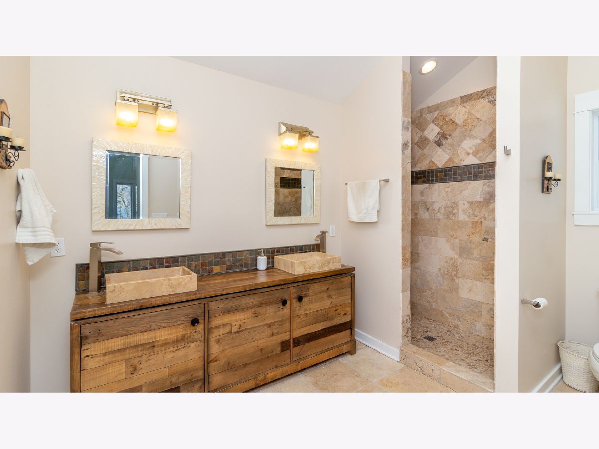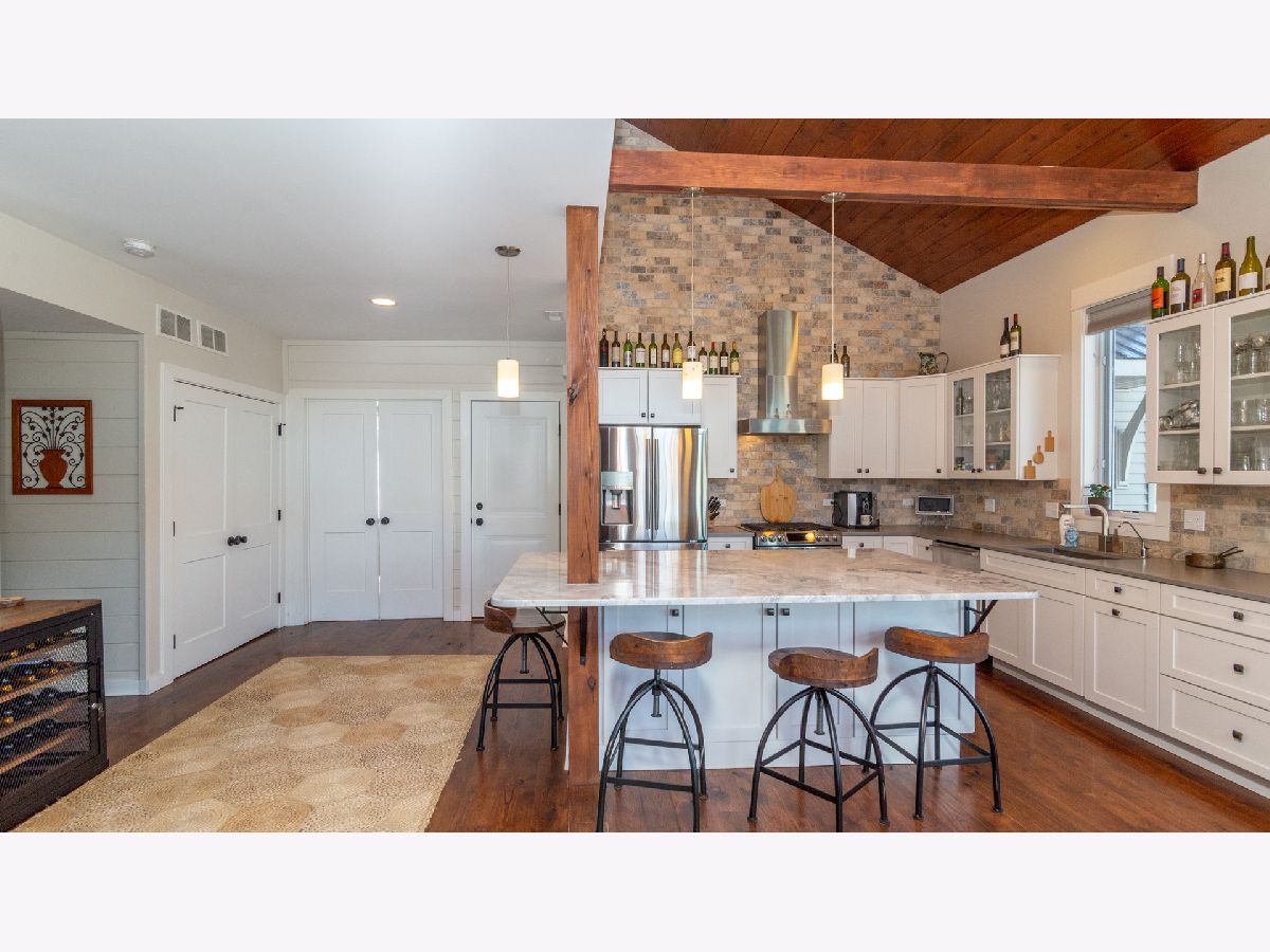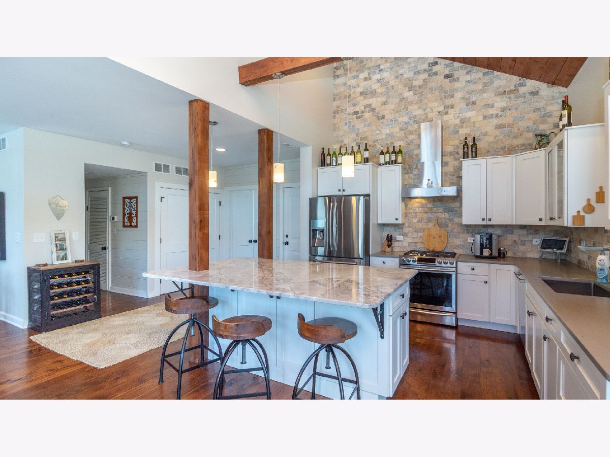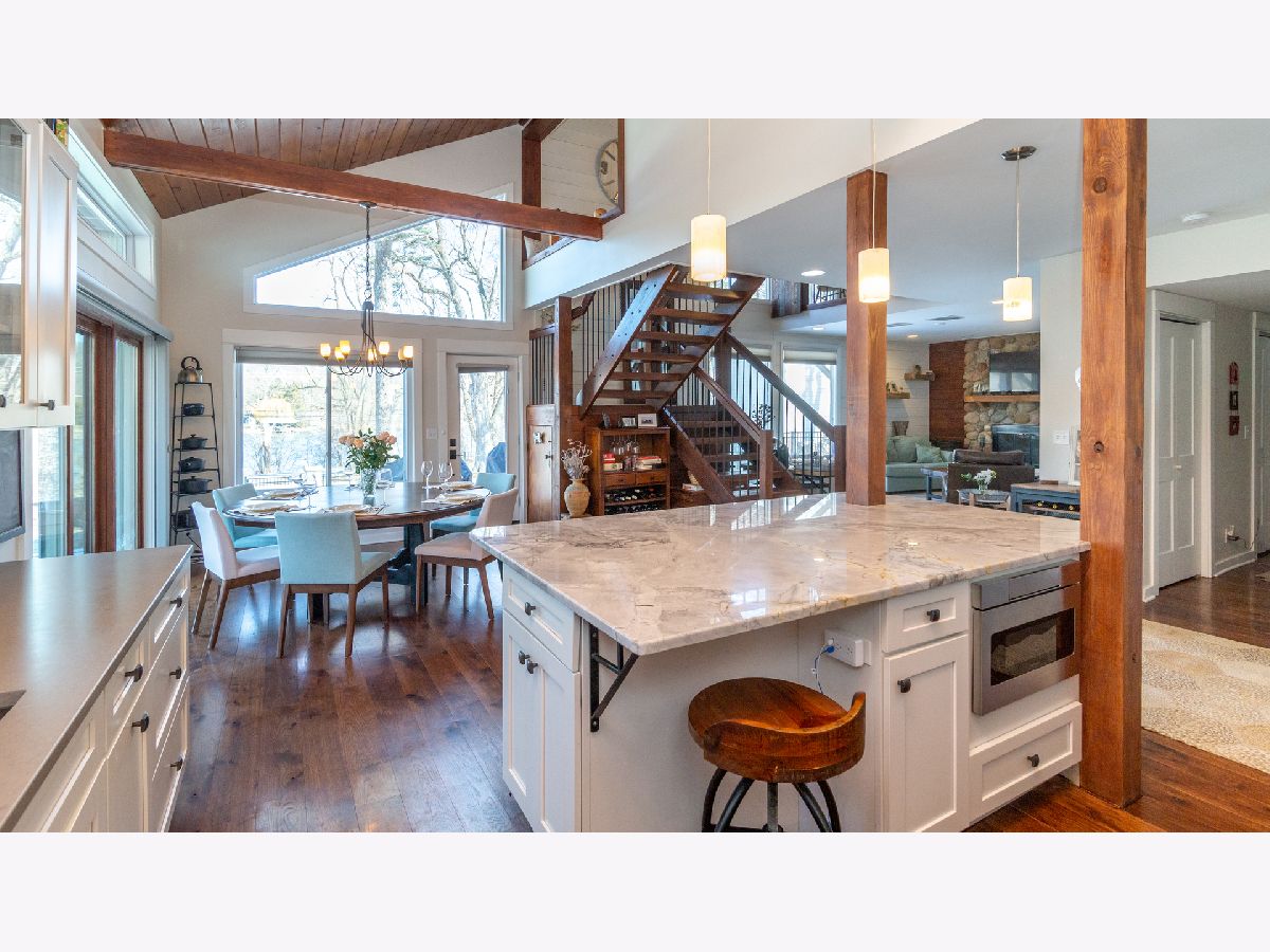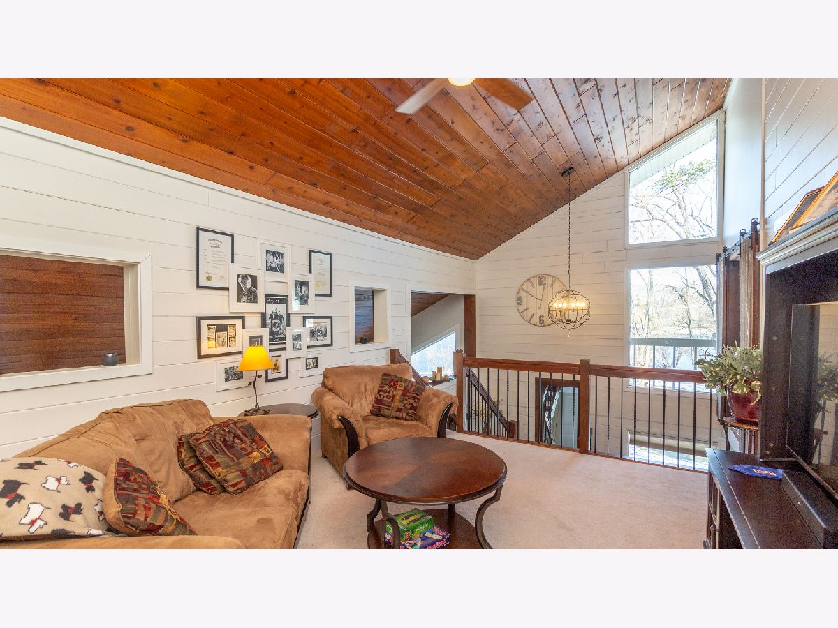 Bright & spacious move in ready waterfront home on huge 2+ acre wooded lot with 147 feet of frontage & 3 boat pier on the Fox River. Beautifully remodeled kitchen with Samsung & Bosch SS appliances including range hood, quartz & quartzite counter tops, white shaker style cabinets, custom subway tile backsplash, huge island with breakfast bar, reverse osmosis water purifier & pantry closet with electric outlet. Open floor plan with hardwood floors & tons of windows with river views throughout main floor. Living room with stone woodburning fireplace, dining room with sliding doors to deck with pergola, brick paver terrace & outdoor kitchen with cooktop/grill. Main floor full bath, bedroom/office & laundry room. Cozy 2nd floor loft/family room overlooks main floor. Primary bedroom features vaulted ceilings, ensuite bathroom with w/double sink & walk in closet with 2nd washer/dryer. 2nd floor guest bathroom with huge walk-in shower custom glass subway tile and double sink. Gated, professionally landscaped yard with swim spa/hot tub. Attached 1.5 car garage plus detached 2 car garage to store all of your fun outdoor toys!