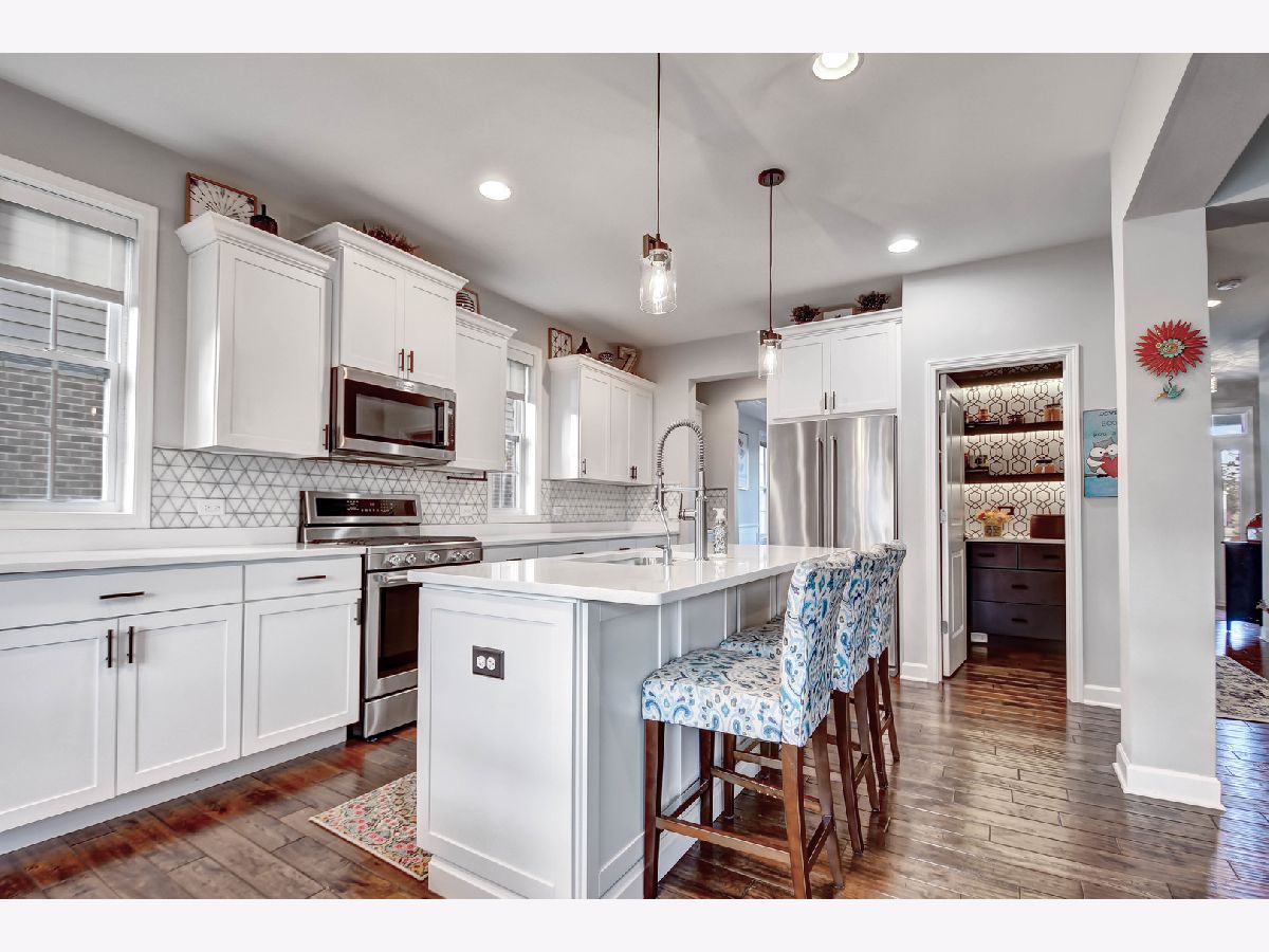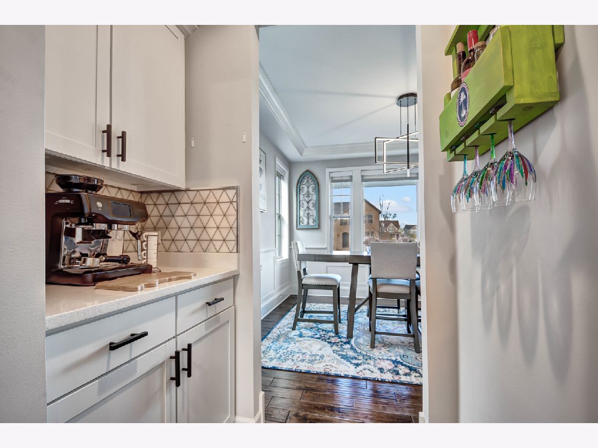 You'll love coming home to this distinctive, barely 9 years old storybook-inspired two-story residence that blends classic Craftsman charm with modern farmhouse influences. A striking front-facing gable and inviting covered front porch create exceptional curb appeal. Beautifully designed and thoughtfully upgraded, this 2,987-square-foot home plus a fully finished basement shows like new, having been used only as a part-time residence by the current owners. Inside, a gracious foyer opens to an elegantly welcoming dining area highlighted by large windows, classic wainscoting, a tray ceiling with detailed molding, and rich wide-plank textured hardwood floors in warm natural tones that flow seamlessly throughout the main living areas. The impressively appointed kitchen features modern white cabinetry, light quartz countertops, stainless steel appliances, a center island with breakfast bar and reverse-osmosis system, a walk-in pantry with custom cabinetry, shelving and beverage cooler, plus a butler's pantry connecting to the dining room. A casual dining area with patio doors leads to the backyard deck, while the kitchen opens effortlessly to the family room with fireplace-ideal for both everyday living and entertaining. The main level also includes a bedroom with a nearby half bath that could easily accommodate a future shower, along with a functional mudroom featuring a built-in bench and hook station. A modern staircase with a contemporary dimensional feature wall leads to the upper level, where soft matte flooring with a smooth, refined finish adds warmth and understated sophistication. The second floor offers four bedrooms, including a spacious primary suite with two walk-in closets and two sleek, modern bathrooms featuring clean lines and neutral tones, plus a convenient laundry room with side-by-side washer and dryer. The stylishly finished basement delivers a loft-inspired feel with exposed black-sprayed ceilings, multiple entertaining areas, a creatively designed full bathroom with earth-toned porcelain tile, a custom wet bar with microwave and oven/stove, an additional bedroom, and a utility room with extra vanity. Contemporary light fixtures and abundant recessed lighting enhance the vibrant yet comfortable atmosphere throughout. Additional highlights include a three-car garage with 10-foot ceilings, 32 linear feet of mounted storage racks, and a hot water spout. The backyard offers excellent outdoor living potential with a deck, gas line, and hot and cold water spouts-perfect for a future outdoor kitchen. A new roof was installed in 2025. Truly move-in ready with nothing to do but enjoy. Fast closing possible-see it today.The property will officially debut on the open market April 1, 2026, but may be viewed and purchased prior to launch through a private network opportunity.