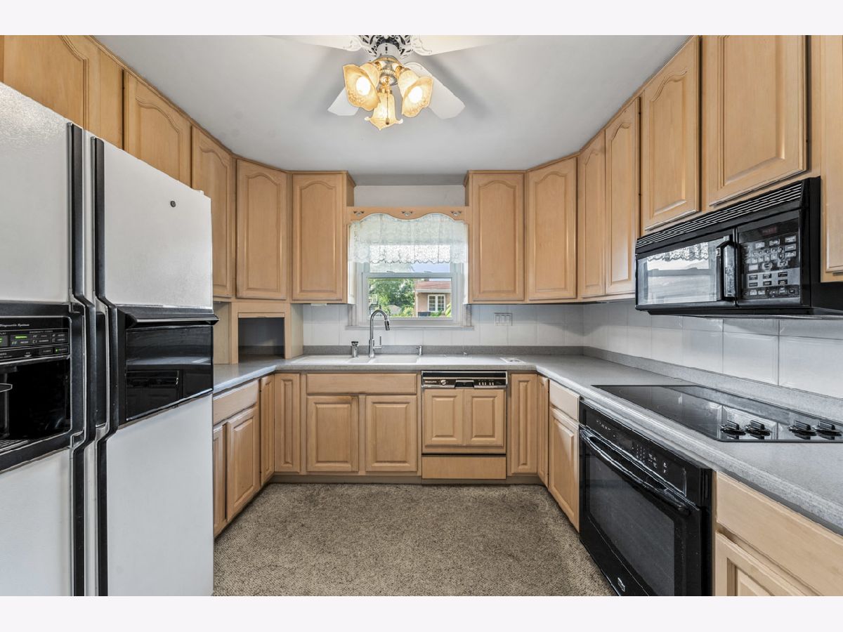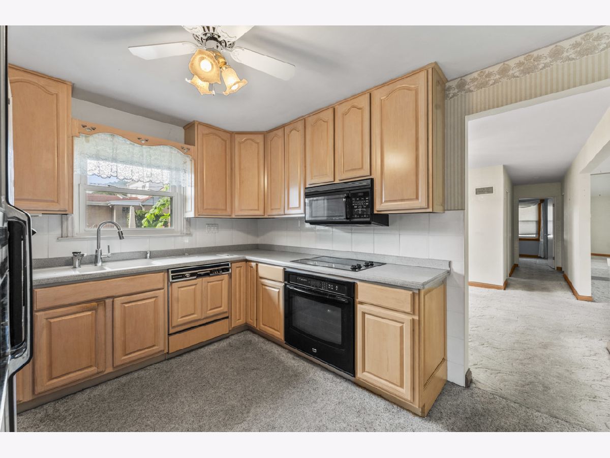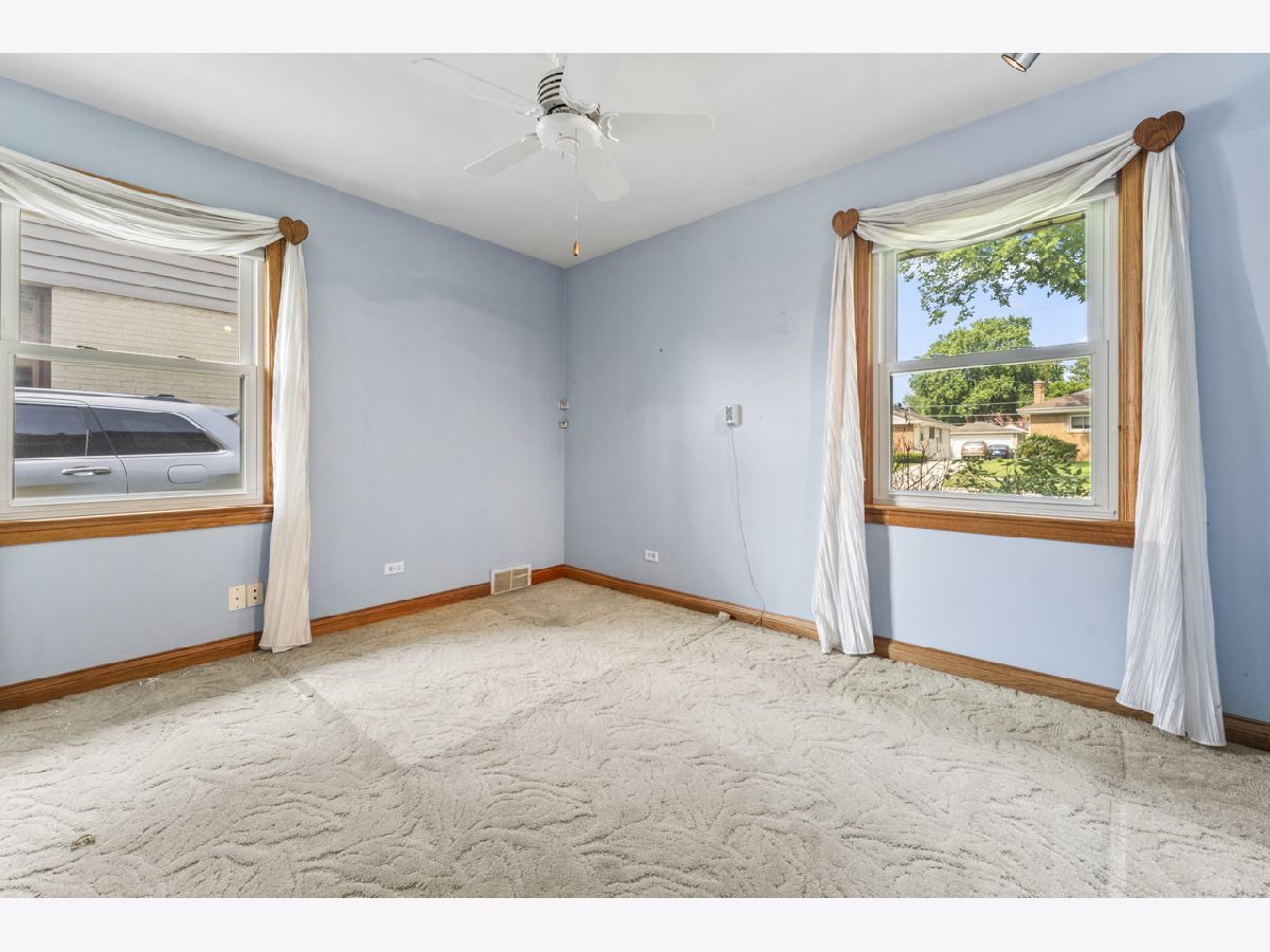 This sturdy brick 2-bedroom ranch home on a corner lot is ready for a new owner. The spacious living area flows into a separate formal dining room, perfect for gatherings. The kitchen has been updated with maple 42" cabinets and solid surface countertops, offering both style and function. You'll also find an office/small den along with two comfortable bedrooms on the main floor. The generously sized primary bedroom features a full-wall closet, as does the second bedroom. The main floor bathroom includes a tub/shower combo for convenience. The basement is partially finished, complete with a bar and a full bathroom with a shower, offering extra space for relaxation or entertaining. Outside, the private side yard is beautifully landscaped with natural hedge fencing, creating a peaceful retreat. The attached 2-car garage provides ample parking and additional storage space. This home is being sold as-is, offering a great opportunity to make it your own.