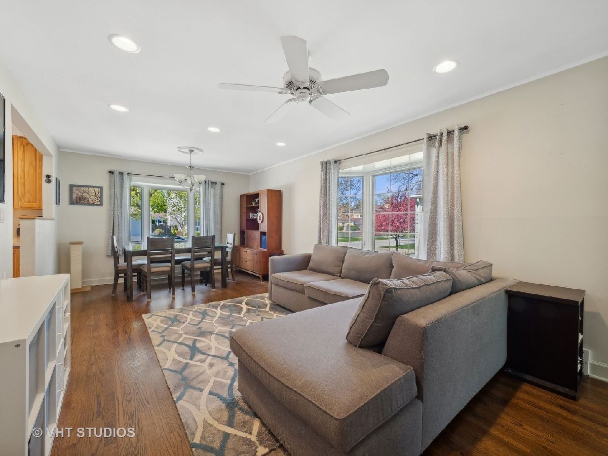 A great place to call home in desirable Arlington Heights! Enter this charming ranch, and you'll find an open and bright main level that offers a spacious living and dining room combined with a neutral kitchen, island and plenty of cabinets for storage. There are 3 functional bedrooms located at the back of the home with an updated, shared full bathroom. Other features include hardwood flooring throughout, mostly all new windows, beautiful bay windows in living/dining room and primary, canned lighting with dimmers, and Nest thermostat. The large lower level affords enough space for a home theatre, playroom, crafting, or exercise area, plus a bonus 4th bedroom/office option with adjacent full bathroom and walk in shower. The basement also includes an immense laundry room with extra storage and newer mechanicals. Outside offers a rare, custom built 2.5 car garage with gas heat, wired for cable/internet, bar area w/ fridge, storage, and work space. Beautiful yard with patio, garden boxes, enclosed fence, parking for 4 cars, and surrounded by mature trees and perennials. Both exterior doors and shutters were replaced with a pop of color to compliment the home's modern grey exterior. Walking distance to Arlington Park Metra, close to downtown, and located in Patton/Thomas/Hersey schools. Come check it out!
