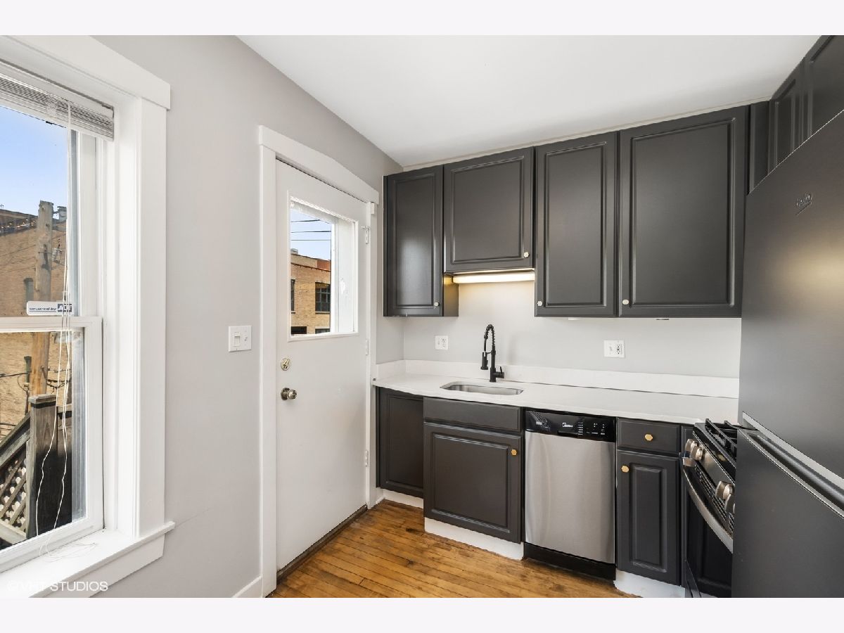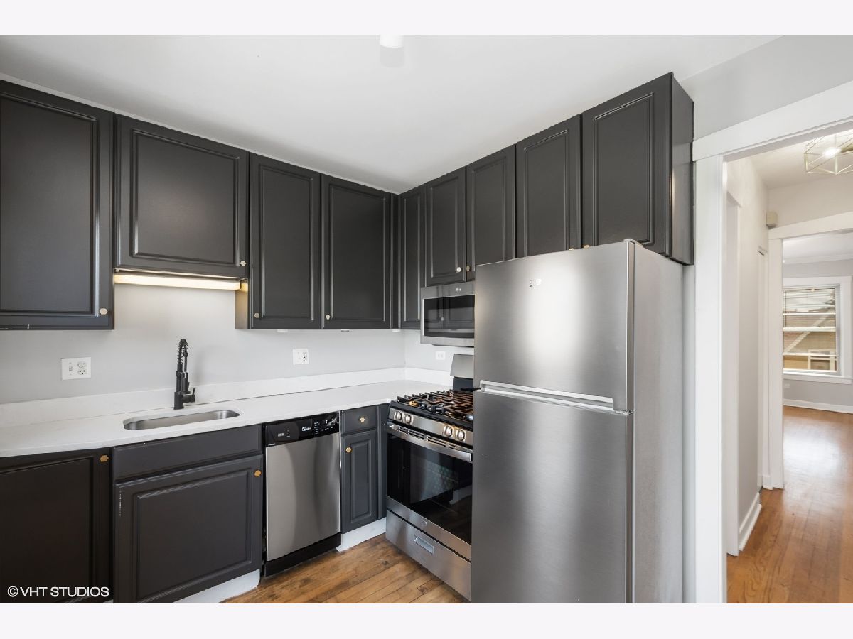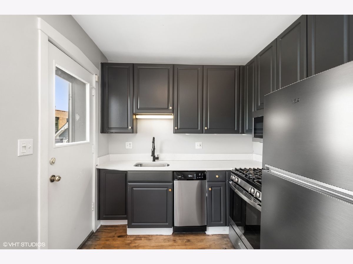 Welcome home to your adorable 1 bed, 1 bath vintage walk-up in prime Lakeview, steps to all you need! Your new home just got a wonderful face lift with all new paint, including doors, new designer modern lighting throughout, and a fabulous newly renovated kitchen that includes new SS appliances, new quartz counters, and freshly painted sleek dark grey cabinets with new brass hardware! Bedroom has plenty of space for a king bed plus furniture and has a spacious closet! Enjoy beautiful Chicago summer nights on your large deck off your kitchen- with plenty of space for outdoor table and chairs! Street parking or easily available spots for rent on surrounding blocks. Laundry in common area and extra storage space!