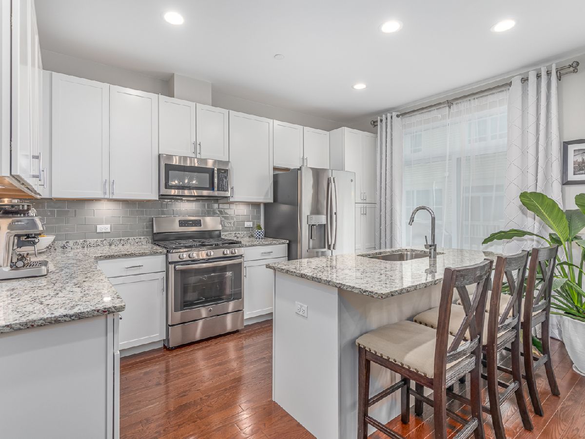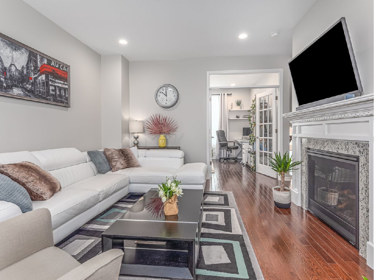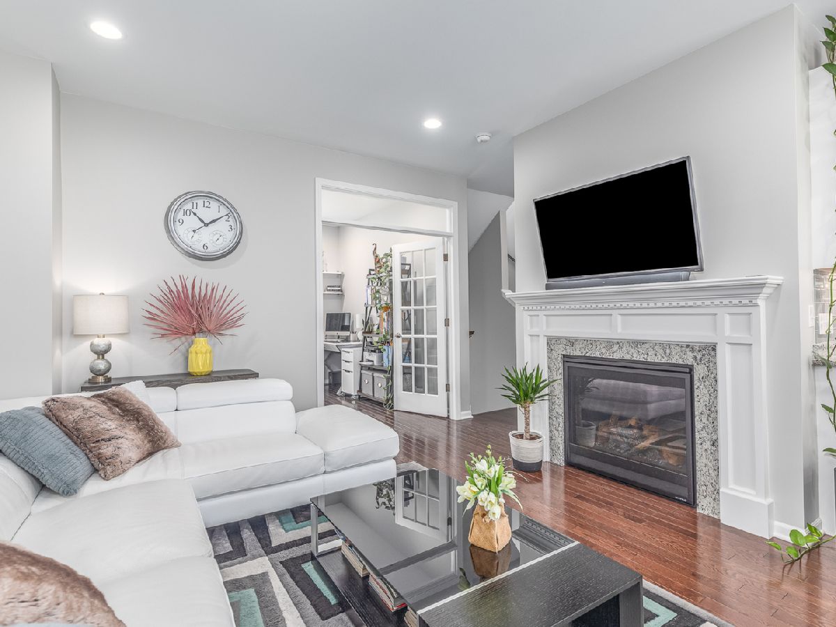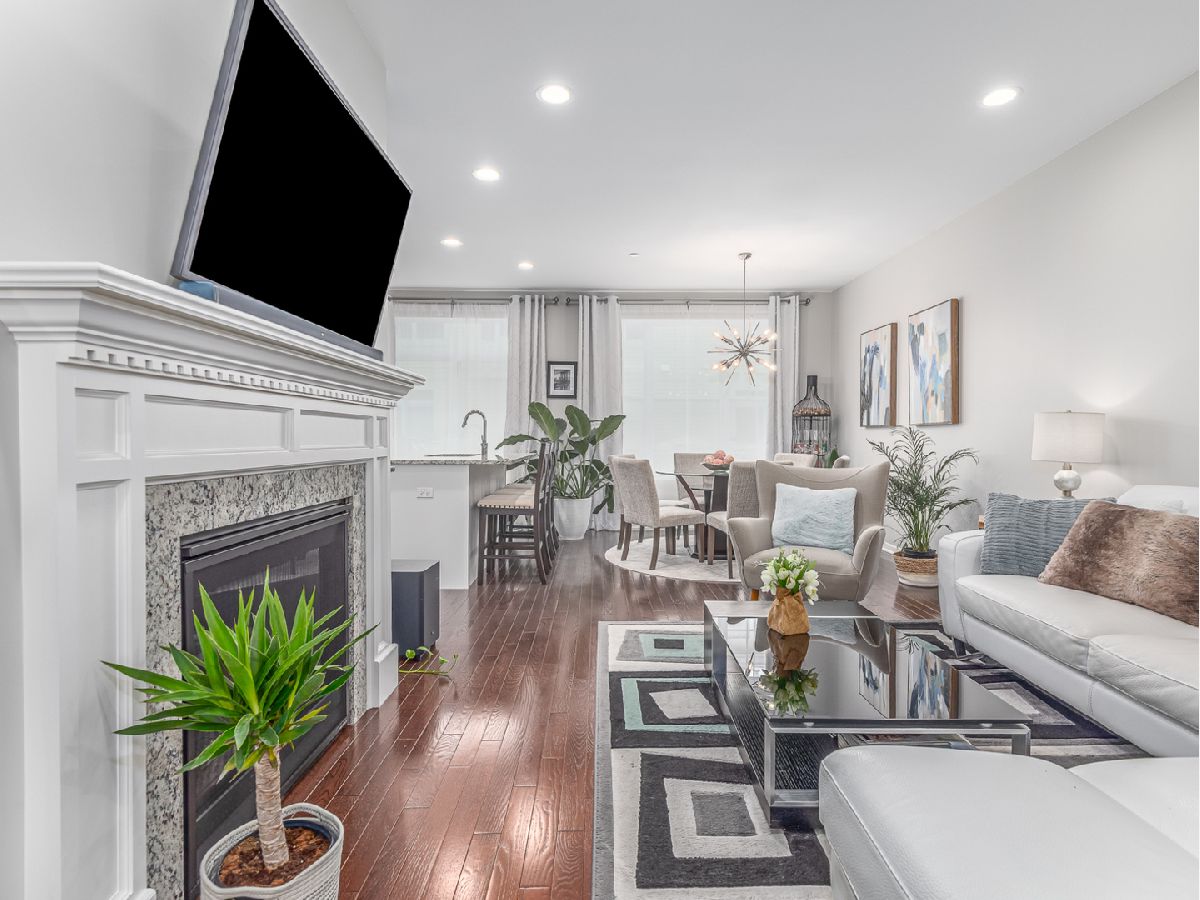 This incredible three-story Townhouse is better than NEW - Upgraded and customized by original owners with great design throughout. Welcoming two story foyer with stunning wood stairs leading up to the cozy Living room with fireplace, high ceilings and recessed lighting. Open concept kitchen features beautiful white 42" cabinets, stainless steel appliances, granite counters and entertaining island all open to dining room and sliding door access to extended balcony great for BBQ's. First floor also features updated 1/2 bathroom and hardwood floors thru-out the living room, dining room and first floor bedroom/office. Top floor busts two master bedroom suites, each with its own private full bath and convenient laundry closet which includes a top-of-the line washer/dryer. There are countless possibilities for your finished bonus room on the lower level. It can be used as a bedroom, family room, kids playroom, or an office! Two car oversized garage. The best part? You're within walking distance to the restaurants, shops, parks and so much more. Come tour today!