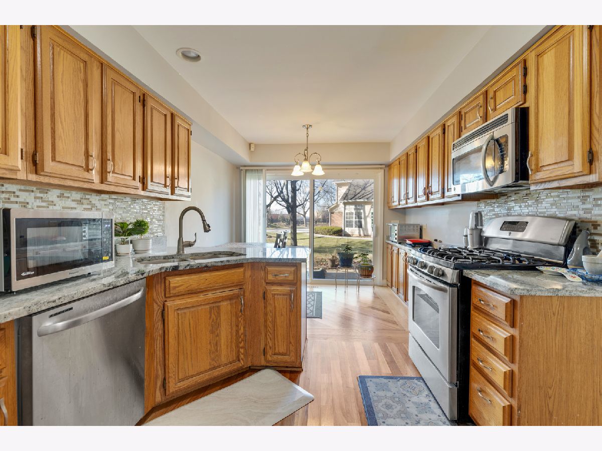 East facing beautiful 3 bedrooms, 2.5 baths two story home with two car attached garage. Open concept floor plan has a large living/dinning room combo, hardwood floors throughout and custom light fixtures. Brand new windows including sliders. Sun filled kitchen boosts abundance of cabinets, newer granite countertops, backsplash, stainless steel appliances. Spacious breakfast area with sliding door to patio-perfect for relaxing, grilling and entertainment. Beautiful stairway leads to deluxe primary suite which offers walk in closets and gorgeous, remodeled private bath with soaking tub, separate shower, and double sink vanity. 2 additional bedrooms, modern full bath and first floor laundry. Newer furnace, A/C unit and hot water heater. Award winning & top rated schools, Hoover Math and Science Academy. HOA includes pools, clubhouse, hot tubs, all exterior maintenance, landscape and snow removal. Close to all shopping, expressway and metra. Investor friendly.