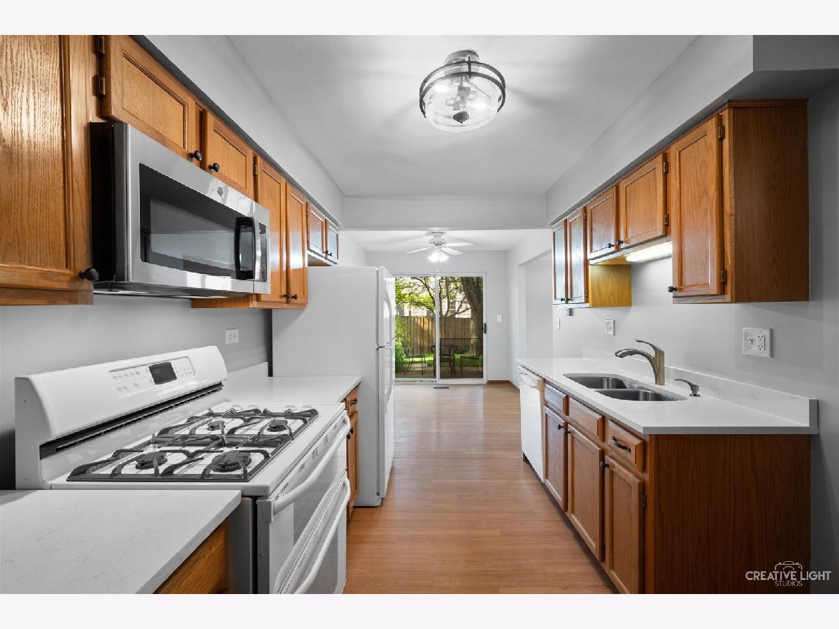 GREAT LOCATION! This Home Has It All! Recently Updated Throughout! End-Unit Townhome with 2 Bedrooms, 1.5 Bathrooms, located in popular Townhomes of Winchester Subdivision. Entire unit has been updated with FRESH PAINT throughout, NEW Carpet throughout, NEW Lighting and NEW Quartz countertops in the Kitchen and both Bathrooms. Grand two-story (17 feet high!) Family Room/living room with floor to ceiling windows and lovely gas fireplace makes a great feature wall. Think outside of the box and use the Dining Room as your Home Office. The breakfast area has a sliding glass door leading to the concrete patio and lovely backyard, which is handy for summer BBQ's. Kitchen has direct access to 2-Car garage, so you can walk right in with packages and groceries. 1st floor Laundry with washer/dryer included. All appliances included! Two large Bedrooms on the second level: Both Bedrooms have plenty of closet space and the upstairs has two Linen closets. Full Bathroom has NEW dual vanity, mirror, lighting and toilet and offers a tub and separate walk-in shower. Plenty of room for storage with your two car attached garage. Cedar siding exterior stained in Fall 2020 (maintained by HOA). Low association fees should not fool you as this association is well maintained. The association has a strong board and is diligent with repairs and maintenance. District #203 Schools with Naperville Central HS attendance. Easy access to I-55 and I-88. Walking distance to DuPage River Bike Trail, Kingsley Elementary, Weigand Riverfront Park, Knoch Knolls Park & minutes from downtown Naperville. HOA fee $236/month. This home is super clean & move in ready.