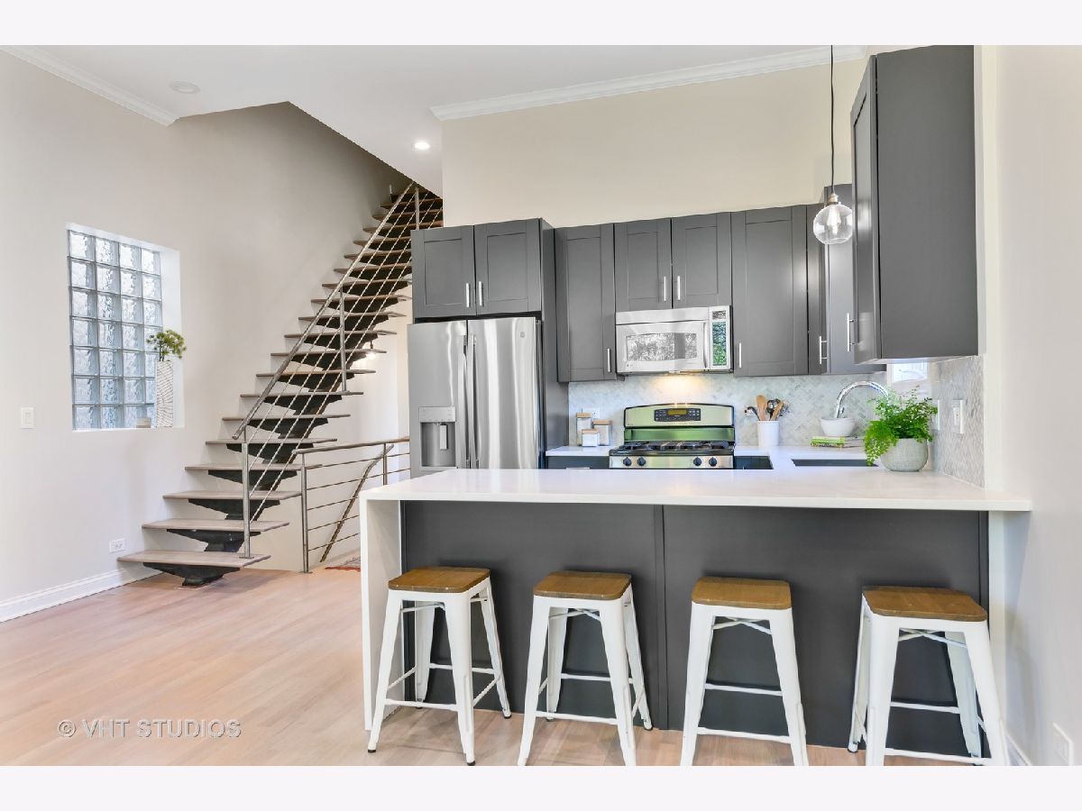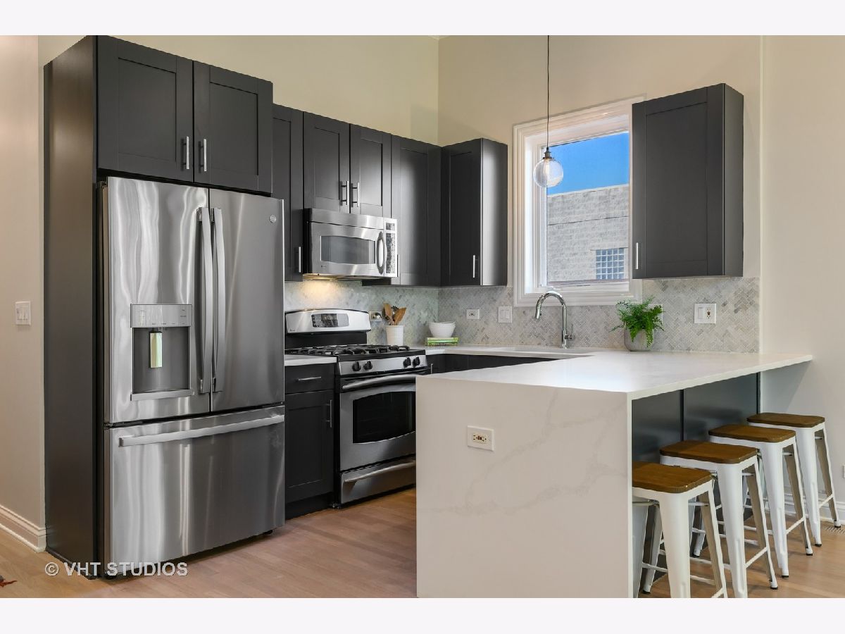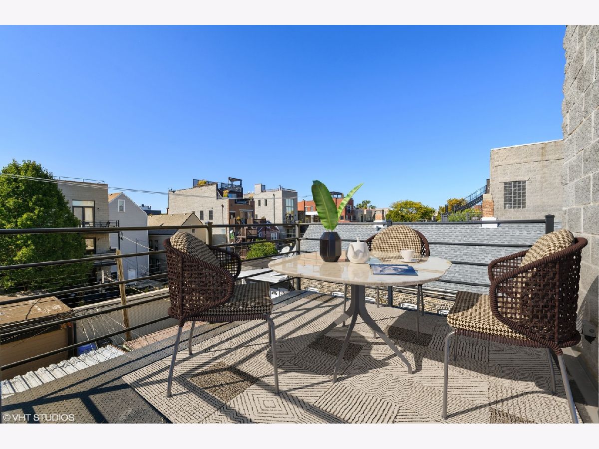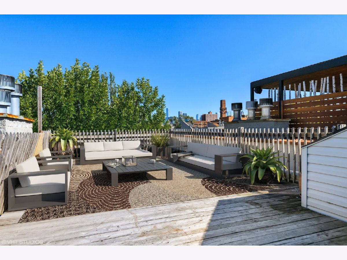 Completely transformed, thoughtfully updated and designed top floor unit + massive private roof deck with fantastic city views in the best location of Wicker Park/ East Village. Spacious open living space boasts huge 12 foot ceilings, all freshly painted and complimented by newly refinished hardwood floors throughout. The right amount of modern and traditional in the chic kitchen with charcoal 42" shaker cabinets, quartz countertops with waterfall edge, marble herringbone backsplash, brand new GE French door refrigerator, large single basin stainless sink with new chrome faucet. Spacious primary suite accommodates king bed, has professionally organized walk-in closet, and ensuite bath with double sink vanity with new quartz counters, chrome fixtures, black framed mirrors, + modern lights, separate walk-in shower and jacuzzi tub. Interior staircase in-unit leads to your own private roof deck which seller is offering $7500 credit for fixing up or replacing. 2nd private deck in back of main level, nice for lounging or grilling. Covered parking space included. Incredible location STEPS to Division with Target, Starbucks (at the end of the block!) dozens of cafes, boutiques, bars, Wicker Park Athletic Club and more! Blue line to downtown or O'Hare 3 blocks away at Division/Ashland. Truly, can't be beat!