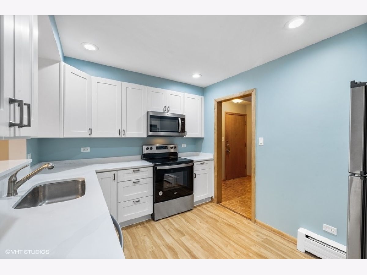 This gorgeous newly renovated mid-century modern condo is located in the heart of beautiful downtown Oak Park. New electrical, plumbing gut renovated baths and kitchen grace this space! The long gallery foyer greats you and flows into the front sunken living room large enough for multiple conversation areas. The formal dining room is spectacular with its whole wall of window/sliding glass door to the private balcony. The new cook's kitchen can handle your finest cuisine with stainless appliances, custom cabinetry, quartz countertops and canned lighting. This unit has not just the new full main bath, but it also has a new half bath for guests. Two large bedrooms complete this amazing home. This condo comes with TWO exterior parking spots right outside the back door and a storage closet. Walk to all that is awesome about Oak Park... Green and Blue Lines, Metra, shops, fantastic dining, schools, parks and so much more!