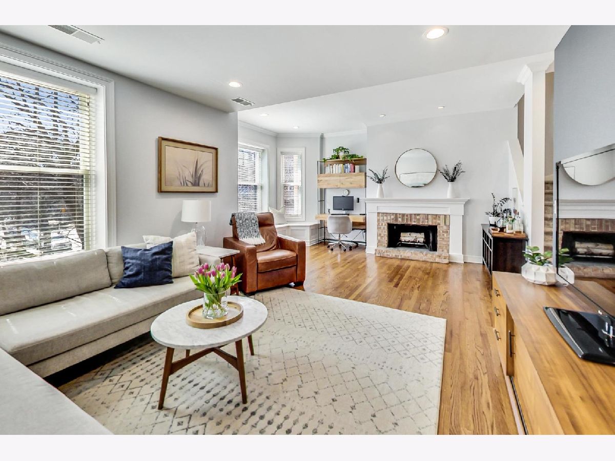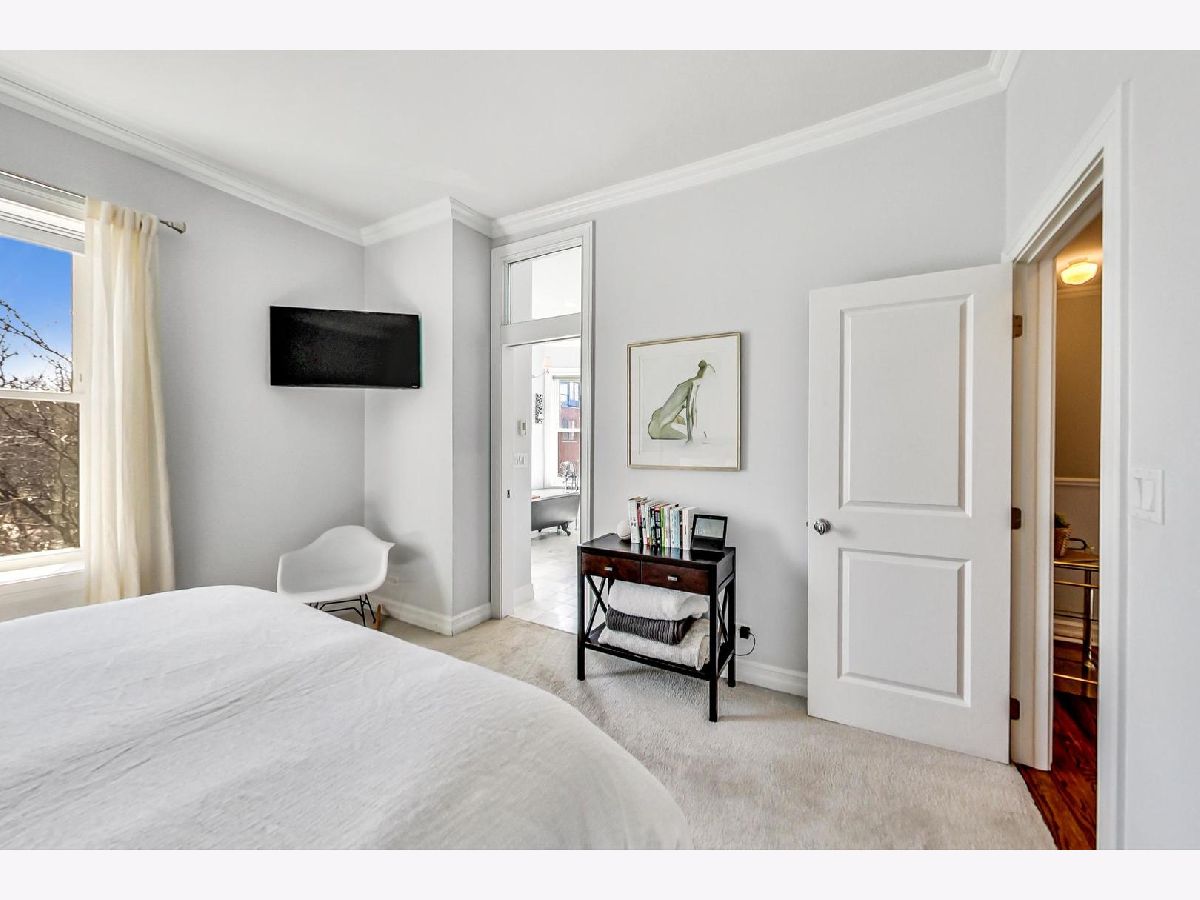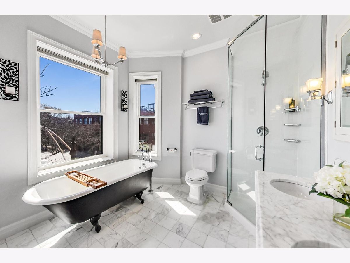 This elegant and stylish duplex up lives like a single family home with all 3 bedrooms on the 2nd floor. Location is everything: 1050 is located in the heart of Lincoln Park on the iconic and historic Armitage corridor in Oscar Mayer attendance area. The large living room is highlighted by a south-facing bay window with bench seating, a brick wood burning fireplace, and three generous closets for ample storage. The main level features beautiful hardwood floors throughout. The clean, all white, eat-in kitchen features timeless granite countertops, a double oven, stainless steel appliances, new dishwasher, and plenty of cabinet space. Additionally, there is a built-in pantry for added convenience. The roomy dining room is prewired for a TV, providing an enjoyable entertainment space. The kitchen opens up to what will be an expansive new catwalk to common outdoor space with grills and seating. The upstairs features all three bedrooms and newer carpet. The primary suite is a luxurious retreat, featuring a walk-in closet with built-in drawers and hamper. The spa-like en-suite bathroom is adorned with marble finishes, HEATED FLOORS, a gorgeous clawfoot tub, separate shower, double sinks, Waterworks hardware, and a spacious linen/storage closet. The additional bedrooms are also sizable and offer great closet space. Brand new washer and dryer located upstairs. New water heater in 2022. The building has four outdoor common areas featuring outside dining tables and common grills. 1 exterior parking space included with lots of common space for activities in the parking lot. Permit parking on side streets with free parking in front of the building. Ideal location just one block from the Armitage brown and purple lines, and in the center of all of the desirable shopping and restaurants that Lincoln Park has to offer!
