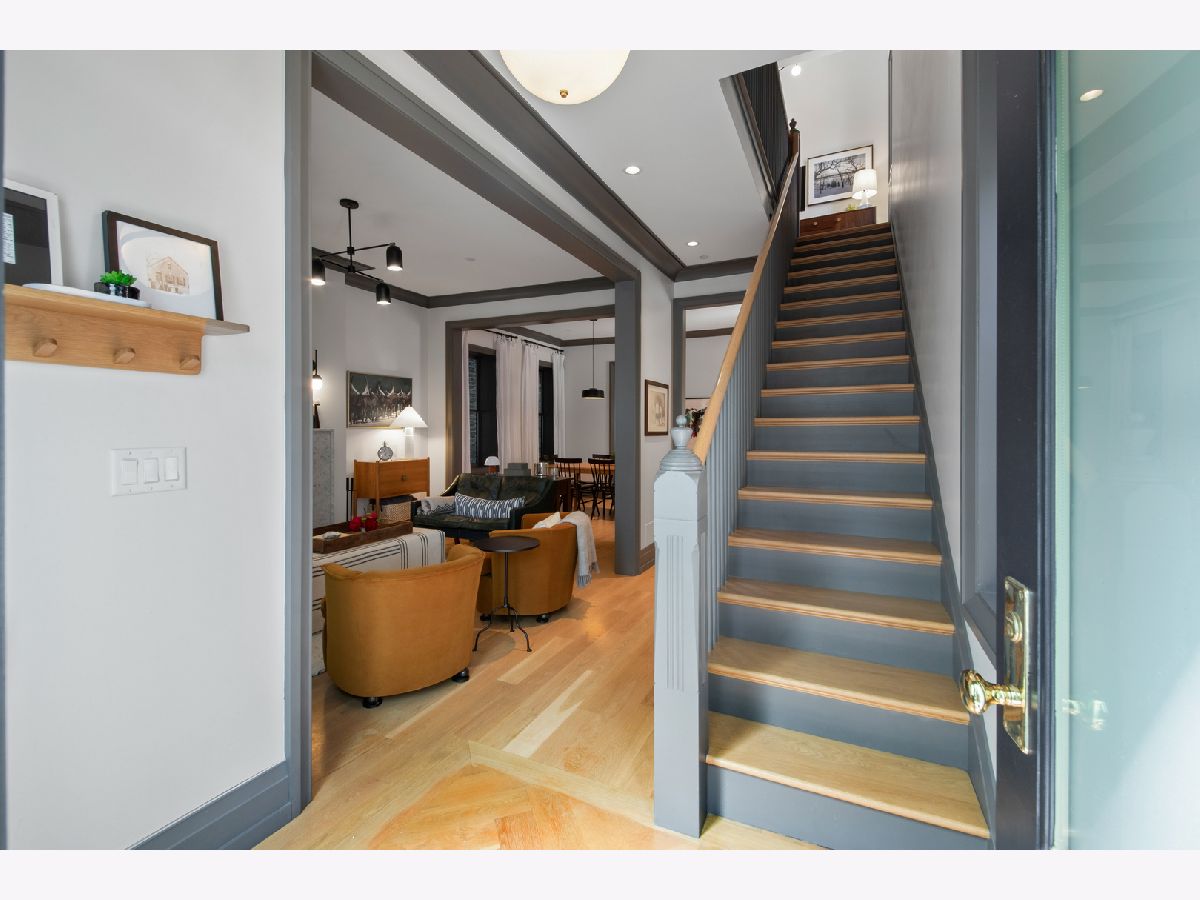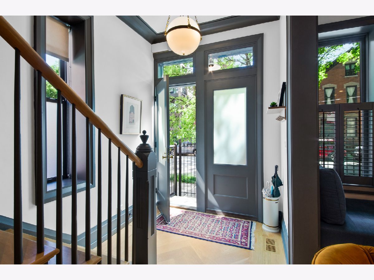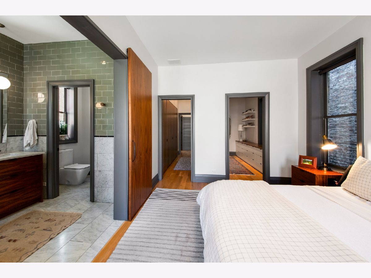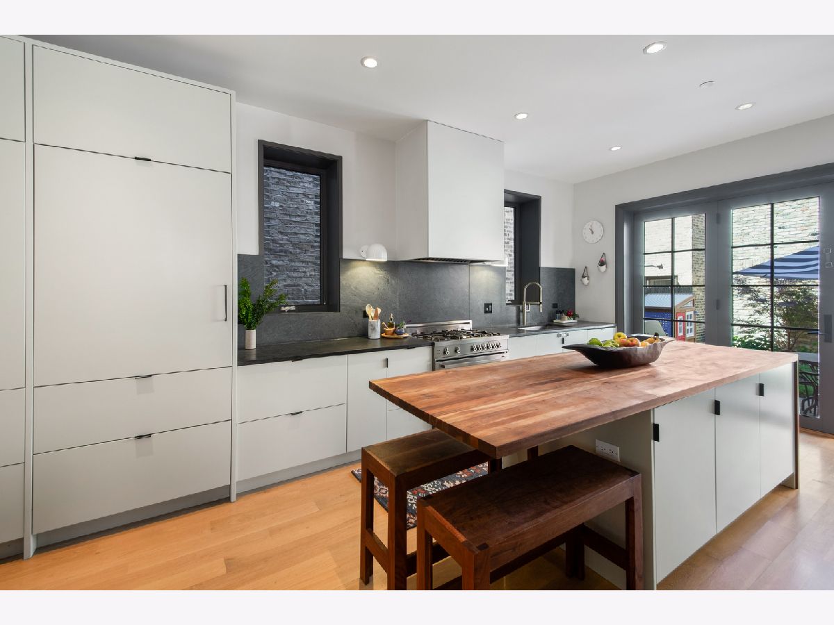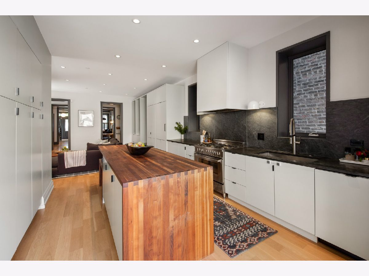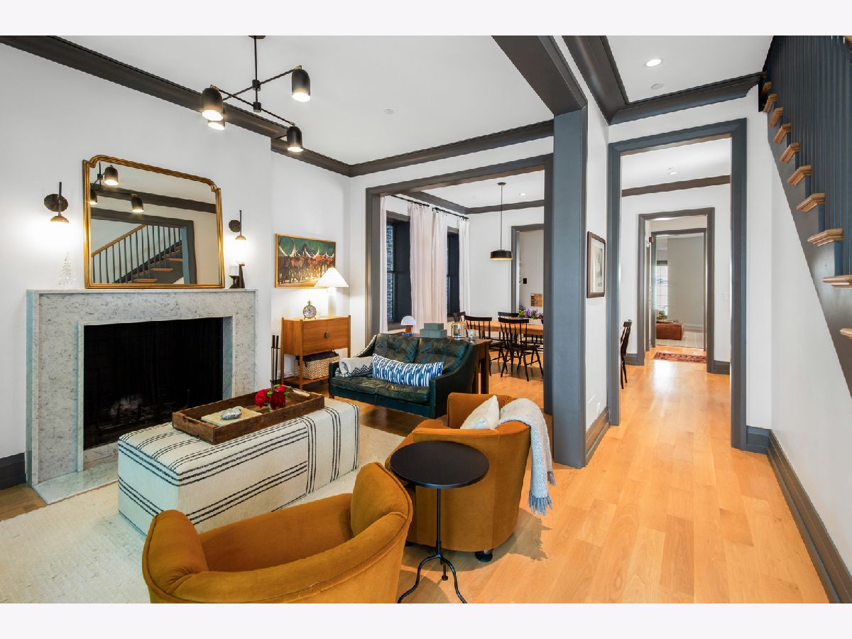 Welcome to 1050 N Wood Street, one of only a few homes landmarked by the city of Chicago in East Village. The exterior of the home is perfectly preserved and improved to reflect the original worker's cottage history from after the Chicago fire. From the charming tree lined Wood street, running centrally through West Town and Wicker Park, enter the all brick home through a set of picture frame frosted glass doors. Immediately feel embraced by good vibes and the warmth of a family friendly home, this entire home is above grade and flows with an open layout amid delicate door casing that create separate spaces. Marvin windows on all four sides of the home bring in natural light and allow privacy to the homeowner at the same time. All wide plank white oak flooring, tasteful crown molding, baseboards, and solid core doors tie in the modern finishes. In the front sitting room find a wood burning fireplace with a marble surround and a custom squared edge. Just under the stairs is a large coat closet and storage with room for the entire family. The formal dining room fits a table for eight. A toy room-built in office, a wet bar with wine fridge and a powder room with Ann Sacks tile separate the formal living space in the front of the house from the cozy and playful open kitchen and family room in the back of the house. Seamless floor to ceiling cabinets, drawers, built in bench and storage suit your heart's delight and line the entire family room and kitchen. A walnut topped island offers seating and high stools for a quick breakfast or light snack. A window over the kitchen sink, stainless subzero appliances and Bertozzini range. A wall of glass doors at the back of the home brings the outdoors indoors. Another built in bench and wet bar at the back entry make it easy to unload belongings after arrival from the garage. Softly landscaped and fenced backyard with pavers, space for grilling and dining take you to the new brick garage (roof deck ready - ask me for plans) equipped to charge electric vehicles and store bikes, tools, and more. Take the stairs to the second floor, white oak runs and delicately painted risers, love the original stair posts and complimentary spindles. Just past the landing is a laundry room with a sink and cabinet and front load washer/dryer and an art room for the kids. Each of the three bedrooms on the second level have ensuite bathrooms (cletile) and closets. Take the armoire lined hall through to the primary suite. Generous sized bedroom with built-in custom walnut side tables to fit a king bed set. Incredible primary bathroom has walnut sliding doors, custom walnut vanity, marble floors and marble and seamless glass tub/shower, stunning tile and hardware. Massive walk-in closet lined with armoires. The third floor has carpet and so much natural light from carefully placed skylights. Find another family room/play room, full bathroom, and two more bedrooms. Designer lighting everywhere: Cedar and Moss, Brendan Revenhill, and Park Studio LA lighting. Featured in Crain's, Parachute Home, Lonny and En Masse architecture. OPENHOUSE CANCELLED JULY 14. OFFER ACCEPTED.