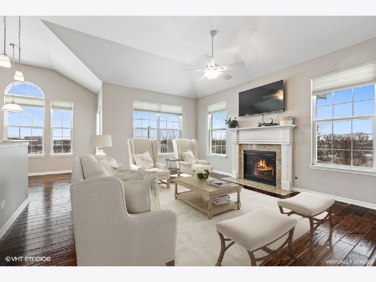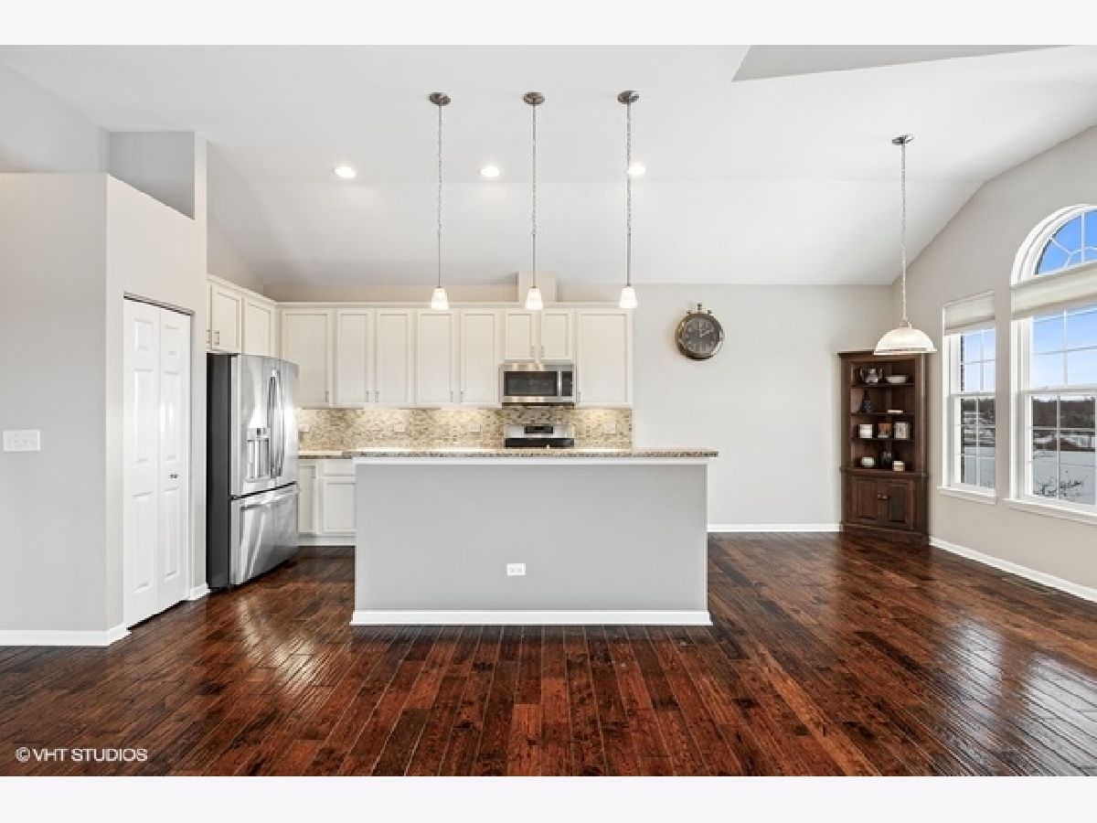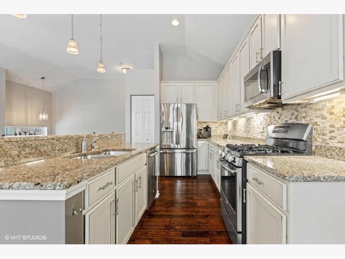 Welcome home to your sought after raised ranch end unit in Sheffield Square. Featuring 3 bedrooms, 3 full baths, and volume ceilings in the family room, kitchen, upper hall & primary bedroom. Hand scraped hardwood floors in living room & kitchen. 42' maple cabinetry, granite counters with island seating, and stainless appliances. Luxurious primary bedroom with walk-in closet, double sinks & spa-inspired bath. You will love the finished lower level complete with bedroom, family room, laundry & full bath. 2 car attached garage features custom built-in cabinetry, epoxy sealed showroom floor, tv incl surround sound, and custom pull down screen for entertaining. Enjoy your evenings on the balcony with beautiful views of parks, ponds, and greenery. Easy access to shopping, dining, Lake Sedgewick, Sportsplex, & Centennial Aquatic Center. Best of all, walk the beautiful grounds to Metra for just a 45 minute ride into the Loop.