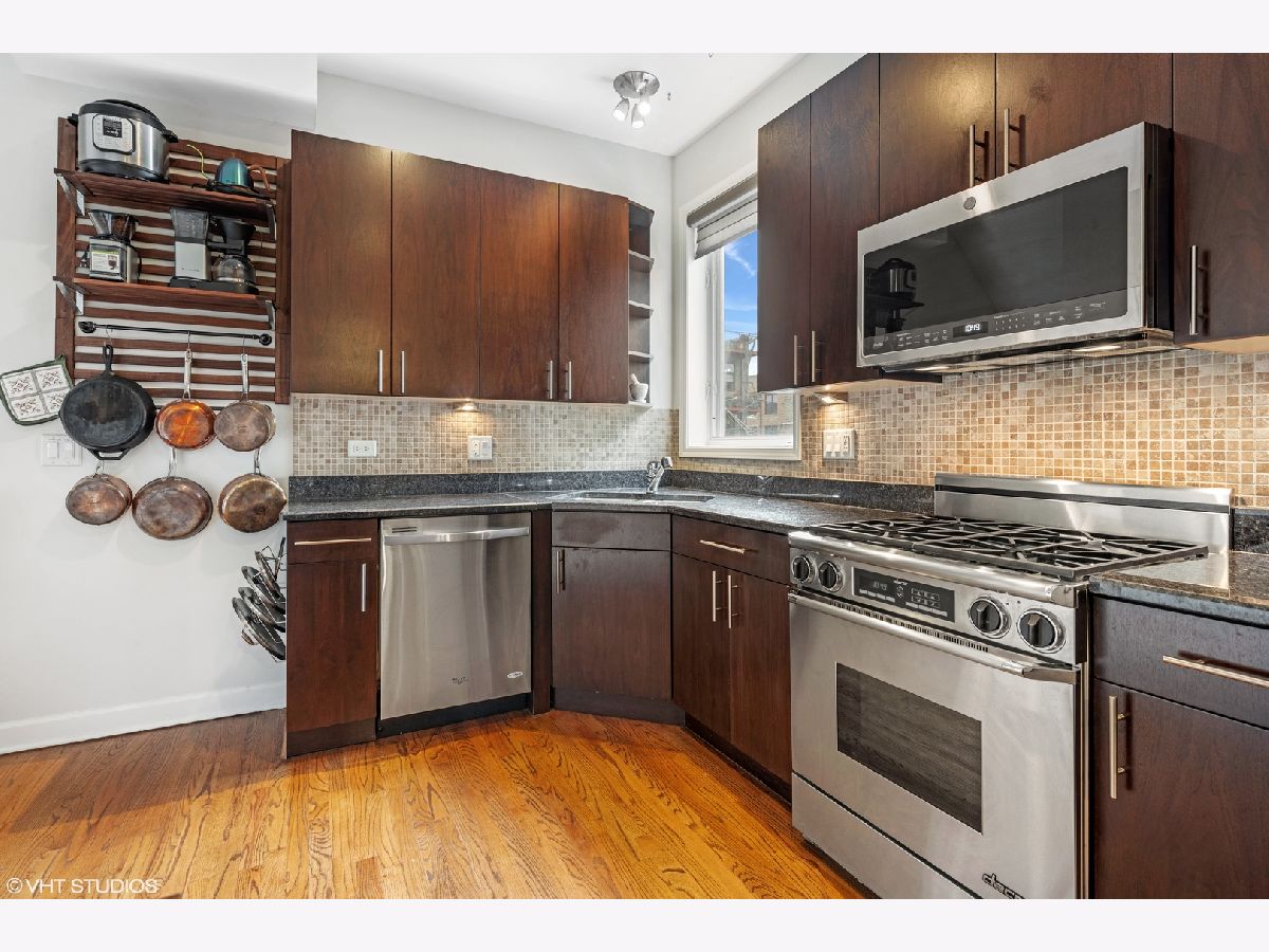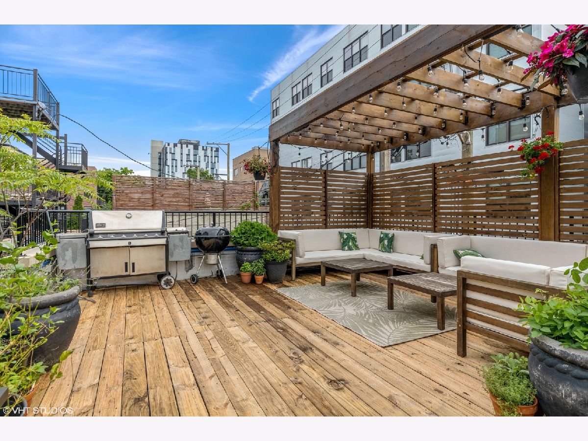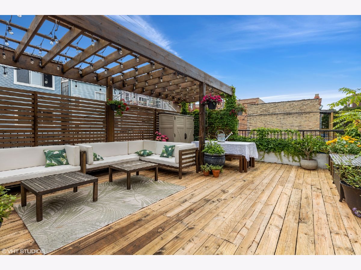 CHICAGO'S HOTTEST LOCATION!!! Wicker Park and East Village. Come check out this beautiful 2BED/2BATH duplex with a massive EXCLUSIVE 400+ square foot private garage roof deck. It comes equipped with gas line, power and a weather proofed wifi extender!! Plus separate 18 foot wide balcony off master bedroom. Walnut stained hardwood floors throughout, Espresso kitchen cabinets, stainless steel appliances, under cabinet lighting, tumbled mosaic back splash. The living room has vent less gas fireplace, and custom made bookshelves. The Master bath is a true joy with a steam shower, rain shower head plus multiple body sprays. Tank less hot water tank, wired for sound with multiple speakers. 100% owner occupied HOA, garage parking included, 1.5 blocks to Blue line.